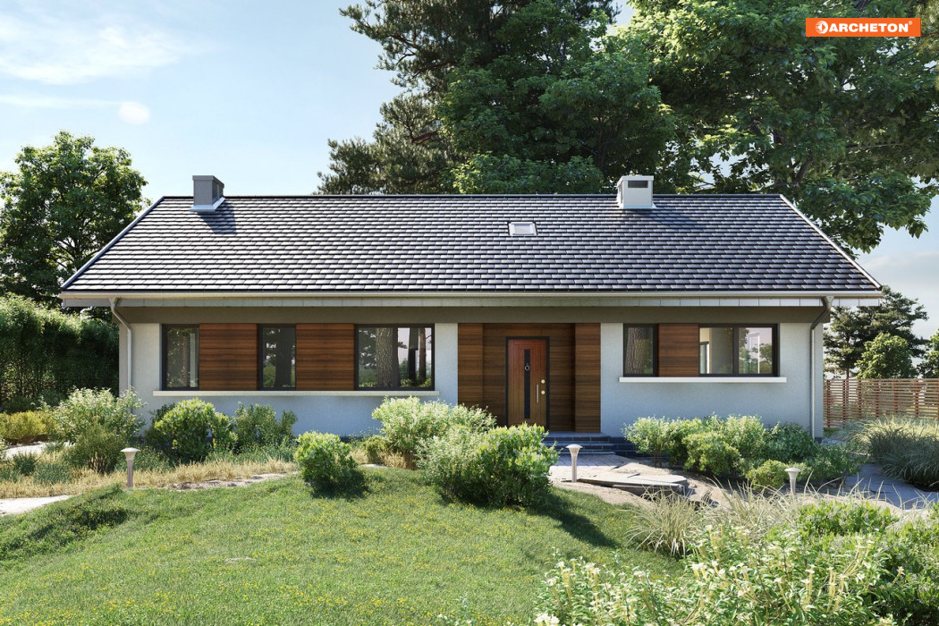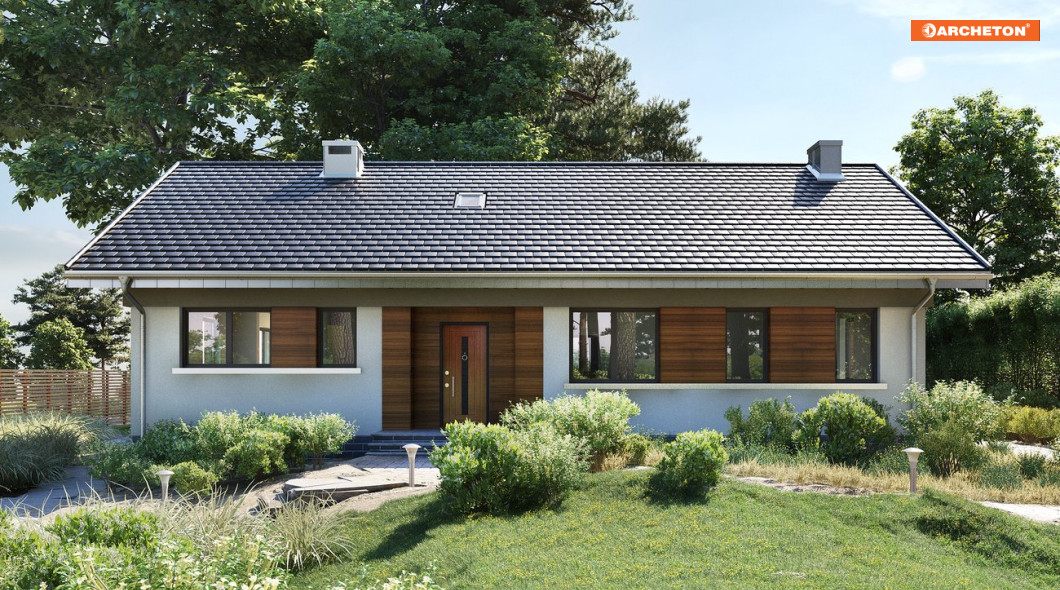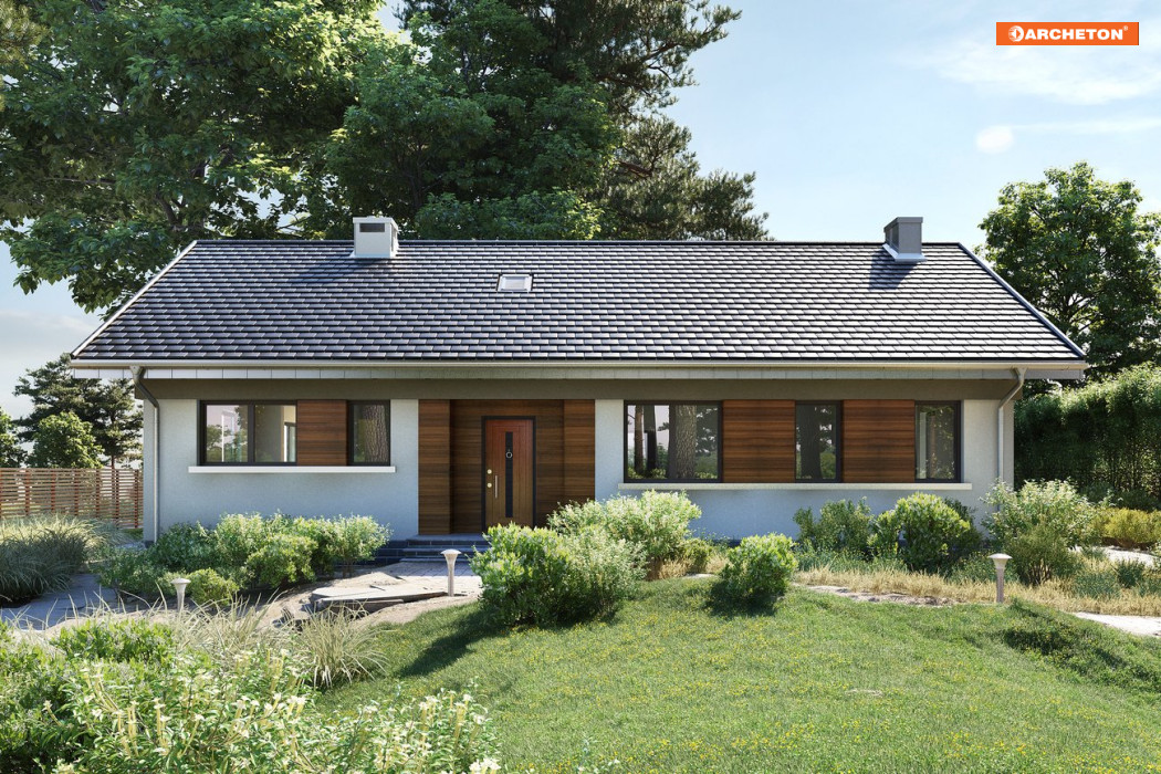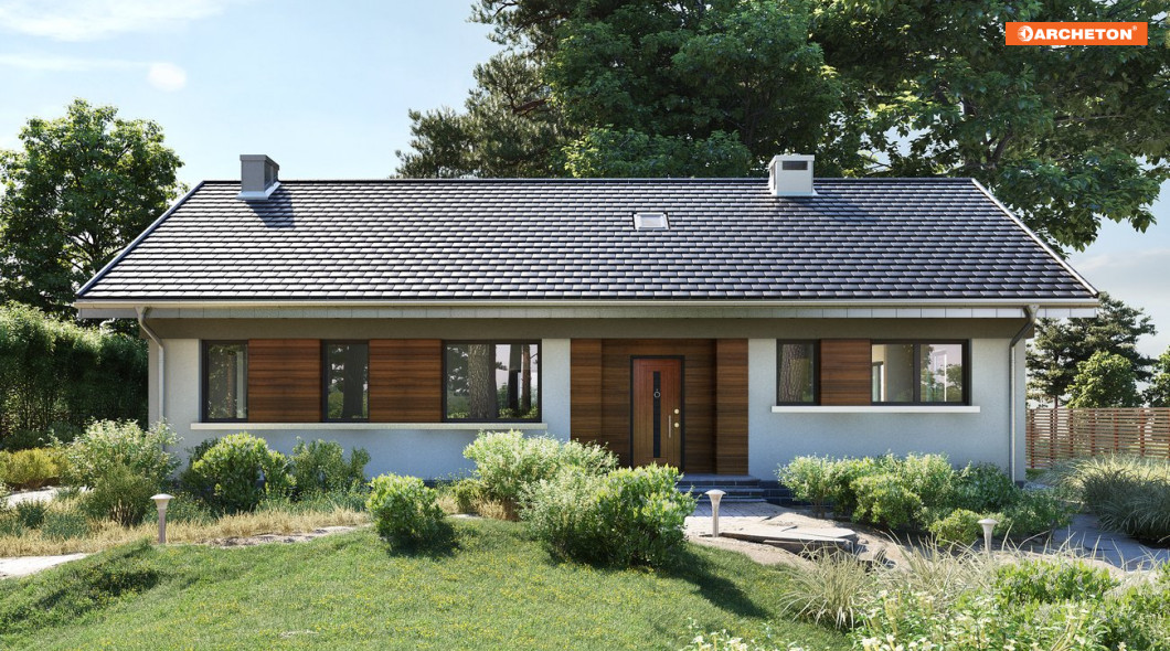 Nawet mały dom parterowy, zaprojektowany na planie zwartego prostokąta nie uniknie wydłużonych proporcji, zwłaszcza przy dwuspadowym dachu. Projekt domu Milan Rex jest taką właśnie propozycją, wersją Milana, bez garażu. Jak w Milanie, plan dzieli wzdłuż, na połowy, ściana nośna. Ten układ konstrukcyjny sprawia, że duża kuchnia, choć otwarta i dostępna dodatkowo z sieni przez przechodnią spiżarnię, jest wyraźnie wydzielona ze strefy dziennej. Łatwo ją w pełni odseparować od wyjątkowo dużego salonu z kominkiem. Poprzedzającą go, wygodną strefę wejścia zamyka z boku przedpokój części prywatnej. Jest tu miejsce na trzy sypialnie, dużą łazienkę i kotłownię z pralnią. Gabaryty i kąt nachylenia dachu Milana tworzą warunki do wykorzystania poddasza. Po zaadaptowaniu jednego z pokoi na klatkę schodową, można uzyskać dostęp do powierzchni użytkowej ok. 40m2, ale o maksymalnej wysokości przekraczającej tylko nieznacznie 2m. Projekt domu Milan Rex ma swobodny i dostosowany do optymalnego doświetlenia pomieszczeń układ okien i rysunek elewacji. Dla uporządkowania kompozycji zaproponowano w wizualizacji pasy drewnianej boazerii.