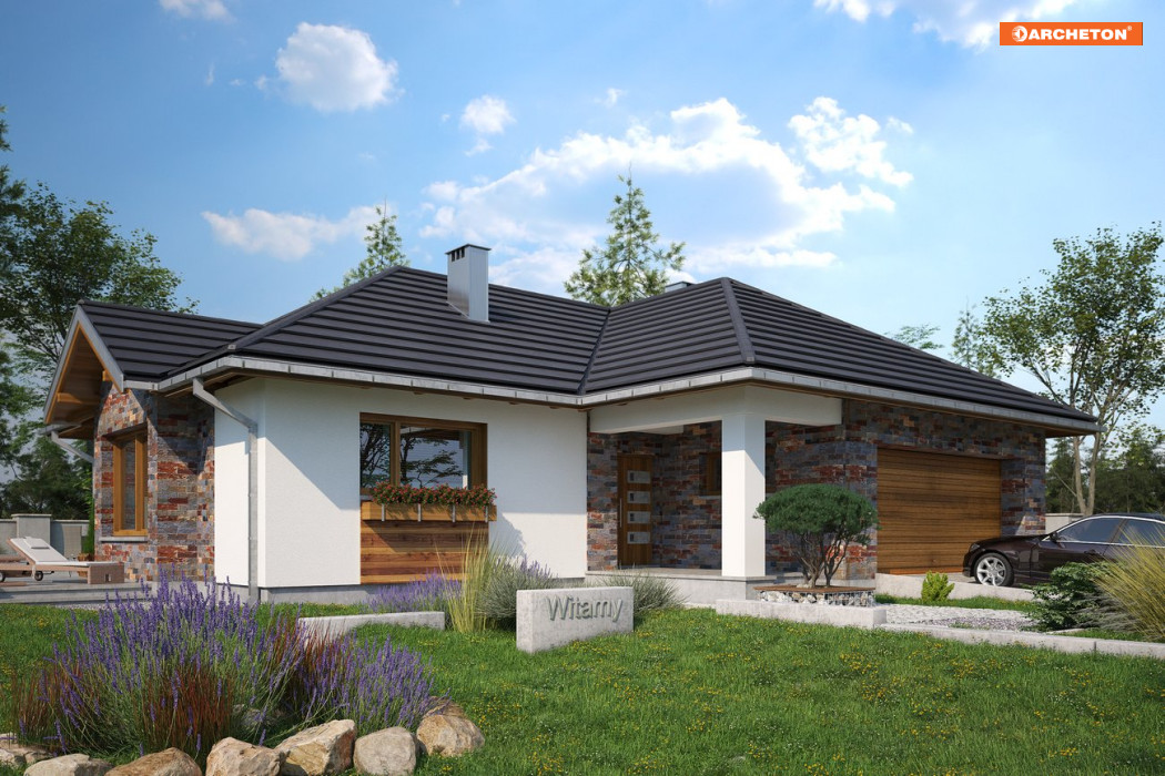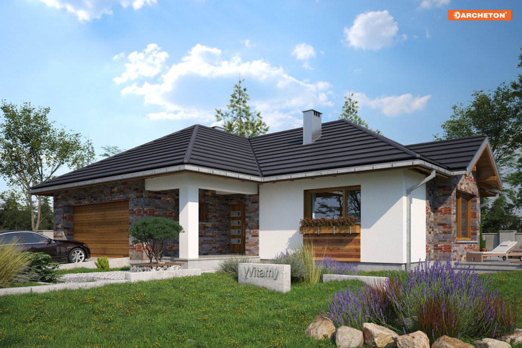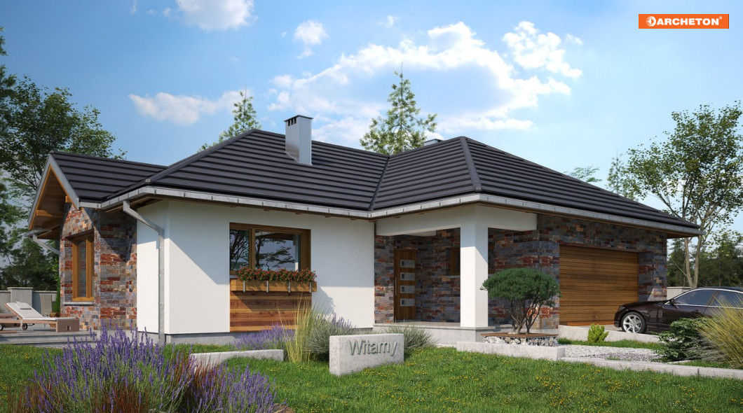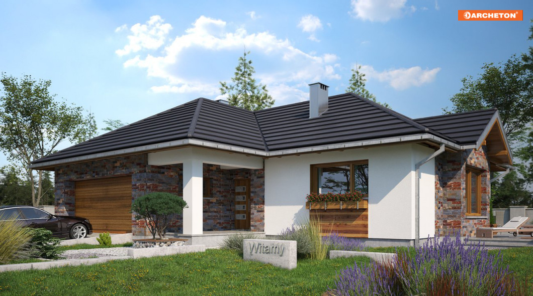 Jeśli działka jest rozległa, a dom ma mieć dwustanowiskowy garaż, to projekt domu Aurelia Polo będzie idealny. Rozłożysty budynek w pełni wykorzysta zalety dużej przestrzeni. Układ funkcjonalny na planie zbliżonym w kształcie do litery T, przekryto czterospadowymi, przenikającymi się dachami. Wersja Polo ma najbardziej strome połacie w rodzinie Aurelii, jest średnia pod względem wielkości i, jako jedyna, proponuje głęboki, narożny podcień wejściowy przy bramie wjazdowej. Dalej, za sienią, otwarty hol oddziela część dzienną od przedpokoju strefy prywatnej, złożonej z trzech sypialni, łazienki i gabinetu. Pokój dzienny to jednoprzestrzenne wnętrze salonu, jadalni zaakcentowanej ryzalitem i kuchni ze spiżarnią. Szczególnie atrakcyjny jest układ głównej sypialni wyposażonej w osobną garderobę i pokój kąpielowy. Ma własne wyjście na taras, który, dzięki szerokiemu przesuwnemu przeszkleniu, jest latem częścią pokoju dziennego. Wygodny zespół pomieszczeń gospodarczych przy garażu ma osobne wejście, umożliwiające segregację ruchu. Wszystko to sprawia, że projekt domu Aurelia Polo, mimo średniej wielkości, ma charakter mini rezydencji.