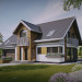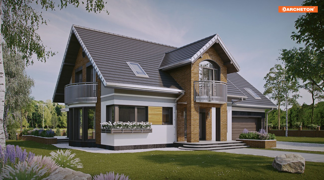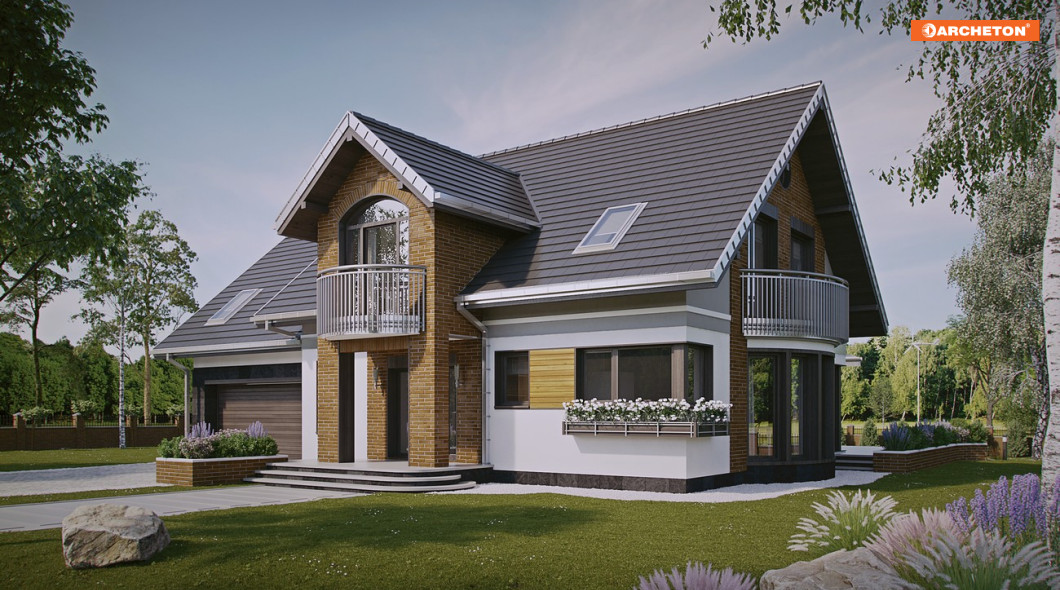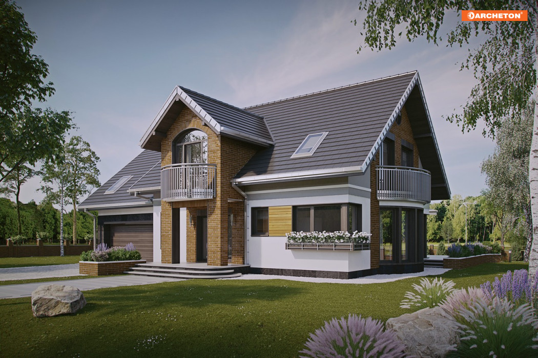 Duże przeszklenia o różnej formie pojawiają się we wszystkich współczesnych trendach architektury domów jednorodzinnych. Projekt dużego domu Herbert, podobnie jak Heliodor i Heliasz, jest tradycyjny w sylwetce ale detal półkolistego ryzalitu ze szkła i narożne okna w części dziennej to już popis nowoczesności. Powstała nie tylko efektowna bryła, ale też pełne światła wnętrze, otwarte na otoczenie, ze strefą wspólną dla rodziny. Użytkowe poddasze mieści przestronną łazienkę z pralnią i 4 duże sypialnie z balkonami. Główna – dwuosobowa, jest ustronnie oddzielona różnicą poziomów od pozostałych i wyposażona we własną łazienkę i garderobę. Dwuspadowe dachy przekrywają osobno: część mieszkalną i niższą, z dwustanowiskowym garażem i z kotłownią. Projekt domu Herbert proponuje, inaczej niż w Heliodorze i Heliaszu, dwubiegową klatkę schodową ze schowkiem przy ścianie zewnętrznej. Taki układ upraszcza doprojektowanie zejścia do piwnic. Bardziej otwarty na kuchnię salon oraz gabinet są wyraźniej oddzielone od holu bryłą kominka. Pokoju dziennego nie pomniejsza wnęka z tarasem, jak w Heliodorze, a wejście główne osłania lukarna na słupach – jak w Heliaszu.