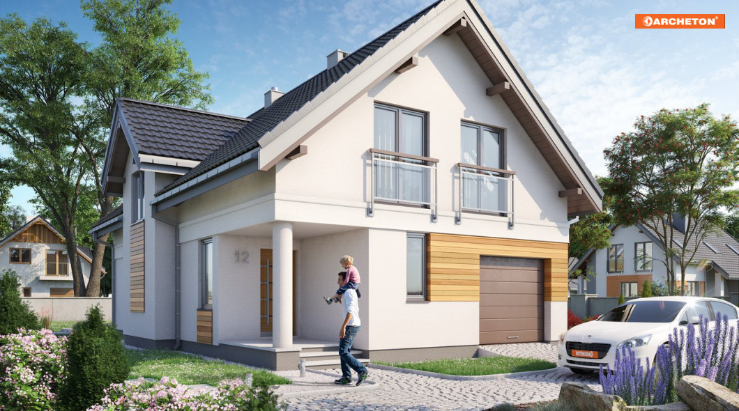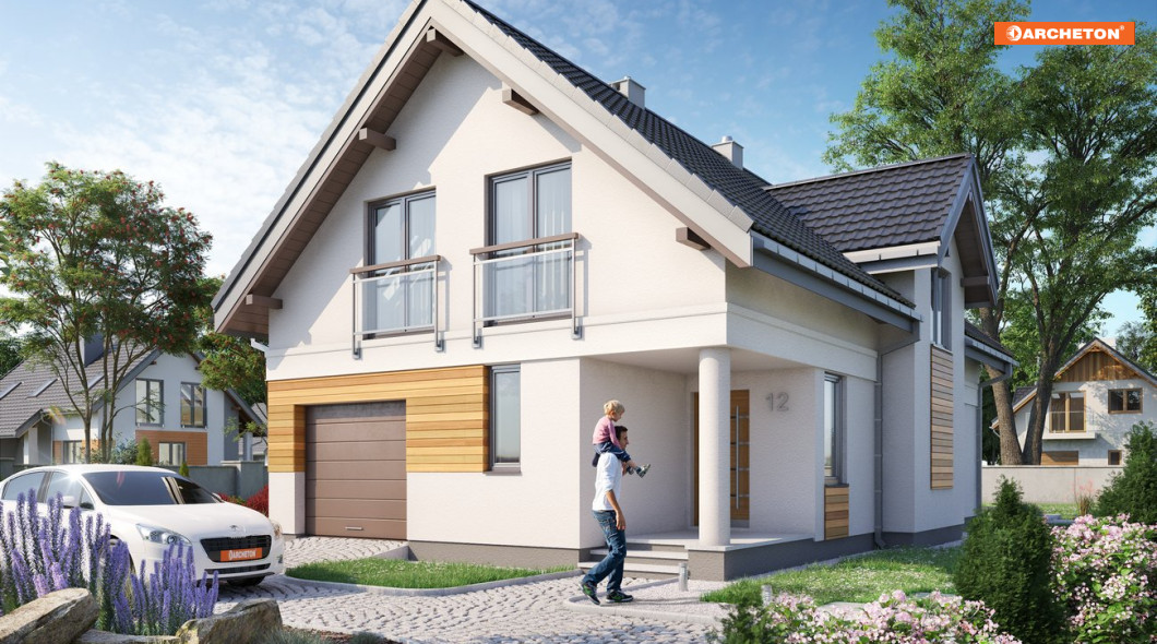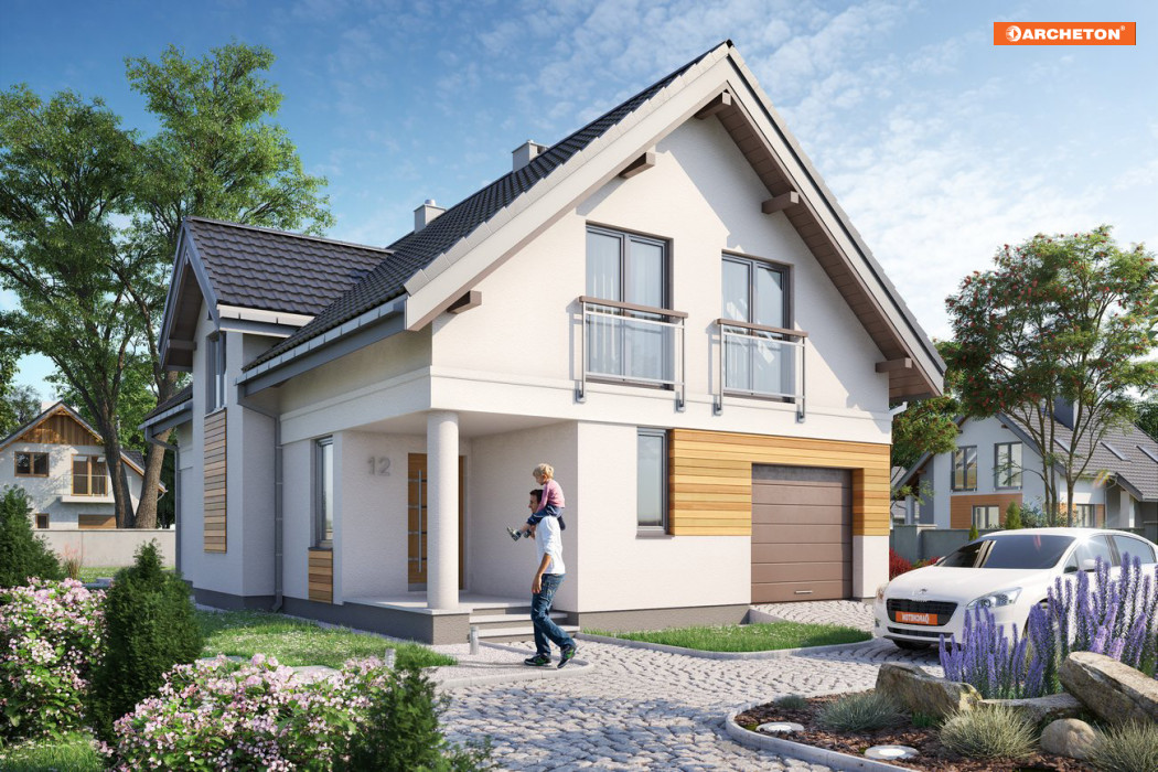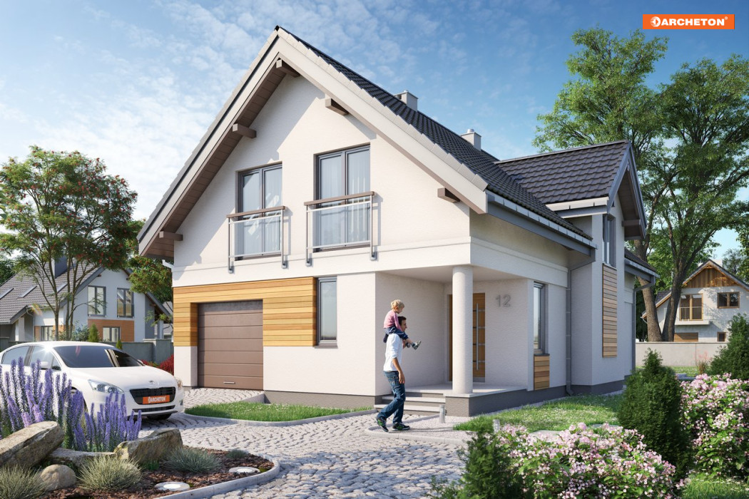 Po Lobelii, Lorenie i Lucku, projekt domu Elf rozszerza wachlarz rozwiązań niedużych, prostych domów z użytkowym poddaszem na wąska działkę, z wbudowanym garażem i z dwuspadowym dachem skierowanym do wjazdu szczytem. Jest nieco szerszy od nich i dysponuje wyjątkowo przestronną kotłownią przy garażu wysuniętym ku frontowi działki. Wyróżnia go też trójbiegowy, komfortowy kształt klatki schodowej oraz rozkład parteru, który, mimo otwartego charakteru, wyraźnie wydziela kuchnię, jadalnię i salon, a nawet pozwala je zamknąć. Poddasze w projekcie domu Elf jest również bardziej przestronne niż w podobnych rozwiązaniach: 4 sypialnie dla 5 osób są szersze i dysponują miejscem na wygodne, długie wbudowane szafy. Program strefy nocnej uzupełnia pralnia i duża łazienka, która, podobnie jak schody poszerzone ryzalitem, oświetlona jest tradycyjnym oknem. Lukarny przełamują prostą formę dachu i razem z narożnymi podcieniami tarasów przy wejściu oraz przy salonie urozmaicają zdyscyplinowane, gładkie, pozbawione balkonów elewacje Elfa.