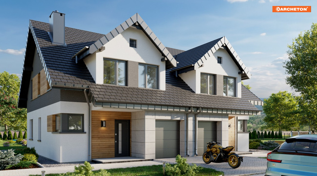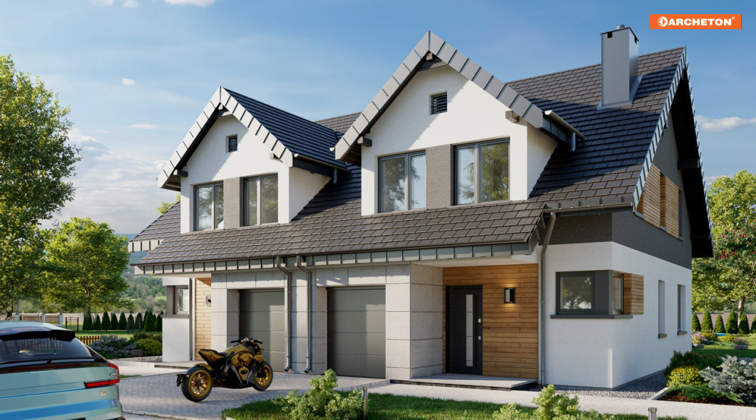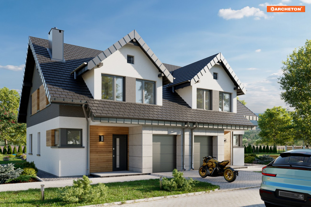 Projekty z Rodziny Lili to ekonomiczne propozycje do zabudowy bliźniaczej. Przy powierzchni użytkowej ok.100m2, oferują mieszkanie dla pięcioosobowej rodziny z wbudowanym garażem. Część dzienna rozciąga się jedynie na tyłach domu, dzięki czemu od frontu, oprócz wjazdu do garażu, osobne pomieszczenia mogły zająć kotłownia i mała łazienka. Głębiej, naprzeciwko schodów, znalazła się otwarta kuchnia, a po obu stronach szerokiego wyjścia na taras - salon z jadalnią. Na poddaszu zmieściły się aż cztery sypialnie z dużą łazienką. Projekt domu Lila 2 Duo ma, podobnie jak pozostałe wersje, zwarty, wydłużony rzut ale bardziej tradycyjną sylwetkę niż Lila Duo. Zamiast balkonu, wejście frontowe osłania przedłużony okap wsparty częściowo na wjazdowej części garażu. Lukarny po obu stronach dwuspadowego dachu zostały również przekryte stromymi połaciami, inaczej niż w nawiązującej do modernizmu Lili Duo. Projekt domu Lila 2 Duo może być wykorzystana jako pojedynczy segment do zabudowy w granicy działki lub na bardzo wąskiej parceli (nawet mniej niż 13,5m w niektórych lokalizacjach). Odróżnia ją to od wariantu Duolit, który obejmuje dwa lustrzane segmenty.