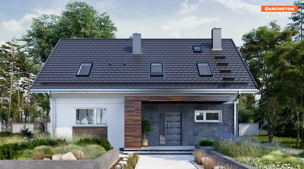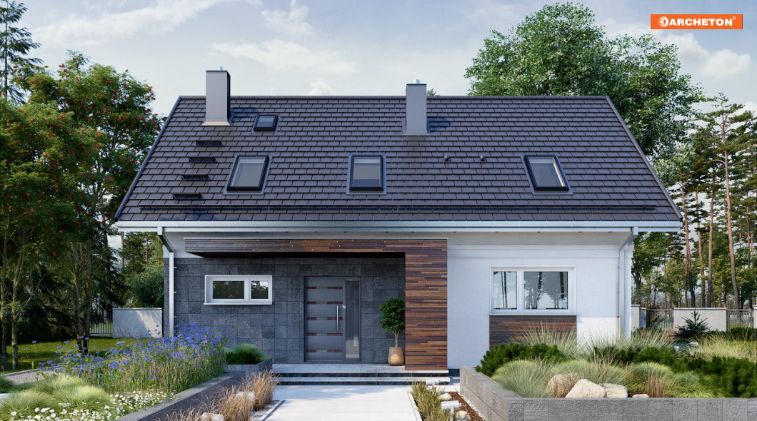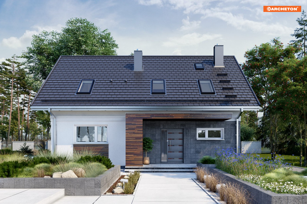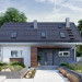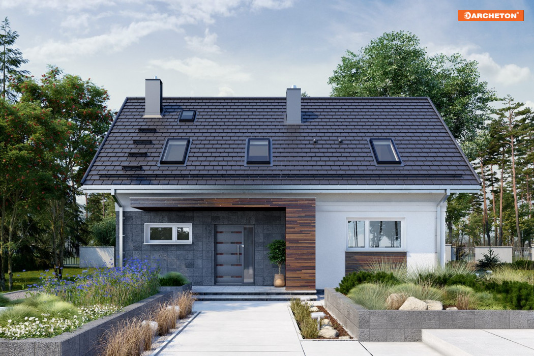 Projekt domu Olaf Solo ma, obok Pączka, najprostszą bryłę z dwuspadowym dachem o kalenicy równoległej do drogi dojazdowej w grupie domów parterowych z użytkowym poddaszem, bez garażu i powierzchni ok. 110m2. Wyróżnia go też jednoprzestrzenna strefa dzienna otwarta na hol, wygodna kotłownia i praktyczny schowek pod schodami. Tak jak w Pączku nie zabrakło też miejsca na spiżarnię przy kuchni ale ulokowano ją odmiennie - od strony sieni. Dodatkowy pokój na parterze pozwala na zaaranżowanie pełnego mieszkania i rozłożenie inwestycji w czasie. Poddasze, które może zostać wykończone w drugim etapie, to trzy ustawne sypialnie doświetlone ekonomicznie bez użycia lukarn, wyposażone w przemyślany układ ściennych szaf oraz przestronna łazienka. Inaczej niż w nieco krótszej ale szerszej bryle projektu domu Pączek, proporcje rzutu pozwoliły w Olafie na wydzielenie osobnej pralni. Projekt domu Olaf Solo nie ma balkonów, co dopełnia energooszczędnej koncepcji budynku. Frontowe wejście zaakcentowano daszkiem w formie płyty, a od ogrodu uwagę przykuwają szerokie, rozsuwane drzwi na taras i propozycja pergoli. Rozwiązanie z garażem oferuje wersja projektu domu Olaf.