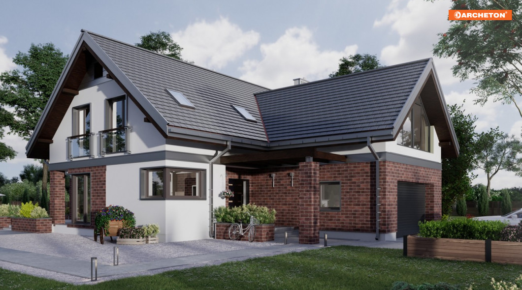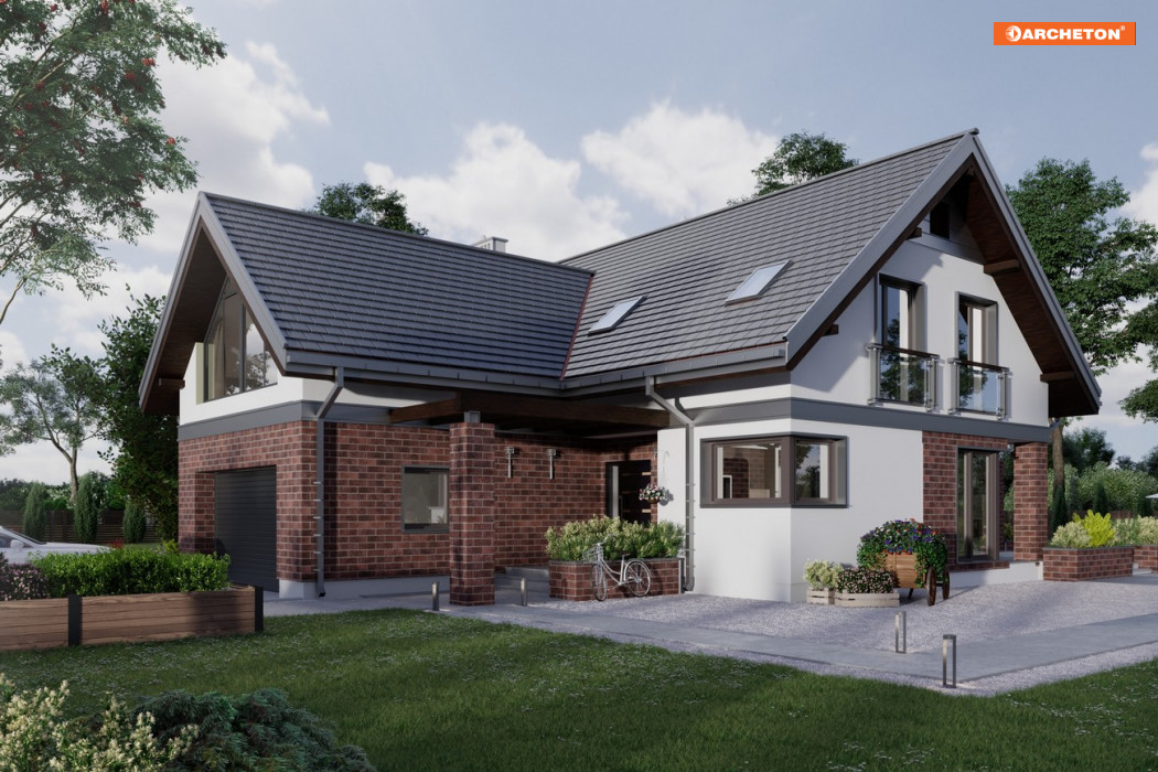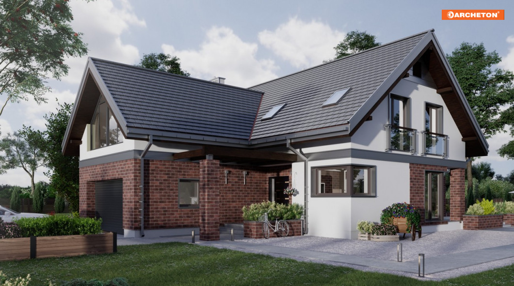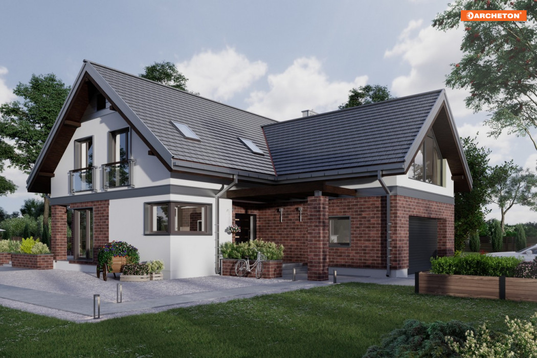 Projekty średniej i dużej wielkości domów parterowych z użytkowym poddaszem z rodziny Zenona zwracają uwagę kompozycją bryły, zbudowanej na planie litery L. Dwuspadowy dach z kalenicą równoległą do drogi dojazdowej zamyka część mieszkalną, a pod okap wsunięta jest od frontu parterowa, płaska kostka z podwójnym garażem. Projekt domu Zenon As wyróżnia się w rodzinie tradycyjnym dwuspadowym przekryciem obu części budynku. Ma średnią powierzchnię oraz jednopoziomowe poddasze główne, jak wersja Polo. Pokój dzienny otwiera się tuż za wyjątkowo obszerną sienią, a na parterze, podobnie jak w całej rodzinie, przewidziano też: kuchnię z mini-spiżarnią, dodatkowy pokój z łazienką na uboczu i kotłownię, dostępną z mieszkania. Cztery duże sypialnie na poddaszu mają do dyspozycji dwie łazienki, w tym jedną dla głównej sypialni. Projekt domu Zenon As nie proponuje tarasu nad garażem, a jego miejsce zajmuje przestronny, dobrze oświetlony dużym przeszkleniem strych z wejściem na półpiętrze. Narożne okna i geometryczne podziały elewacji rozwiązano w sposób charakterystyczny dla całej rodziny Zenona, dodając nowocześnie skonstruowane pergole nad tarasami