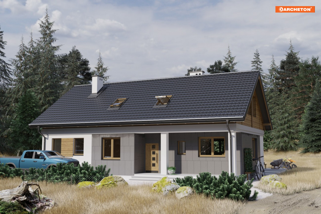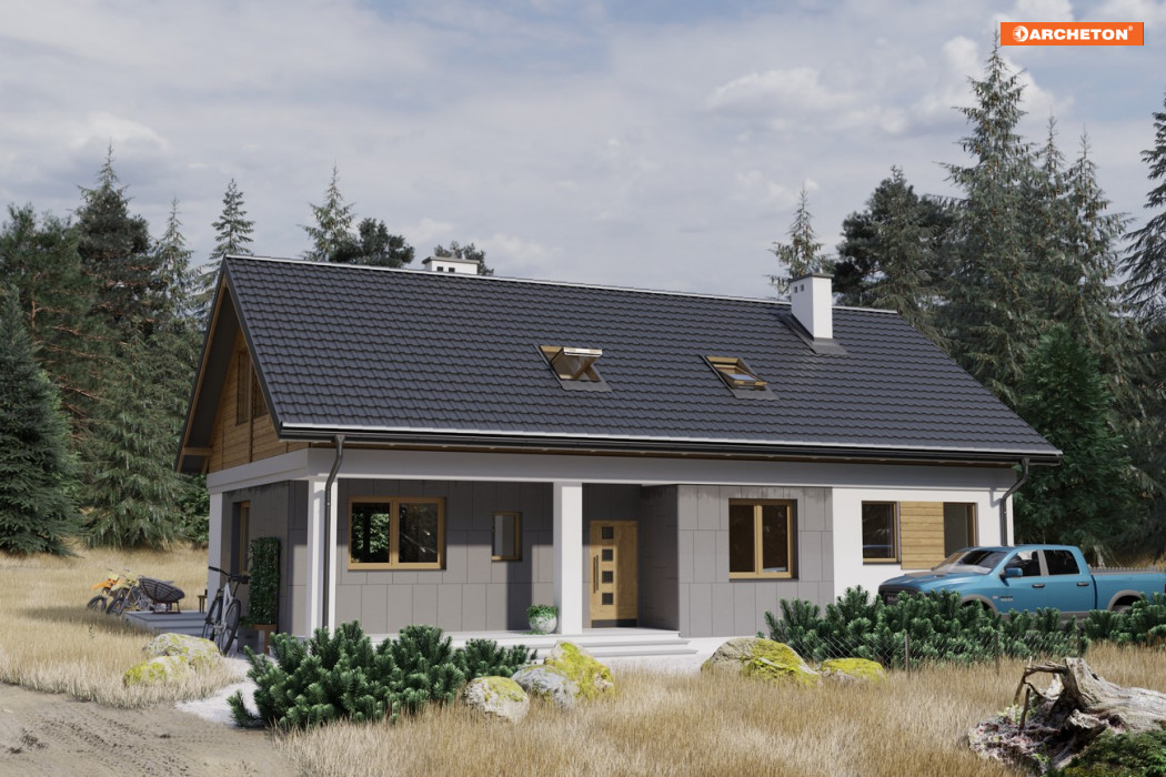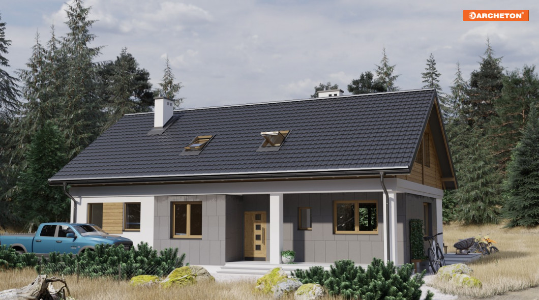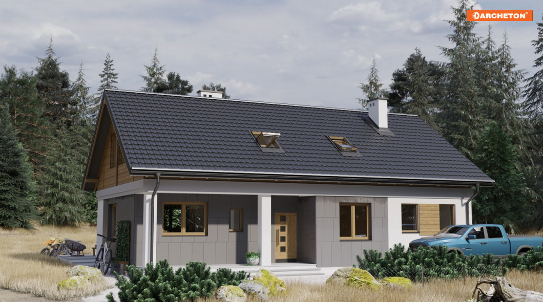 Rodzina Modrzyka grupuje niewielkie parterowe domy bez garażu o przyjaznej naturalnemu krajobrazowi, niskiej, tradycyjnej bryle. Wśród innych propozycji z dwuspadowym dachem i prostokątnym rzutem wszystkie warianty Modrzyka wyróżnia wejściowa, podłużna weranda w narożniku oraz dużo miejsca dla funkcji gospodarczych. Projekt domu Modrzyk Max jest największy i oferuje wygodne mieszkanie dla 6-7 osób. Wyjątkowo w rodzinie, dzięki oszczędnym schodom z salonu, wykorzystuje poddasze, choć kąt nachylenia połaci wzrósł tylko o 5º. Na parterze rozlokowano otwarty na hol pokój dzienny z kuchnią, trzy sypialnie, łazienkę i kotłownię z osobnym wejściem z zewnątrz. Okna dachowe nadają wnętrzu salonu niezwykły urok, a przestronna antresola poddasza z dwoma dalszymi sypialniami i łazienką jest bardzo jasna. Prosta architektura daje dużą swobodę w najlepszym zharmonizowaniu bryły z konkretnym otoczeniem. Projekt domu Modrzyk Max ma gładkie elewacje bez balkonów i przy zachowaniu gabarytów oraz charakteru pokrewnych, parterowych wersji jest jednocześnie najprostszym rozwiązaniem wśród projektów domów z użytkowym poddaszem średniej wielkości bez garażu.