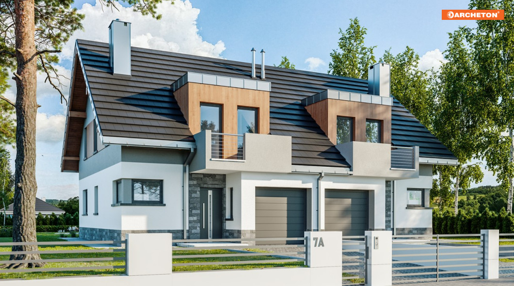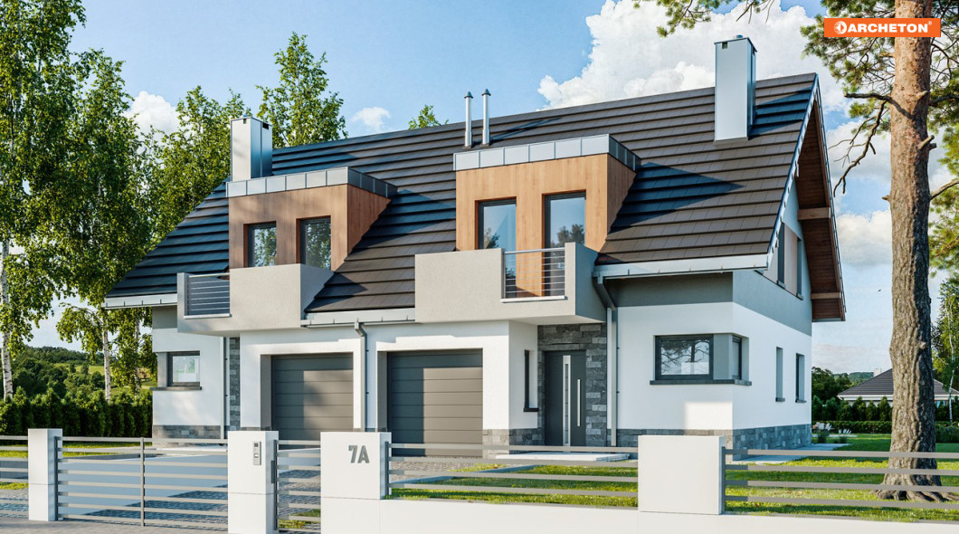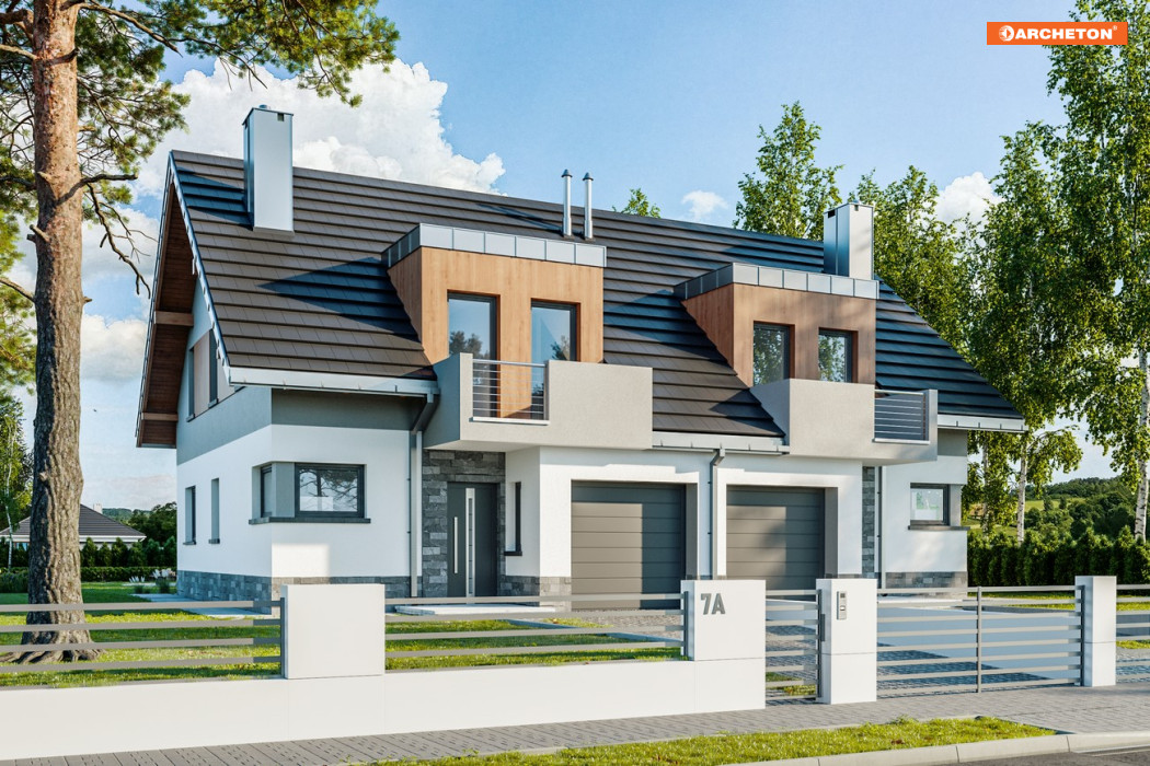 Projekt domu Lila Duolit to rozwiązanie budynku jednorodzinnego z dwoma lokalami należące do najoszczędniejszych w gospodarowaniu przestrzenią mieszkalną i miejscem na niezbyt szerokiej działce. Oferuje 95,8m2 powierzchni użytkowej dla dwóch pięcioosobowych rodzin oraz wbudowane garaże. Część dzienna rozciąga się nie przez cały trakt, a jedynie na tyłach domu. Dzięki temu od frontu, oprócz wjazdu do garażu, osobne pomieszczenia mogły zająć kotłownia i łazienka. Głębiej, naprzeciwko schodów, znalazła się otwarta kuchnia, a po obu stronach wyjścia na taras - salon z jadalnią. Na poddaszu zmieściły się aż cztery sypialnie z dużą łazienką. Projekt domu Lila Duolit ma zwarty rzut i nowoczesną sylwetkę z ciekawymi wejściami do budynku. Osłaniają je balkony wsparte na wjazdowych częściach garaży, przekrytych dalej pełną głębokością opuszczonego okapu. Powstałe w ten sposób wnęki zapewniają prywatność użytkownikom lustrzanych lokali. W podobnie praktyczny sposób wykorzystano balkony sypialni od ogrodu, które chronią przed słońcem i opadami duże przeszklenia pokoi dziennych. Dwuspadowy dach urozmaicają w obu połaciach płasko przekryte lukarny.