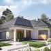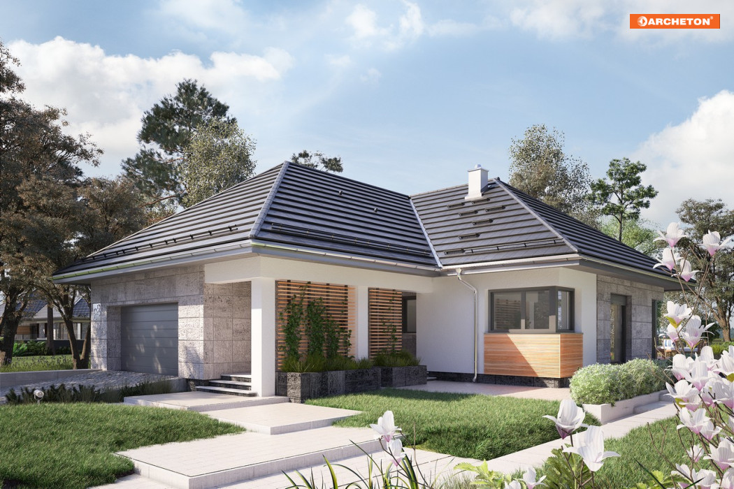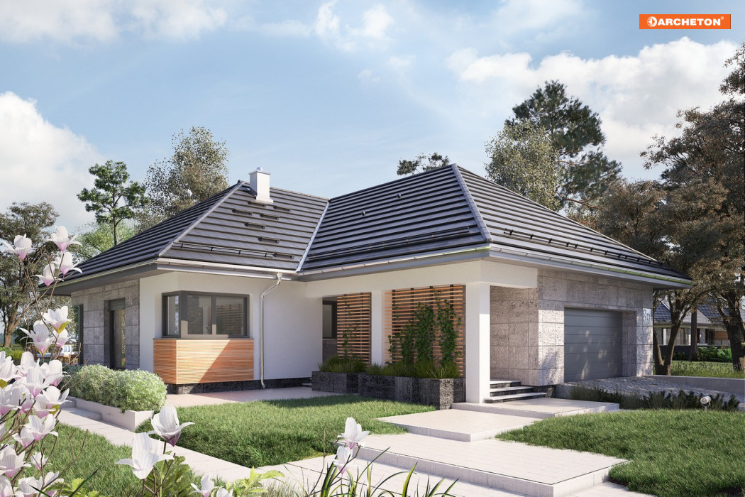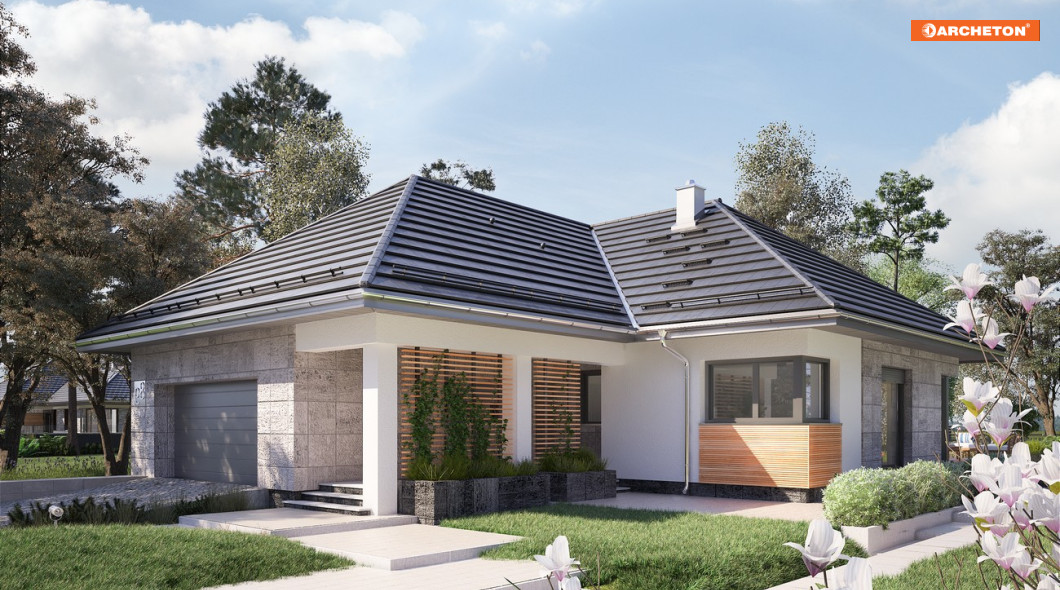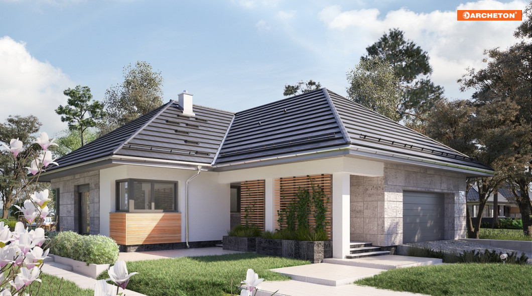 Rodzina Aurelii to średnie i duże parterowe domy o rozbudowanym planie i takim samym zasadniczym układzie funkcjonalnym. W projekcie domu Aurelia Bona zaproponowano bardziej zdyscyplinowany zarys ścian zewnętrznych w kształcie litery T oraz najbardziej nachylone połacie przenikających się czterospadowych dachów. Jest to średniej wielkości wariant, zbliżony powierzchnią do Aurelii Polo. Frontowy taras w wydłużonym podcieniu dachu głównego, jak w pozostałych wersjach, osłania wysunięty ku wjazdowi na posesję podwójny garaż. Wejście do mieszkania znalazło się w ścianie części gospodarczej, gdzie pokazano możliwość połączenia pralni i kotłowni w jedno większe pomieszczenie. W środku rozbudowanego rzutu otwarty hol oddziela część dzienną od przedpokoju strefy prywatnej, złożonej z czterech sypialni i dwóch łazienek. Pokój dzienny to jedno wnętrze z jadalnią ale zamiast ryzalitu z wyjściem do ogrodu zaproponowano duże narożne okna w kuchni i salonie. Taras ogrodowy znalazł się na tyłach działki i nie jest dostępny z części prywatnej domu jak w innych wersjach. Projekt domu Aurelia Atu wymaga najwęższej ale jednocześnie bardziej wydłużonej działki.