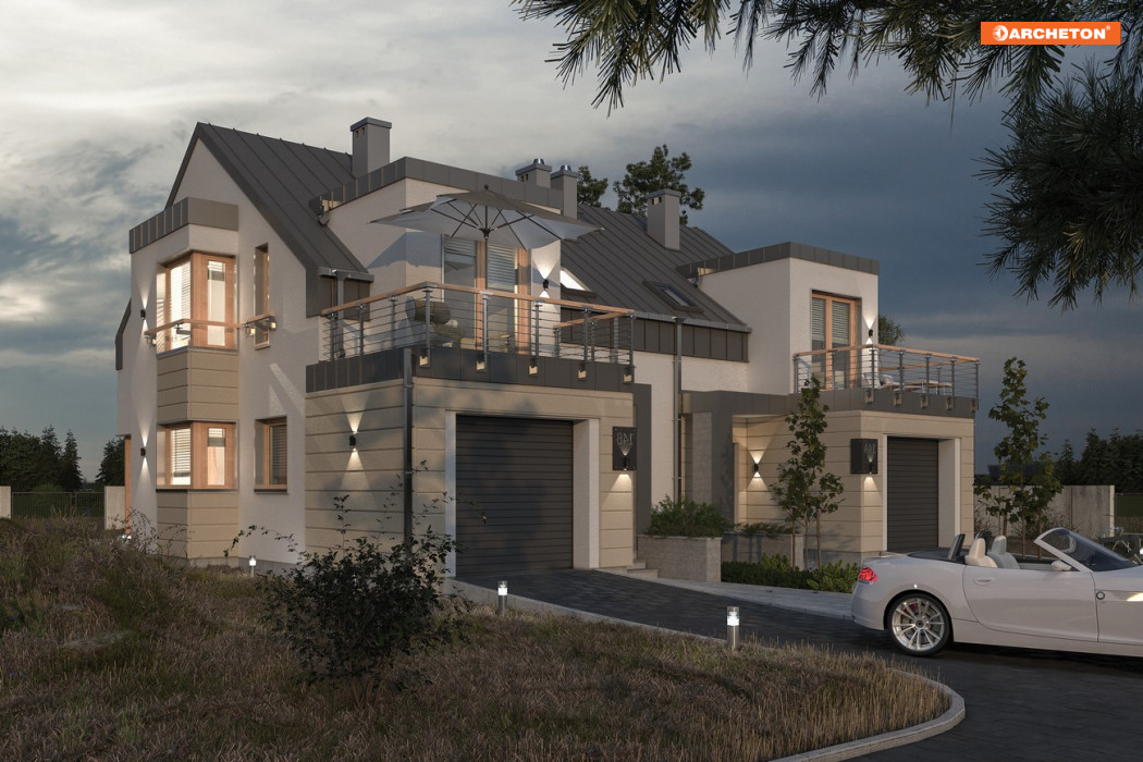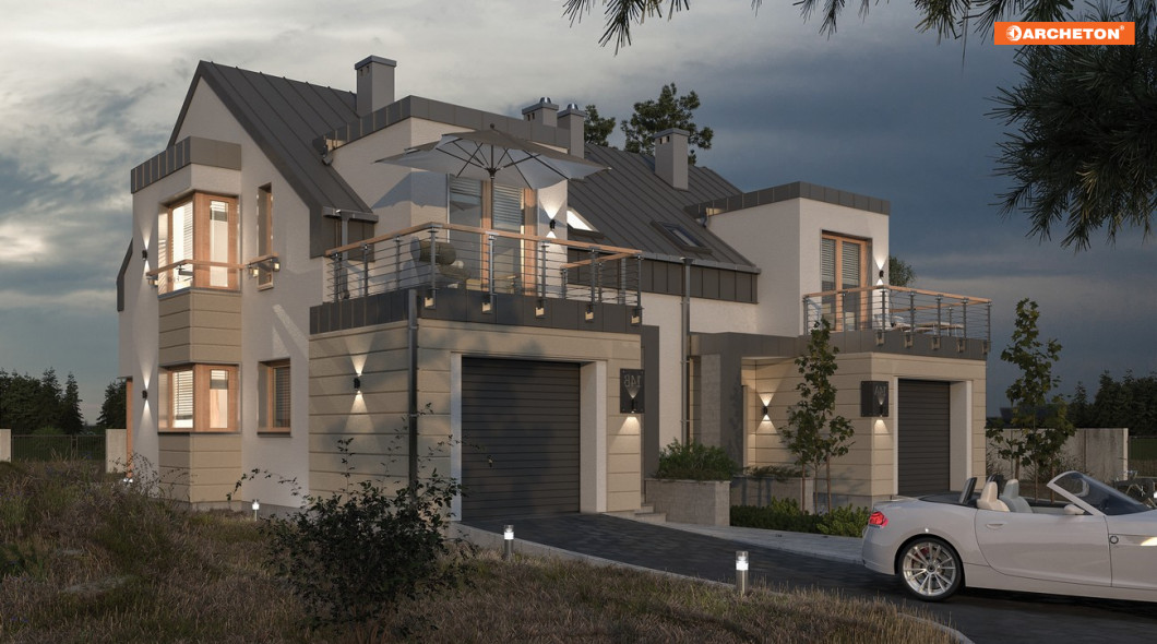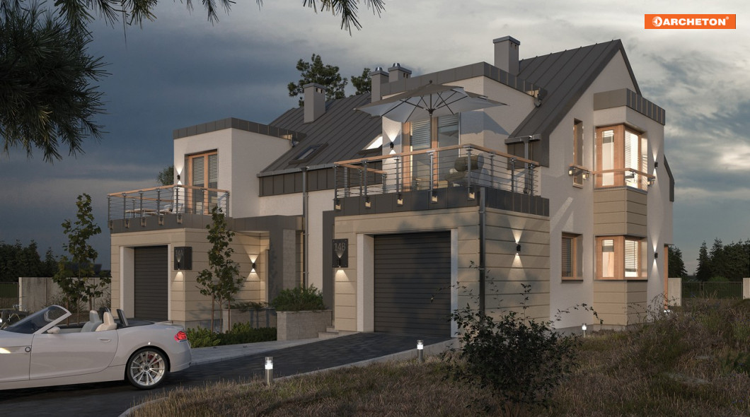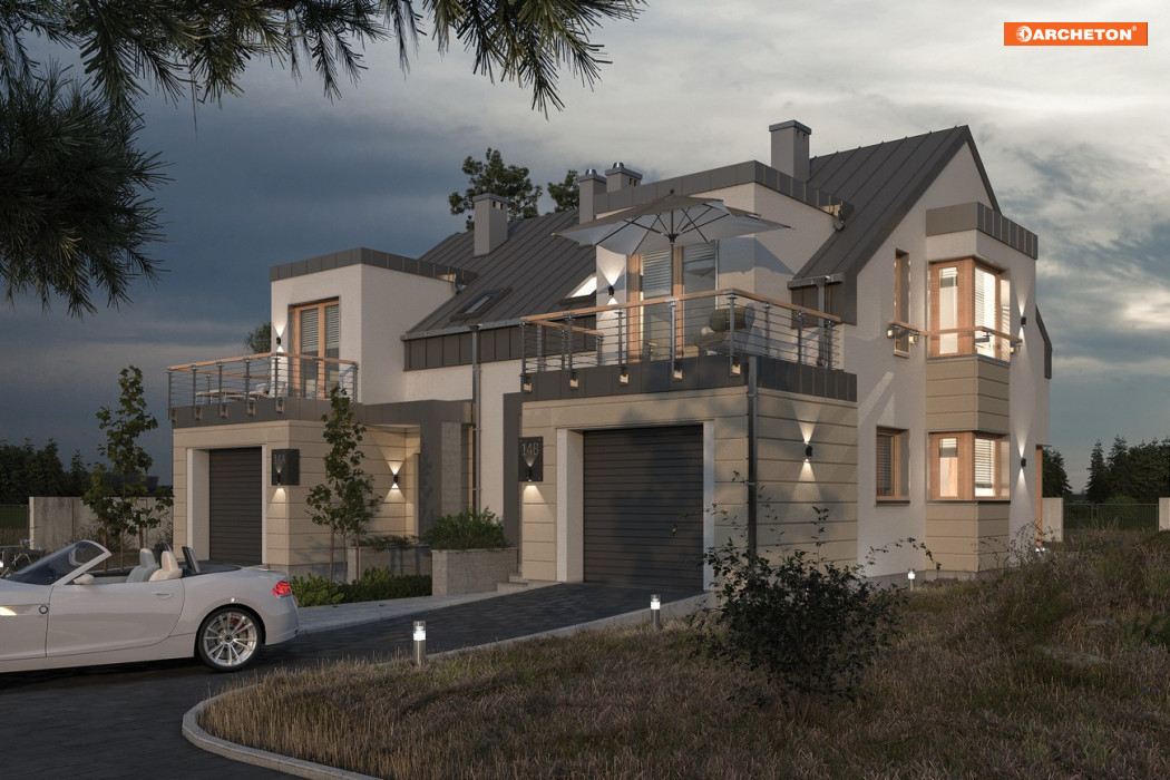 Grupa bliźniaków, do których należy projekt domu Morela Duo, jest najoszczędniejsza w gospodarowaniu przestrzenią, na najwęższych działkach. Ten parterowy dom z użytkowym poddaszem oferuje mieszkanie dla czteroosobowej rodziny z wbudowanym częściowo garażem na najbardziej wydłużonym planie wśród propozycji o powierzchni 100-110m2. Strefa dzienna mieszkania znajduje się na tyłach domu, a od frontu ulokowano wjazd i wejście. Kocioł gazowy jest w łazience. Głębiej, naprzeciwko schodów, znalazła się otwarta na pokój dzienny kuchnia, powiększona ryzalitem z narożnym oknem, które poszerza wgląd na otoczenie domu. Salon składa się z części jadalnianej i rekreacyjnej. Pod dwuspadowym dachem o kalenicy równoległej do drogi dojazdowej zmieściły się trzy sypialnie z łazienką. Każda ma oryginalny kształt: dwie od frontu i od ogrodu dzięki płasko przekrytym lukarnom z wyjściami na balkony, a najmniejsza z nich - za sprawą narożnego okna ryzalitu. W projekcie domu Morela Duo część garażowa, inaczej niż zwykle, nie przylega do granicy, co w połączeniu z elementami rozbudowującymi bryłę i z pudełkową stylistyką tworzy efekt malarski i nowoczesny jednocześnie.