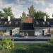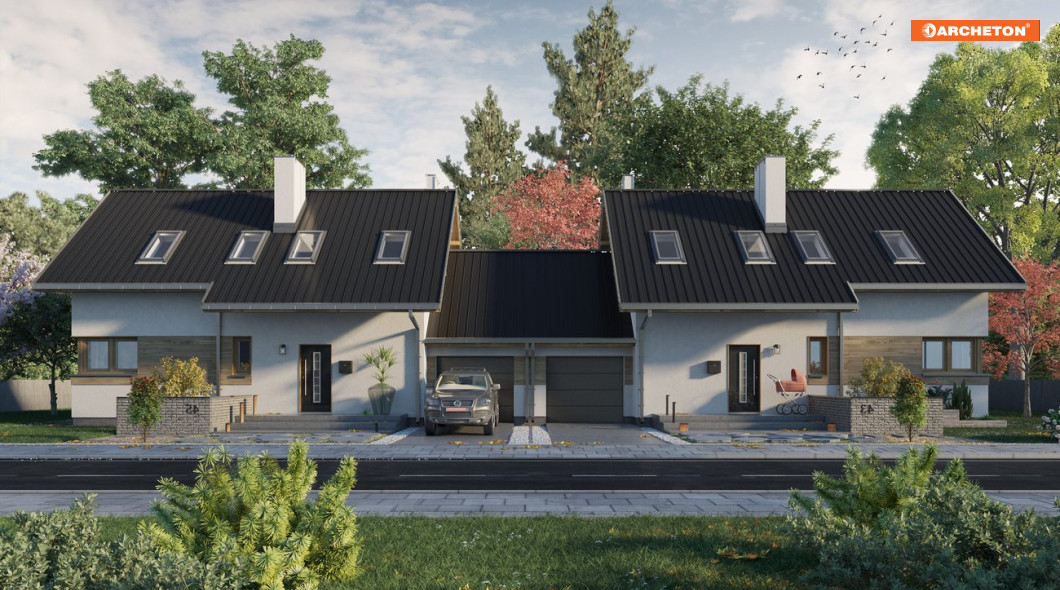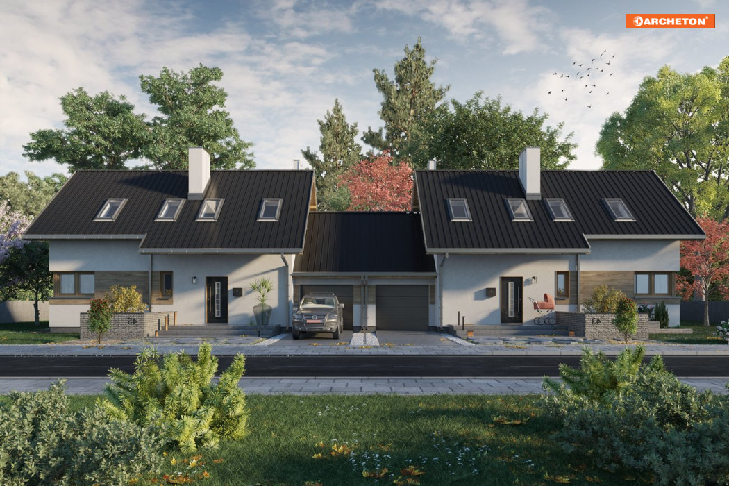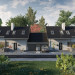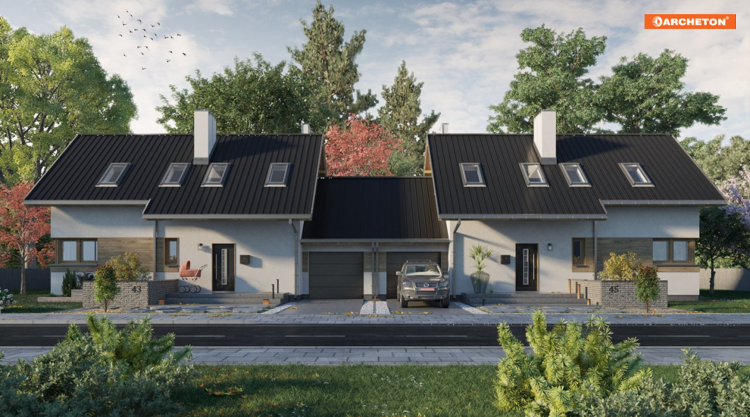 Na płytkich, szerokich działkach do zabudowy bliźniaczej (i nie tylko) sprawdzi się projekt domu Dino Duo. Proponuje niewielki, zwarty budynek z najprostszym dwuspadowym dachem o kalenicy równoległej do drogi dojazdowej. Garaż przy ścianie bocznej nie jest powiązany z wnętrzem domu, co ułatwia rezygnację z niego w adaptacji. Projekty domów parterowych z użytkowym poddaszem i z dodatkowym pokojem przy salonie, takie jak ten, mogą być realizowane dwuetapowo. Zaplanowane na rzucie wydłużonego prostokąta pierwsze mieszkanie na parterze ma otwarty, duży pokój dzienny z kominkiem, gabinet i łazienkę. Kotłownia ulokowana w amfiladzie, między sienią i kuchnią, pełni także funkcję spiżarni. Poddasze, gdzie przewidziano jeszcze miejsce na trzy obszerne pokoje i kolejną łazienkę, można wykończyć później. W energooszczędnej bryle bez balkonów i lukarn w dachu elementami podkreślającymi nowoczesną prostotę architektury są: efektowne, narożne okno w kuchni, duże przeszklenie salonu i balkonowe doświetlenia w ścianie szczytowej. Projekt domu Dino Duo ma mniejszą wersję – projekt domu Dino, z częścią mieszkalną krótszą o 1,5m i z dekoracyjną pergolą od frontu.