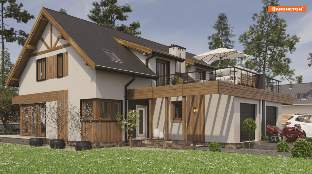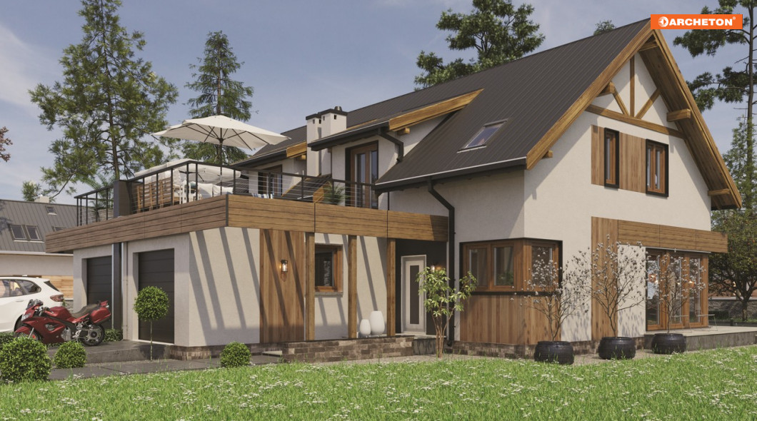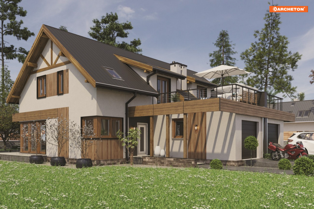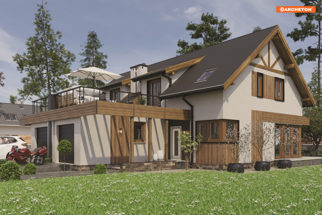 Głębokie parcele na terenach pod zabudowę bliźniaczą dobrze wykorzystują projekty domów z garażem dostawionym od frontu. Takie rozwiązanie planu przewiduje projekt domu Enzo Duo. Niewielki, parterowy, z użytkowym poddaszem budynek mieszkalny przylega do tylnej ściany garażu przechodnią kotłownią dostępną z holu. Niemal kwadratowy rzut zajmuje w największej części otwarty pokój dzienny z kuchnią od frontu i salonem od ogrodu. Oddzielony ścianą nośną dodatkowy pokój wykorzystuje przestrzeń pod biegiem schodów. Niewielka ale pełna łazienka na parterze zamyka program mieszkania, które powiększyć można od razu lub w drugim etapie wykończenia przestrzenią pod dwuspadowym dachem. Są tu trzy kolejne pokoje i przestronna łazienka. Główna sypialnia ma garderobę i wyjście na taras nad garażem, zaakcentowane prostą lukarną. Projekt domu Enzo Duo jest energooszczędny, z nowoczesnymi narożnymi oknami w kuchni i salonie. Wejście frontowe w długim podcieniu we wnęce wzdłuż garażu zapewnia prywatność obu segmentom bliźniaka. Zestawienie równoległego do drogi dojazdowej przebiegu kalenicy z prostopadłą, niższą kostką garażu tworzy dynamiczną kompozycję brył.
