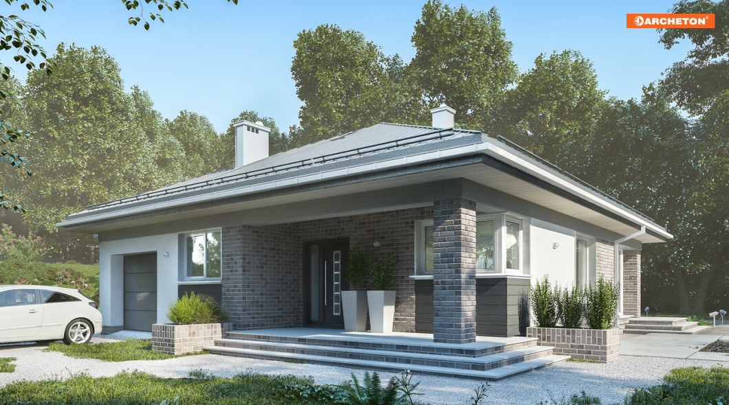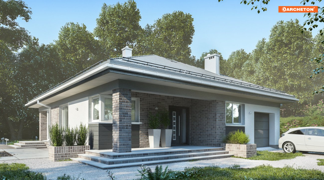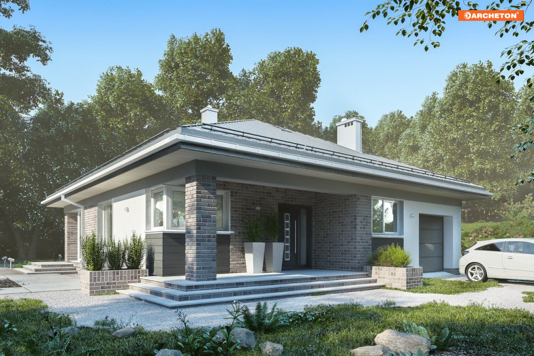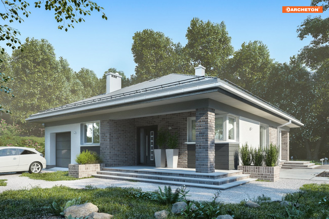 Projekty z rodziny Blanki proponują budowę domu parterowego ze zbliżonym do kwadratu rzutem i czterospadowym dachem nakrywającym mieszkanie oraz zewnętrzne wnęki, podobnie jak w większej Kseni czy Karolu. Projekt domu Blanka Bobo ma proporcjonalnie zmniejszony rzut, przy programie funkcjonalnym i rozkładzie pomieszczeń zaczerpniętym z większej Blanki. W części frontowej uwagę zwraca dostępna z sieni kotłownia z pralnią, łącząca mieszkanie z garażem. Otwarta strefa dzienna złożona z kuchni ze spiżarnią i z salonu rozciąga się od wejścia aż do ogrodu. Zaznaczono ją w bryle narożnymi tarasami na słupach. Ich głębokość można w adaptacji regulować decydując się na większe pomieszczenia lub szczelniejszą osłonę tarasów przed słońcem i deszczem. Środek planu przeznaczono na komunikację i gościnną łazienkę. W głębi znajdują się trzy sypialnie dla 4 osób z kolejną, większą łazienką. Nowoczesność koncepcji projektu domu Blanka, jedynej takiej wśród parterowych domów z garażem o powierzchni ok. 90m2 akcentują narożne okna i duże przesuwne przeszklenie pokoju dziennego. Umożliwia ono latem włączenie ogrodu do przestrzeni życia rodzinnego i towarzyskiego.