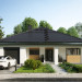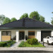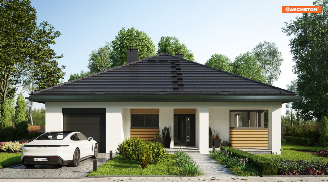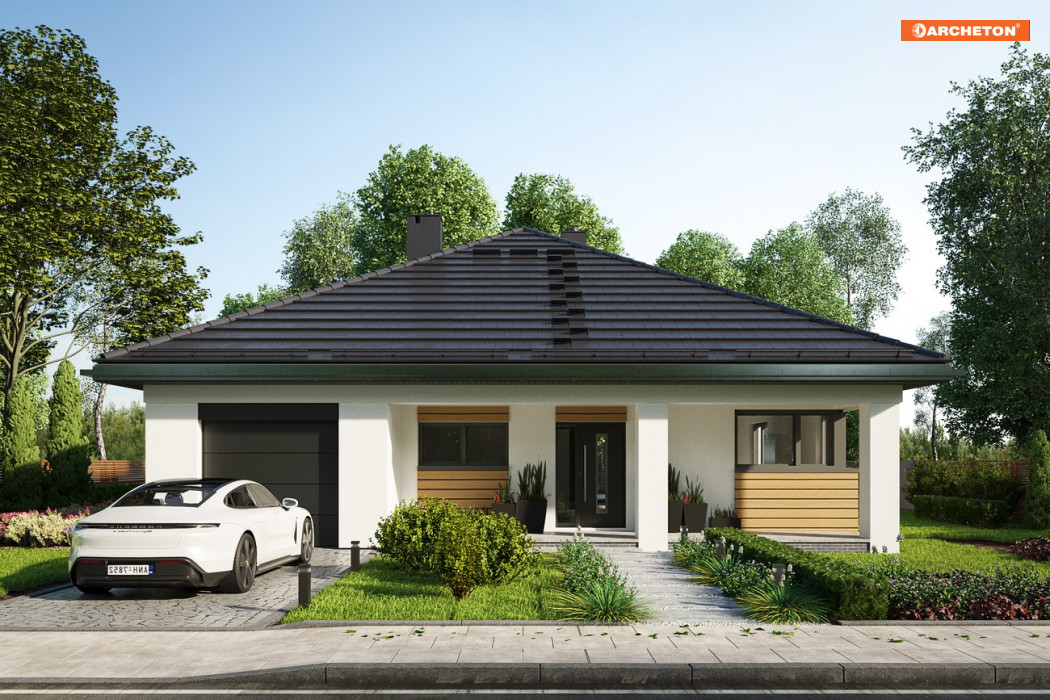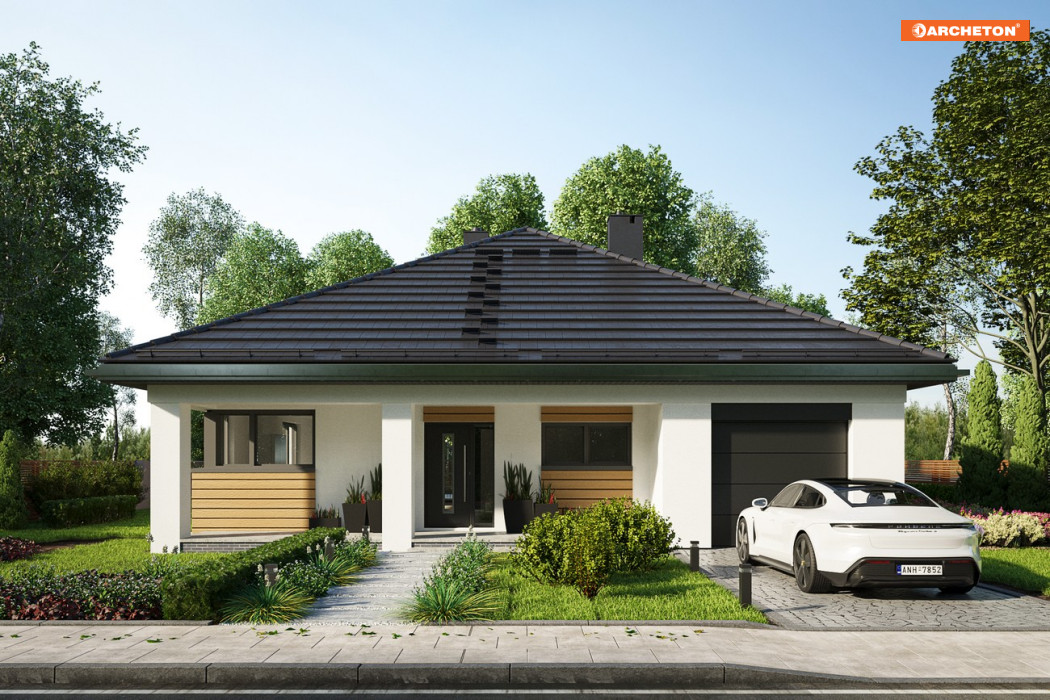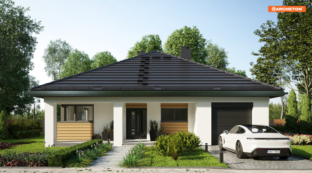 Projekt domu Bratek Nano jest nieco mniejszy od Bratka. Na zbliżonym do kwadratu, okrojonym o 40cm na każdym z boków planie przewiduje identyczne funkcjonalnie jednopoziomowe mieszkanie dla 4 osób z otwartym pokojem dziennym i strefą nocną. Dwie łazienki są ogólnie dostępne ale wyraźnie przeznaczone dla różnych części funkcjonalnych domu. Jedna z nich przylega do zespołu garażu z dużą kotłownią, ulokowanego od frontu. Druga dedykowana jest trzem sypialniom. Część gospodarczą połączono wygodnie z kuchnią przez sień i przechodnią spiżarnię. Czterospadowy, kopertowy dach nakrywa rzut razem z narożnymi tarasowymi wnękami: frontową i ogrodową. Taka bryła jest bardziej energooszczędna ale wyróżnia się kształtem i estetyką wśród parterowych domów o powierzchni 100-115m2 z wbudowanym garażem. Nowatorską stylistykę budynku podkreśla szerokie, rozsuwane przeszklenie salonu oraz narożne okno kuchenne. Rozpiętość dachu w projekcie Bratek Nano jest mniejsza niż w Bratku, dlatego zaproponowano konstrukcję z wiązarów i sufit podwieszany do nich. Nie stwarza on, tak jak żelbetowy, warunków do adaptacji szczupłej przestrzeni poddasza na cele użytkowe.