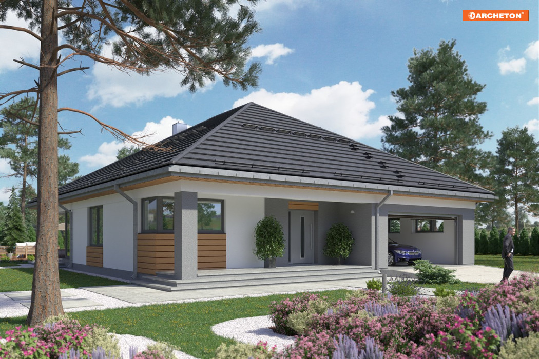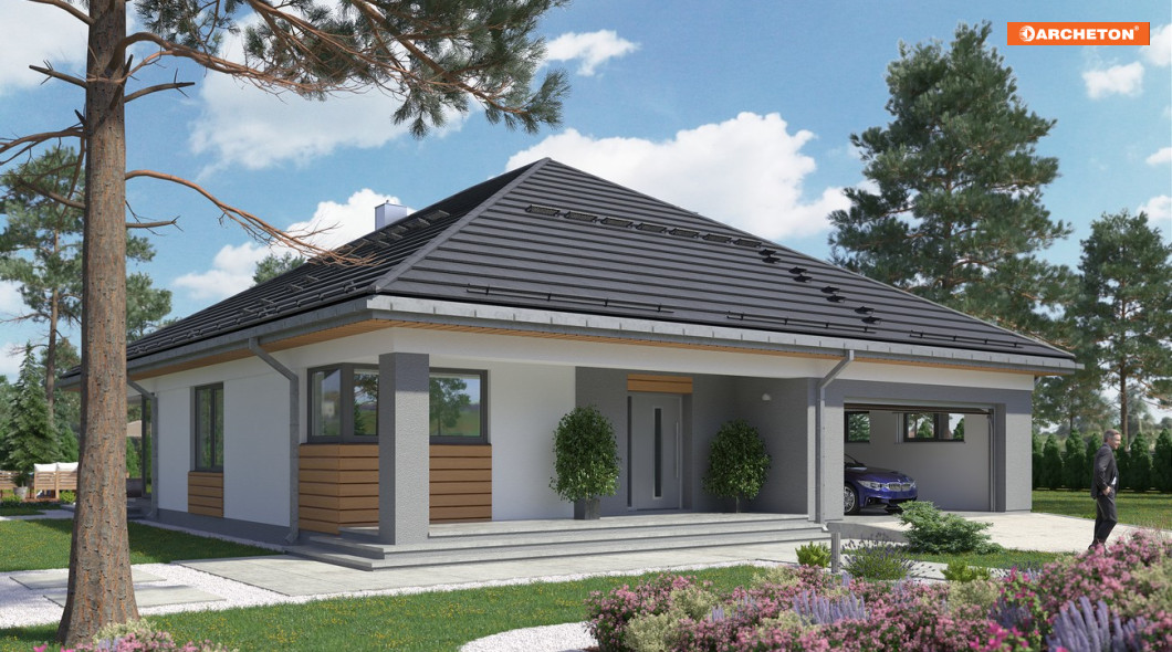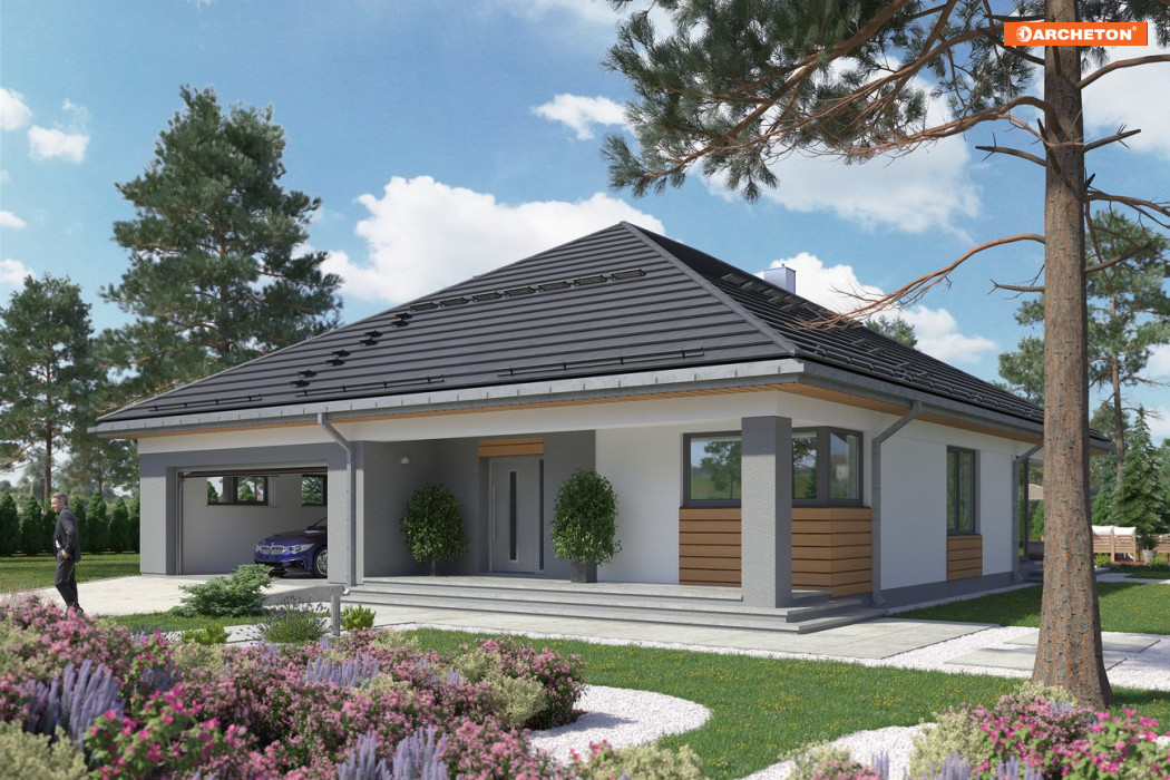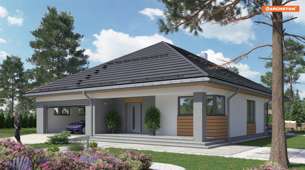 Projekty domów parterowych z rodziny Kordiana pokazują identyczne w układzie funkcjonalnym i formie rozwiązania o różnej szerokości planu domu. Wszystkie mają dwustanowiskowy garaż i czterospadowy dach z krótką kalenicą. Projekt domu Kordian Atu, jako największy w rodzinie, jest kolejną, obok jeszcze bardziej zwartego Karola, propozycją zestawienia jednolitej konstrukcji dachu z rozbudowanym rzutem w grupie domów o powierzchni ok. 145m2. Takie ukształtowanie budynku ekonomicznie zamyka wnętrze i zapewnia stałą osłonę tarasom. Frontowy z nich eksponuje widok z dużego kuchennego okna i wprowadza do sieni. Taras ogrodowy otwiera się z jednoprzestrzennego pokoju dziennego i głównej sypialni na tyłach domu. Oprócz niej, projekt domu Kordian Atu oferuje jeszcze trzy mniejsze pokoje z możliwością rezygnacji z jednego z nich na rzecz większej kotłowni. Zespół dwóch łazienek zajmuje środek rzutu zapewniając optymalną dostępność i wykorzystanie miejsca bez kontaktu ze ścianą zewnętrzną (zastosować można świetlik tunelowy w dachu). Nachylenie połaci zachęca do zagospodarowania poddasza ale wymaga to adaptacji i zmian konstrukcji.