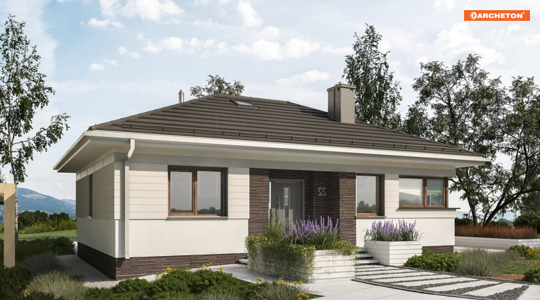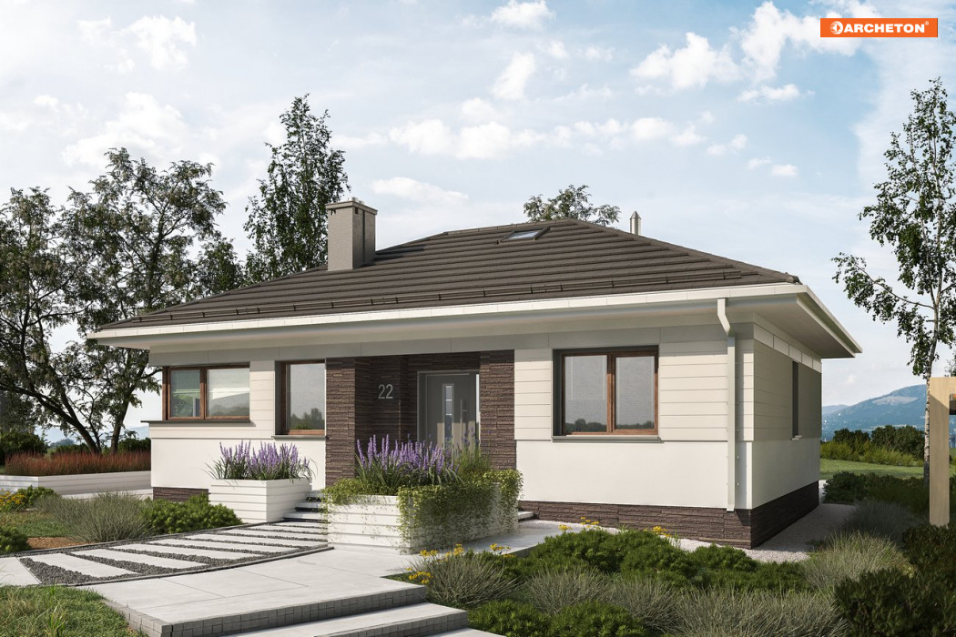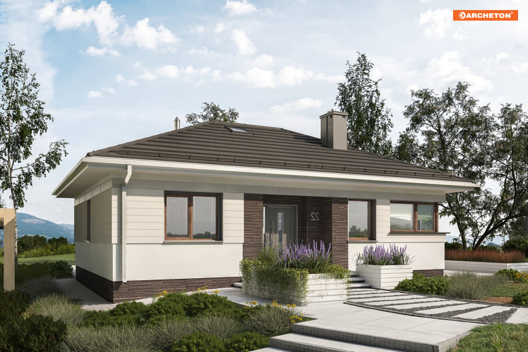 Projekt domu Felek, jako kolejny po Julii, zakłada budowę parterowego domu o powierzchni ok. 80m2, z czterospadowym dachem, bez garażu. Inaczej ustawiono jednak plan budynku, kierując go dłuższą elewacją i kalenicą równolegle do drogi dojazdowej. Budynek wymaga zatem płytszej ale szerszej działki, niż Julia. Przypominając tym, a także rozwiązaniami funkcjonalnymi, Agatę, pokazuje jednocześnie, jak inne w odbiorze wizualnym są wielkości brył o podobnym rozmiarze rzutu ale z różnymi w kształcie dachami. Projekt domu Felek odróżnia od Julii bardziej typowy układ wnętrza, bez przechodniego salonu przy wejściu od południa. Podłużna ściana nośna wydziela w Felku od frontu kuchnię, sień z kotłownią i jedną z sypialni, co sprawia, że dom najlepiej sprawdzi się na działce z północnym wjazdem. Pozostałą przestrzeń można rozdysponować dowolnie np. na otwarty pokój dzienny i dwie sypialnie z łazienką. Oprócz wejściowej wnęki podkreślonej zróżnicowaniem materiałów elewacyjnych, prostą bryłę urozmaicają duże, narożne okna w części dziennej.