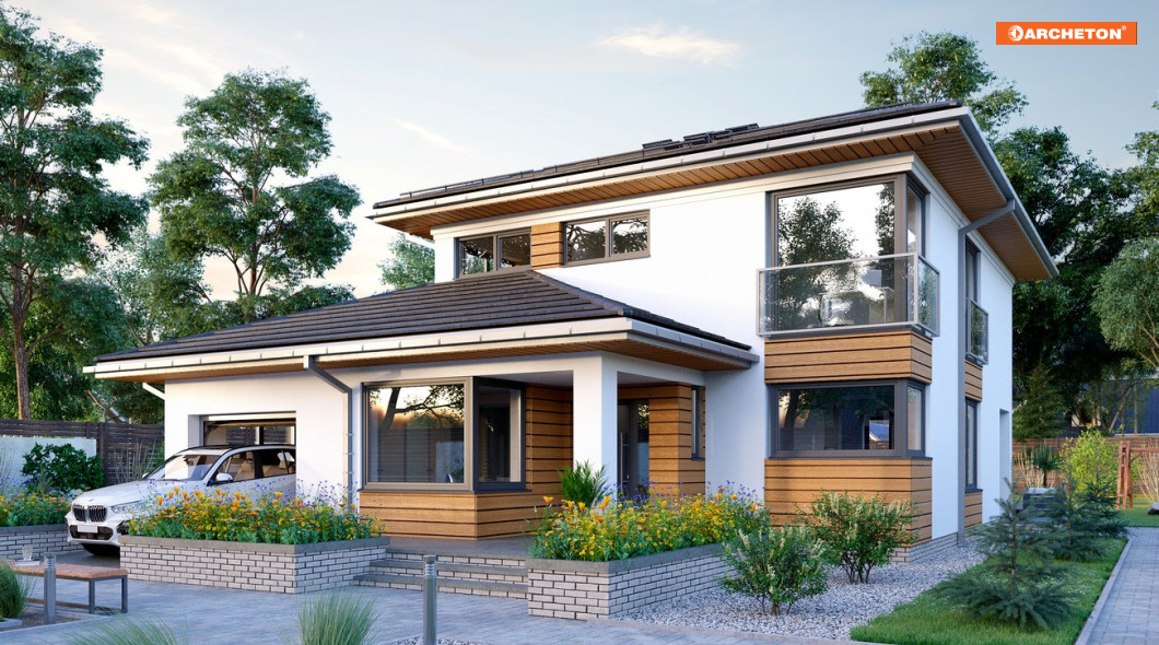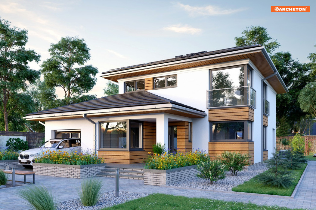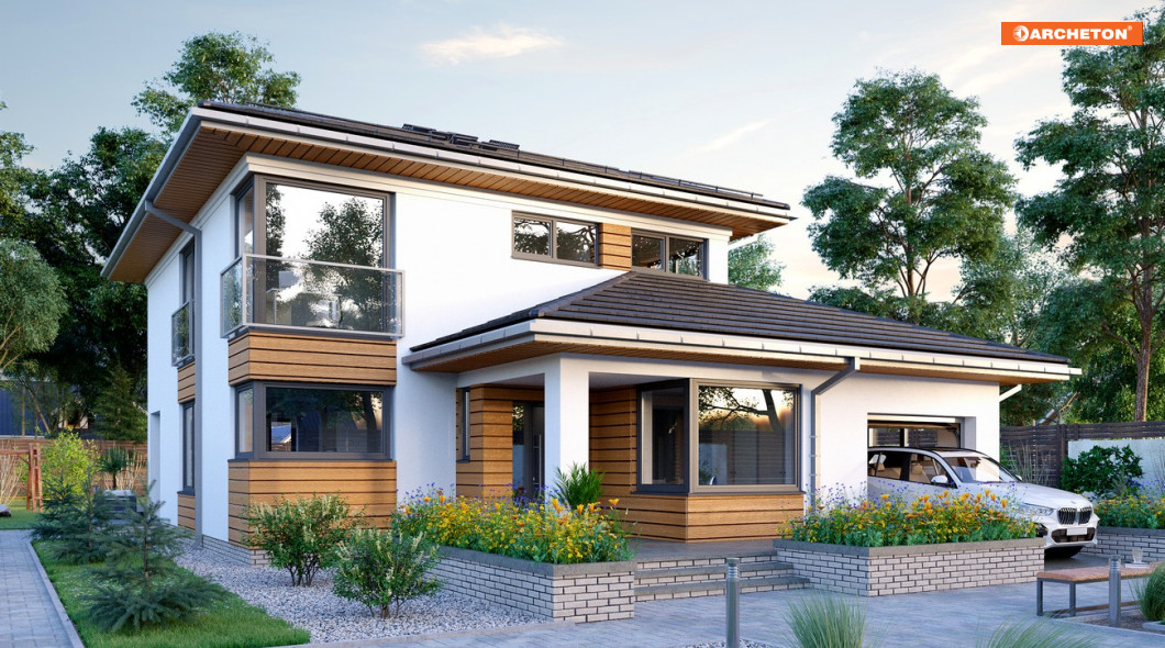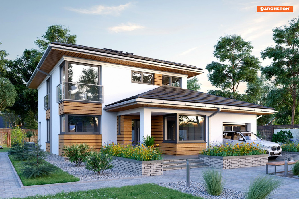 Rodzina Piryta wyróżnia się w ofercie Archetonu proponując domy piętrowe, z dobudowanym podwójnym garażem. Nowoczesny, miejski styl podkreślają niezbyt strome czterospadowe dachy. Z planu zbudowanego z nachodzących na siebie prostokątów wyrasta prostopadłościenna, dwukondygnacyjna bryła, z przylegającym do jej dwóch elewacji, wysuniętym ku frontowi niższym budynkiem. W projekcie domu Piryt G1, zmniejszone zostały nieco oba wymiary planu w stosunku do Piryta i wersji As, a zamiast drugiego stanowiska garażu zaproponowano gabinet w strefie wejściowej. Kotłownia pozostaje duża jak w wersji As i ma dodatkowe pomieszczenie. Parterowy budynek obejmuje strefę gospodarczą i podcień frontowy oraz taras na tyłach kotłowni. Duże, wygodne mieszkanie ma zbliżony rozkład otwartego pokoju dziennego, z nieco innym układem kuchnia - jadalnia. Klatka schodowa z przechodnim schowkiem prowadzi z holu zespolonego z salonem do czterech pokoi na piętrze. Projekt domu Piryt G1 ma tu tylko jedną łazienkę i pralnię ale inaczej niż Piryt i Piryt As oferuje pełną łazienkę na parterze. Elewacje rozwiązano podobnie, przy pomocy balkonowych przeszkleń i narożnych okien.