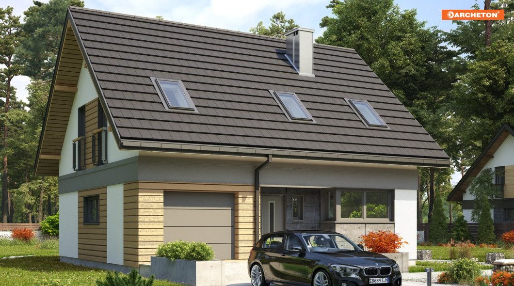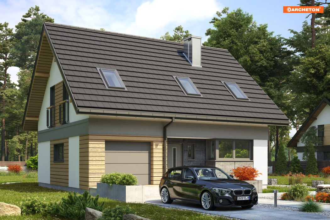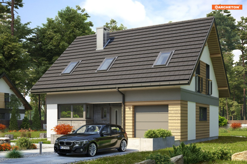 Atos i Szafir, a teraz także Mateo Alfa, to projekty domów z użytkowym poddaszem i wbudowanym garażem, ekonomicznych w budowie i nowocześnie rozwiązanych w oparciu o tradycyjną bryłę. Wszystkie mają prosty dwuspadowy dach bez lukarn, nieco ponad 100m2, przy czym Mateo Alfa ma rzut najbardziej zbliżony do kwadratu. To wyróżnia go również w Rodzinie Mateo. Wersje powiązane są prostotą, kształtem i skalą budynku oraz identyczną strefą wejściową z frontowymi drzwiami we wnęce. Dostępność garażu z sieni oraz schowek przy kotłowni przypomina rozwiązania bardziej tradycyjnego Oberka. W projekcie Mateo Alfa salon jest najwyraźniej otwarty na hol. Kuchnia ma nowoczesne okno narożne skierowane na wejście do budynku, bo inaczej niż w Mateo i Mateo Rex usytuowane zostały schody ze spiżarnią pod biegami. Najniższe stopnie są elementem pokoju dziennego. W podobnie prosty, elegancki sposób co w innych wersjach, zaprojektowano gładkie elewacje bez balkonów, choć front jest o dwa metry węższy przy tej samej szerokości. Cztery pokoje i spora łazienka zmieszczą się na poddaszu w projekcie Mateo Alfa. Większe warianty oferują tu jeszcze osobną pralnię.