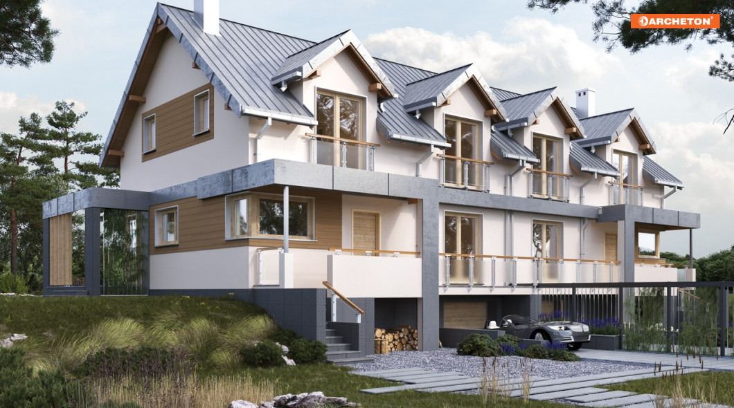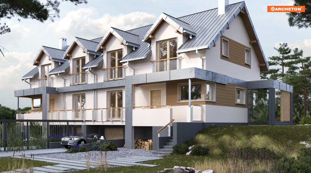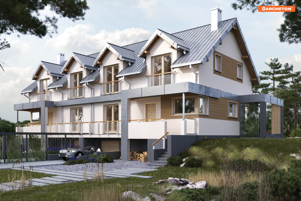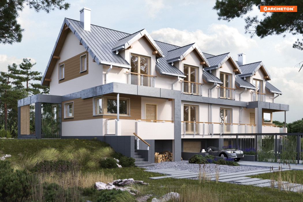 Wśród domów bliźniaczych (do budowy w granicy działki) projekt domu Emilia Grota Duo wyróżnia się pełnym podpiwniczeniem. Zwraca też uwagę eklektycznym połączeniem elementów bryły. Pionowy rytm tradycyjnych lukarn w dwuspadowym dachu ciekawie kontrastuje z płaskimi detalami płytkich zadaszeń wejścia i tarasu ogrodowego oraz z nowoczesnymi detalami oddzielającymi lustrzane części budynku. Niestandardowo rozwiązano w projekcie domu Emilia Grota Duo także komunikację we wnętrzu. Schody na poddasze prowadzą wprost z salonu połączonego z wysuniętą ku frontowi kuchnią. Kolejną zaletą domu, wynikającą z umieszczenia garażu w piwnicy, są dwa dodatkowe, niewielkie pokoje na parterze położone ustronnie, z łatwym dostępem do łazienki. Na poddaszu architekt zaprojektował trzy stosunkowo duże sypialnie i przestronną łazienkę. Przedpokój jest ładny i wygodny, a sypialnia główna dysponuje własną przestronną garderobą. Atutem projektu jest duże narożne przeszklenie pokoju dziennego. Kieruje ono widok oraz wyjście na taras z dala od granicy segmentów, zapewniając spokój i intymność zarówno w domu jak i ogrodzie.