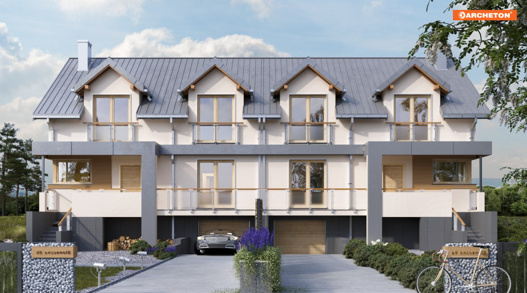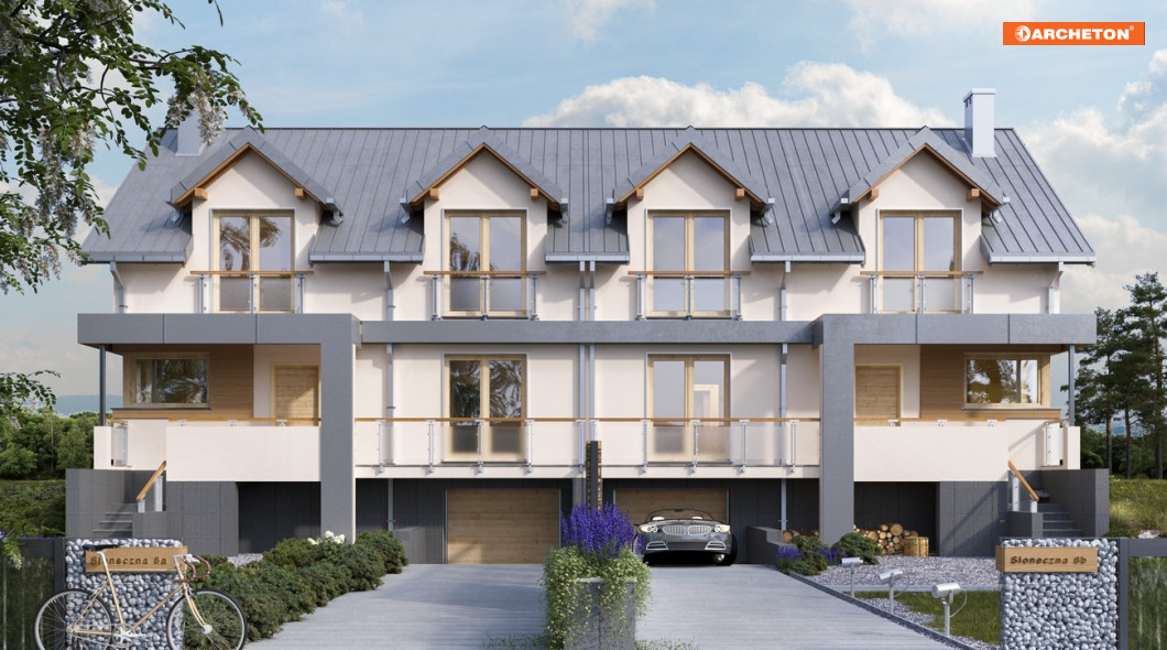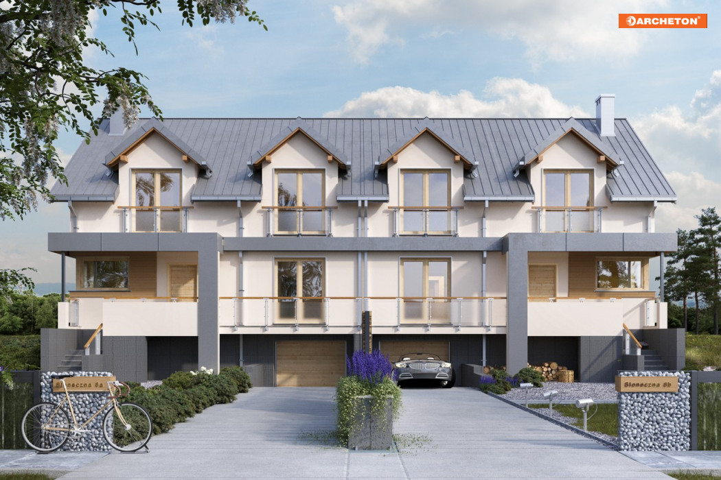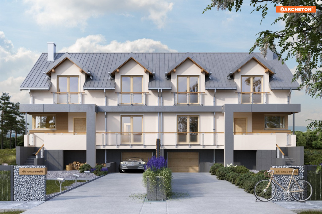 Wśród domów jednorodzinnych z dwoma lokalami mieszkalnymi projekt domu Emilia Grota Duolit wyróżnia pełne podpiwniczenie. Zwraca też uwagę eklektyczne połączenie elementów bryły. Pionowy rytm tradycyjnych lukarn w dwuspadowym dachu ciekawie kontrastuje z płaskimi detalami płytkich zadaszeń wejścia i tarasu ogrodowego oraz z nowoczesnymi detalami oddzielającymi lustrzane części budynku. Niestandardowo rozwiązano w projekcie domu Emilia Grota Duolit także komunikację we wnętrzu. Schody na poddasze prowadzą wprost z salonu połączonego z wysuniętą ku frontowi kuchnią. Kolejną zaletą domu, wynikającą z umieszczenia garażu w piwnicy, są dwa dodatkowe, niewielkie pokoje na parterze położone ustronnie, z łatwym dostępem do łazienki. Na poddaszu architekt zaprojektował trzy stosunkowo duże sypialnie i przestronną łazienkę. Przedpokój jest ładny i wygodny, a sypialnia główna dysponuje własną przestronną garderobą. Atutem projektu jest duże narożne przeszklenie pokoju dziennego. Kieruje ono widok oraz wyjście na taras z dala od granicy lustrzanych części budynku, zapewniając spokój i intymność zarówno w domu jak i ogrodzie.