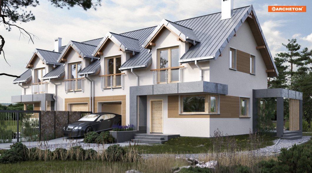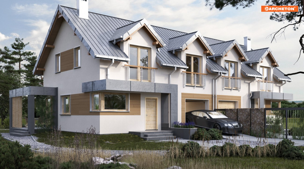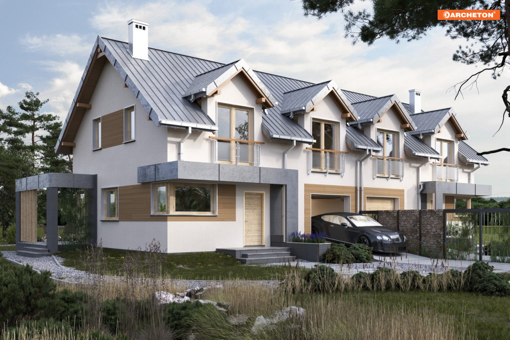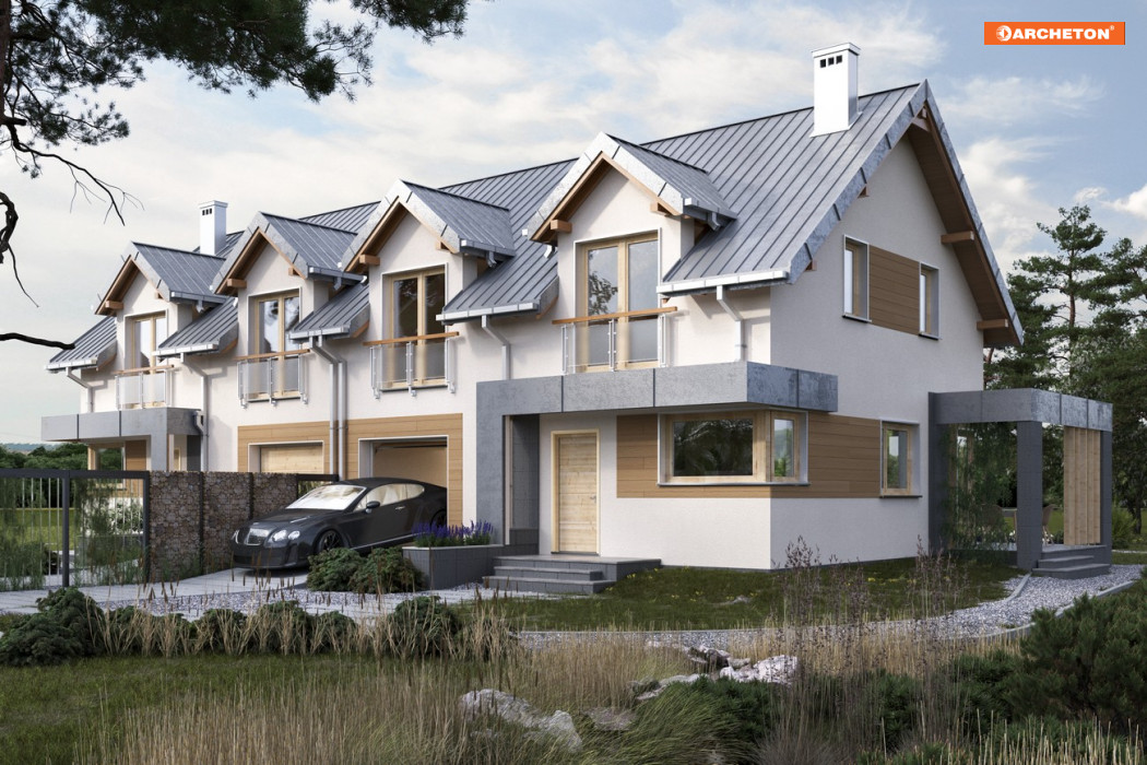 Wśród domów jednorodzinnych z dwoma lustrzanymi lokalami mieszkalnymi, projekt domu Emilia Duolit prezentuje średnią powierzchnię. Zwraca uwagę eklektycznym połączeniem elementów bryły. Pionowy rytm tradycyjnych lukarn w dwuspadowym dachu ciekawie kontrastuje z płaskimi, poziomymi detalami płytkich zadaszeń wejścia i tarasu ogrodowego oraz z nowoczesnymi detalami oddzielającymi przestrzeń ogrodu dostępną z obu mieszkań. Dom przeznaczony jest na płytsze działki niż nieco mniejsza Lila 2 Duolit, której lokale mają bardziej wydłużone, węższe plany. Niestandardowo rozwiązano w projekcie Emilia Duolit także komunikację we wnętrzach mieszkań. Schody na poddasze prowadzą wprost z salonów, połączonych z ulokowanymi od frontu kuchniami. W strefach wejścia jest wygodna z sień z szafą, wc i przejście do garażu z kotłownią. Inaczej niż w Lili 2 Duolit architekt zaprojektował po trzy stosunkowo duże pokoje i przestronną łazienkę w strefie nocnej. Przedpokoje są tu wygodne, a sypialnie główne mają własną garderobę. Atutem projektu są duże narożne przeszklenia salonów. Kierują ono wzrok oraz wyjścia do ogrodu w przeciwległe części posesji, zapewniając spokój i intymność na tarasie każdego z mieszkań.