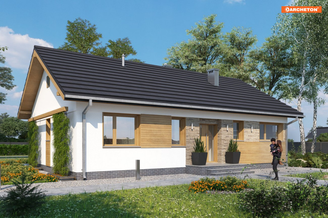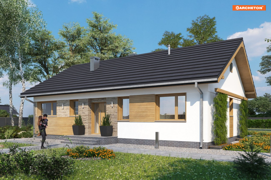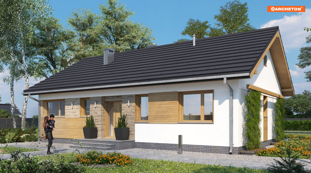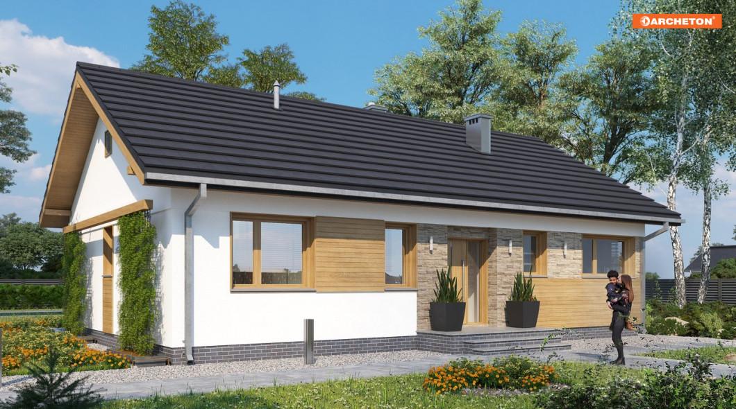 Tak jak Modrzyk, Kruszyna czy Domino, projekt domu Janek to propozycja parterowej bryły na planie zgrabnego prostokąta, z dwuspadowym, niezbyt stromym dachem i kalenicą równoległą do drogi dojazdowej. Tym razem, przy 95m2 powierzchni użytkowej, przewidziano maksymalne uproszczony, zwarty plan (jak w Domino) i kotłownię z pralnią z wejściem od ogrodu, (jak w Modzrzyku). Zamiast wejściowej werandy w narożniku jest płytka wnęka z pogłębionym okapem akcentująca frontowe drzwi. Tak jak w Kruszynie, hol nie łączy się bezpośrednio z pokojem dziennym, a rozdziela strefy wspólną i prywatną dwoma ramionami przedpokoju. Jadalnia zmyka jedno z nich oknem w ścianie bocznej i spaja otwartą, dużą kuchnię ze spiżarnią z salonem. Zespół trzech sypialni i łazienki po drugiej stronie domu zamyka z kolei pralnia przy drugiej ścianie bocznej w przechodnim układzie z kotłownią.Elegancję prostej bryły w projekcie domu Janek podkreśla wykończenie. Zaznacza ono w każdej elewacji górny poziom otworów okiennych i drzwiowych odcinając gładkim, jasnym pasem bryłę dachu.