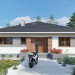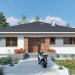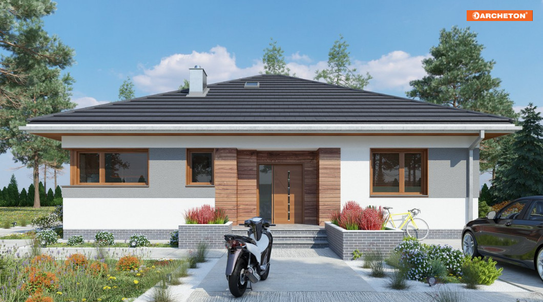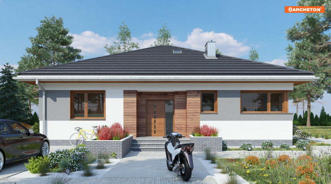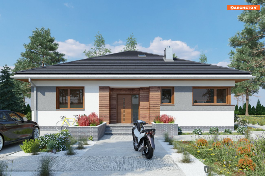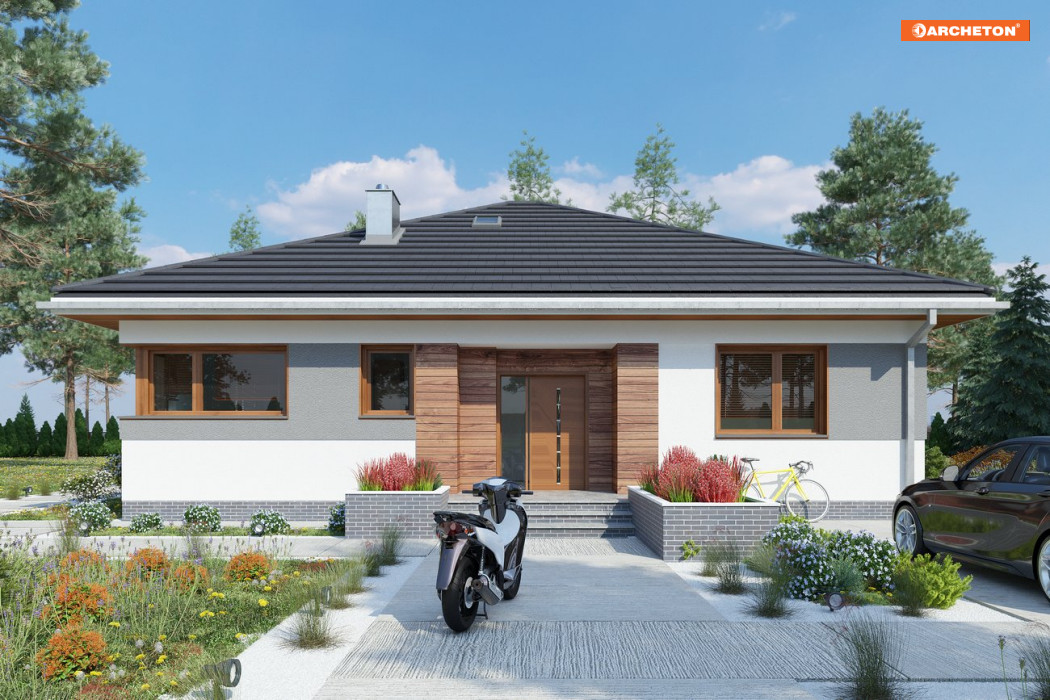 Kwadrę - projekt domu parterowego bez garażu, o najkrótszej elewacji frontowej wśród propozycji z czterospadowym dachem o powierzchni ok. 100m2 w ofercie Archetonu zdystansował projekt domu Kwadra Ton. Pozostawiono identyczny układ funkcjonalny ale elewacja frontowa została jeszcze skrócona, a boczne wydłużono. Rzutu przyjął niemal kwadratowy kształt, a powierzchnia wzrosła o kilka m2. Tak jak w Kwadrze wejście umieszczone na środku elewacji, we wnęce, nadaje reprezentacyjny charakter prostej sylwetce. Część dzienną budynku wyróżniają narożne okna, a trzy wygodne sypialnie, położone po drugiej stronie strefy wejścia, doświetlone są tradycyjnie. We wnętrzu uwagę zwraca bardzo przestronny, otwarty salon z dużą kuchnią. Położony centralnie hol jest tak obszerny, że kuchnię dzieli od niego tylko krok, więc nie odczuwa się braku osobnego przejścia z sieni. Miejsce to wykorzystano na dużą kotłownię z pralnią. Taras ogrodowy w projekcie domu Kwadra jest naturalnie osłonięty dzięki umieszczeniu go częściowo w płytkiej wnęce przy pokoju dziennym pod dachem wspartym na masywnym słupie. To rozwiązanie pozwala inwestorowi na regulowanie wielkości salonu w zakresie głębokości uskoku ściany zewnętrznej.