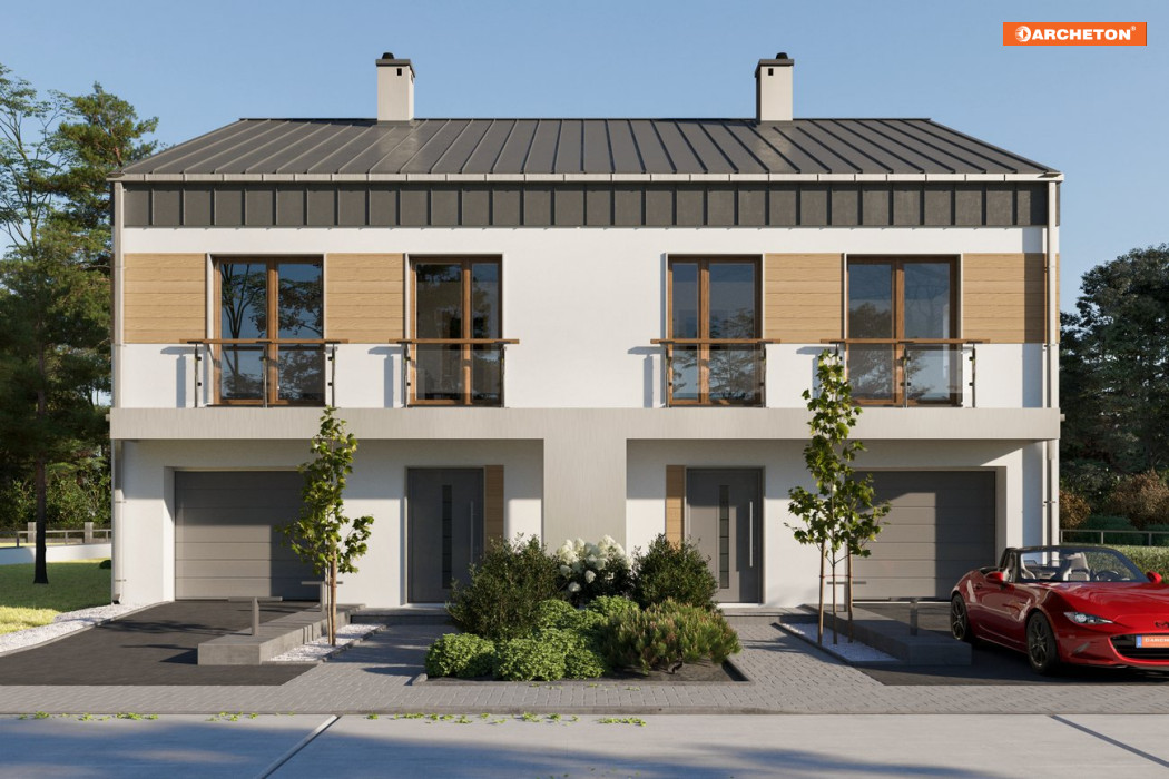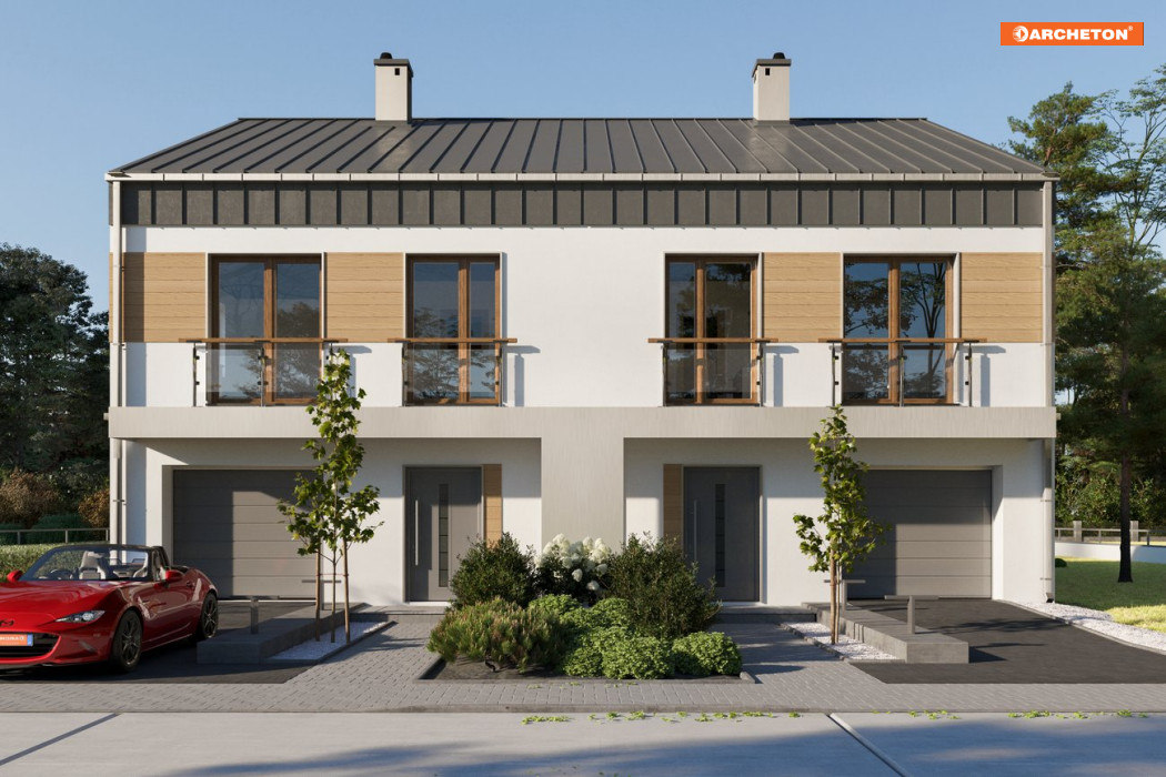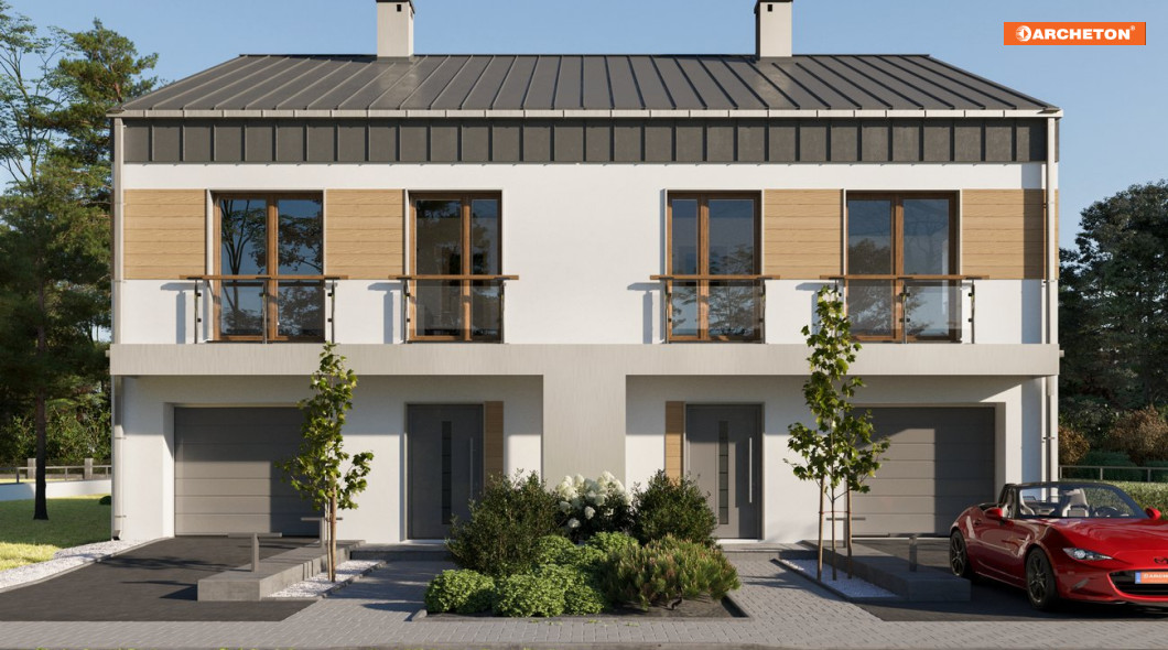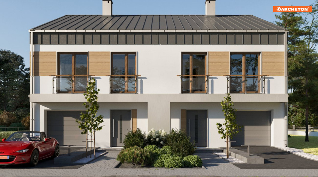Piętrowa Iryda Duolit to większy z domów jednorodzinnych z dwoma lokalami i z garażami w ofercie Archetonu. Ma najprostszą, energooszczędną sylwetkę. Niezbyt stromy, nowoczesny dach bez okapu nadaje budynkowi miejski charakter. Zaskakująco wygodny jest układ obu mieszkań, mimo wydłużonego rzutu. Elementy nośne naturalnie wtapiają się w atrakcyjnie rozplanowaną przestrzeń. Garaż zabiera od frontu parteru 1/4 powierzchni, a resztę wykorzystano na dużą sień i hol. Imponująca długość szaf w strefie wejścia pozwoli bez trudu utrzymać porządek. Otwarta kuchnia jest wygodna do pracy i lekko przesłonięta od salonu słupem. Pozostałą połowę planu, od ogrodu, zajął słoneczny pokój dzienny z jadalnią i otwartymi schodami. Na piętrze przestronny, zgrabny przedpokój prowadzi do 4 sypialni, z których każda ma regularny, ustawny kształt. Elewacje w projekcie domu Iryda Duo są gładkie, bez balkonów. Pozostawiają dużą swobodę indywidualnego wykończenia. Wersję do zabudowy szeregowej proponuje projekt domu Iryda Multi, a wariant wolnostojącego domu jednorodzinnego - Iryda. Podobnej wielkości lecz lepiej dopasowany do szerszej a płytszej działki jest Igor Duolit.