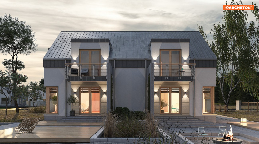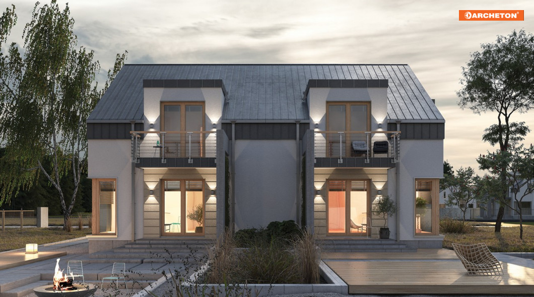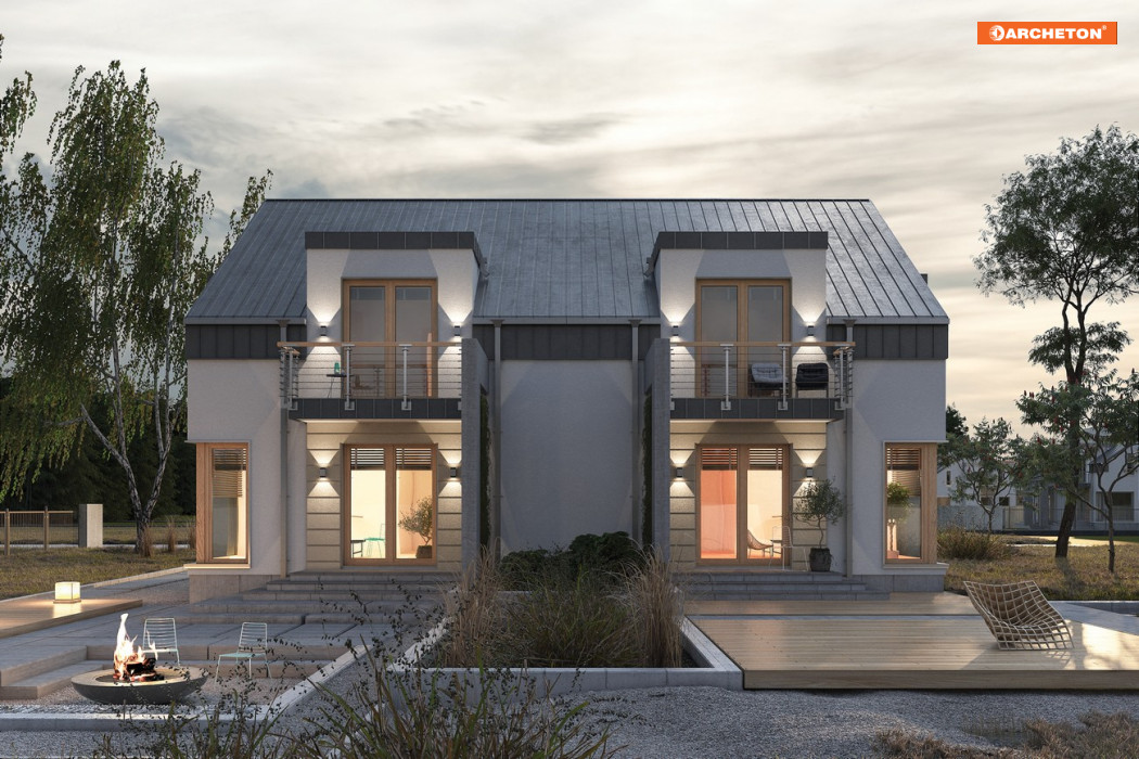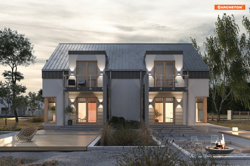 Projekt domu Mirabel Duolit proponuje budowę domu jednorodzinnego z dwoma lustrzanymi lokalami i samodzielnymi wejściami na stosunkowo wąskiej działce. Parterowy budynek z użytkowym poddaszem, bez garażu, oferuje dwa dwupoziomowe mieszkania dla czteroosobowych rodzin Pokoje dzienne znajdują się w nich na tyłach domu. Miejsce naprzeciwko schodów z praktycznym schowkiem, znalazła otwarta na pokój dzienny kuchnia. Powiększona ryzalitem z narożnym oknem, ma wygodny wgląd na otoczenie budynku, a przy tym łączy się przestrzennie z jadalnią i strefą relaksu. W projekcie domu Mirabel Duolit od frontu zaplanowano gabinet i łazienkę z kotłem gazowym przy wejściu. Pod dwuspadowym dachem o kalenicy równoległej do drogi dojazdowej rozlokowano trzy sypialnie z łazienką. Każda ma oryginalny kształt: dwie od frontu i od ogrodu dzięki płasko przekrytym lukarnom, a najmniejsza z nich - za sprawą narożnego okna ryzalitu w ścianie bocznej. Wpisanie pudełkowych elementów w tradycyjny zarys domu ze stromym dachem decyduje o nowoczesnym charakterze architektury. Budowę bliźniaczych segmentów na samodzielnych prawnie działkach umożliwia projekt domu Mirabel Duo.