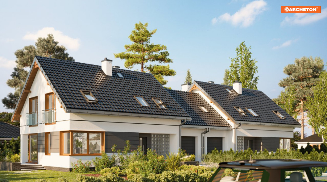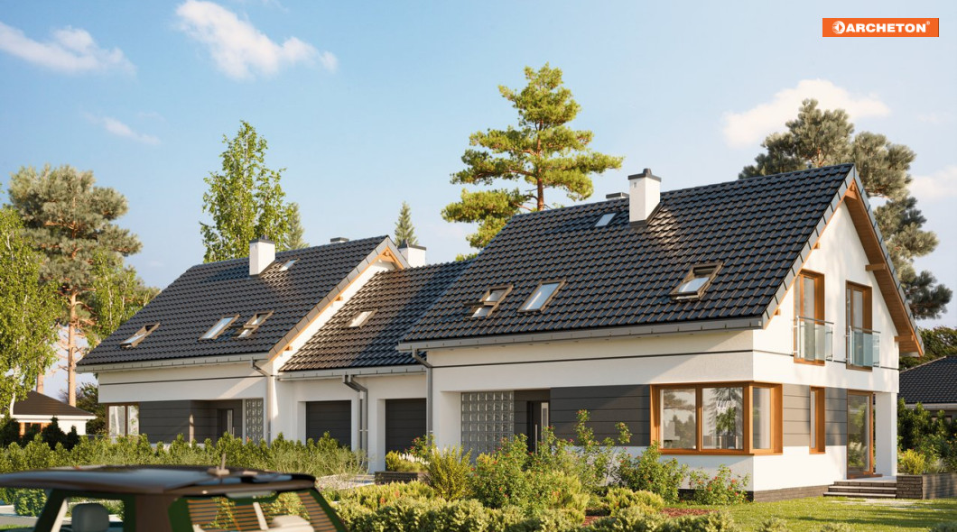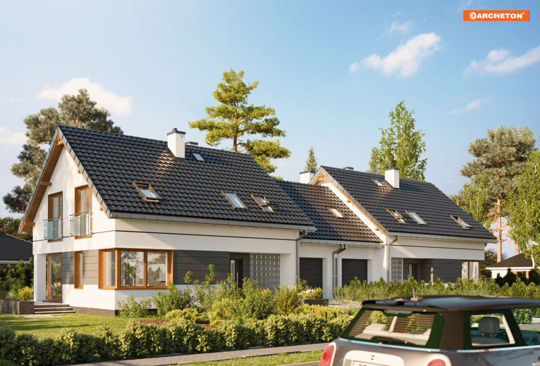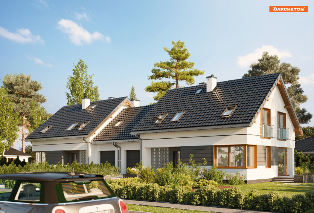 Południowy wjazd na niezbyt głęboką działkę i prosta bryła – te cechy niewielkiego bliźniaka z garażem wykreślić mogą z listy życzeń inwestorzy, rozważający wybór projektu domu Bartek Duo. Zadowoleni będą zwolennicy oddzielnej, dużej kuchni ze spiżarnią, bo choć parter jest otwarty, to salon stanowi samodzielną przestrzeń. Także ruch parter - poddasze odseparowano bardziej niż w modnych rozwiązaniach wyprowadzających schody wprost z pokoju dziennego. Ulokowano je tu na uboczu holu, a trzy duże sypialnie z łazienką mają zapewnioną na górze prywatność i sprzyjającą relaksowi ciszę. Wyjątkowo długi jest garaż ale nie wydzielono z niego kotłowni. Przewidziano ją na poddaszu jako pomieszczenie na piec gazowy i pralnię. Cała bryła garażowa pełniąca funkcje gospodarcze jest nieco węższa i niższa od mieszkalnej. W tradycyjnej sylwetce projektu domu Bartek Duo nie brak nowoczesnych akcentów. Od frontu, przy drzwiach wejściowych, migocze odblaskami pustaków szklanych ściana schowka pod schodami. Ogrodowy narożnik jadalni został całkowicie przeszklony i, bez szkody dla oświetlenia wnętrza, ustąpił nieco miejsca cienistemu tarasowi.