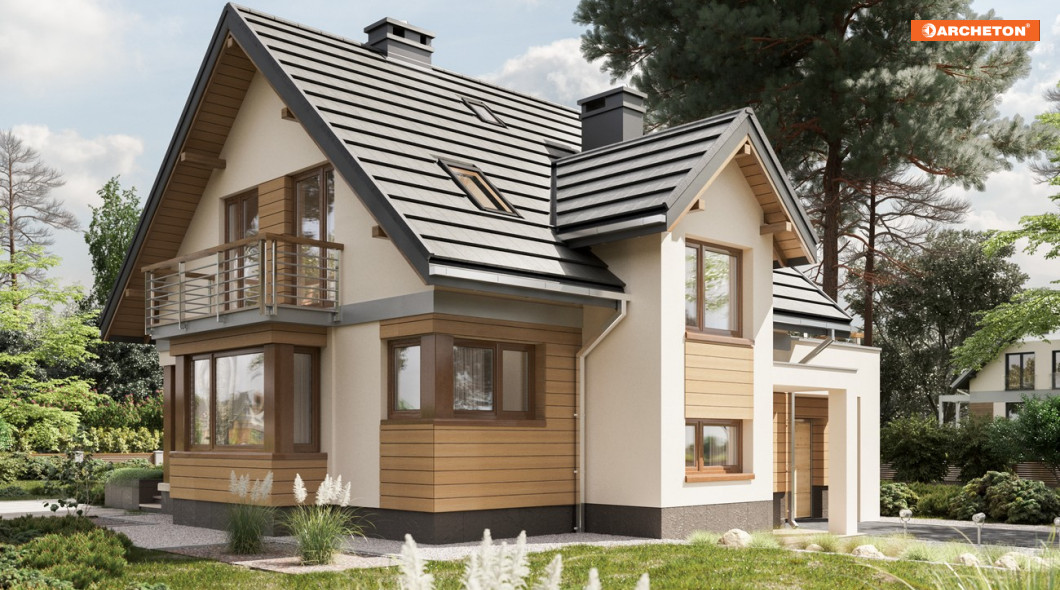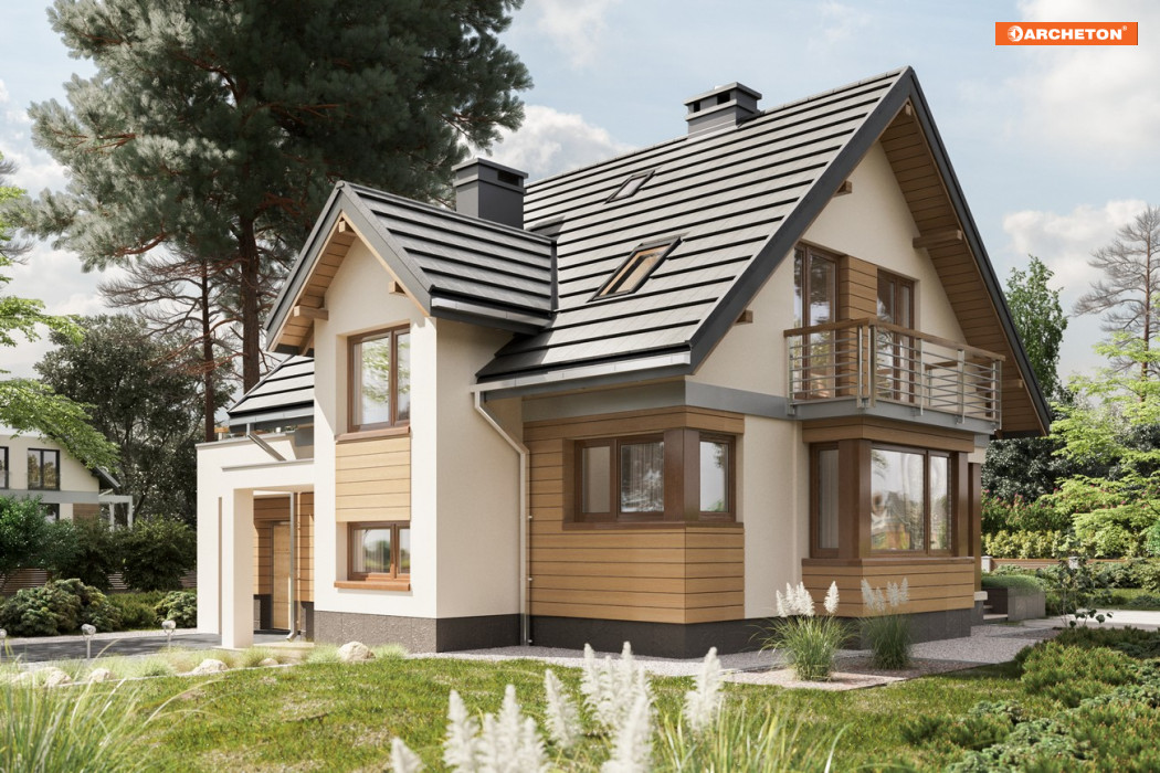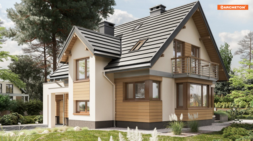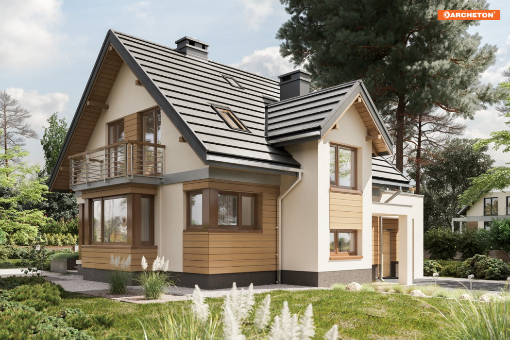 Koncepcje małego domu z użytkowym poddaszem, na działce z lekkim pochyleniem ku wjazdowi, prezentują już w Archetonie rodziny Kraba i Fiony. Rodzinę Mirony odróżnia bardziej awangardowy styl w grupie propozycji z dodatkowym pokojem na parterze, a przy tym najmniejsze zróżnicowanie pokrewnych wariantów pod względem wielkości i układu funkcjonalnego. Strefa wejściowa w projekcie domu Mirona Neo, z sienią, kotłownią i z garażem, jest obniżona w stosunku do holu i otwartego pokoju dziennego na głównym poziomie parteru. Wysunięto ją też, razem ze spocznikiem klatki schodowej, w formie wysokiego ryzalitu. Poddasze mieści trzy sypialnie z dużą łazienką, a na półpiętrze praktycznie ulokowano pralnię. Ten układ przekryty został prostym, dwuspadowym dachem. O modernistycznym szyku budynku decydują narożne okna kuchni i salonu oraz kostki dostawionego garażu i ryzalitu z jadalnią - w drugiej ścianie bocznej. Charakterystycznym detalem jest też pełna, balustrada tarasu nadwieszonego nad bramą garażową oraz podobny element zadaszenia nad drzwiami wejściowymi. Projekt domu Mirona Neo odróżnia w rodzinie tradycyjne dwuspadowe lukarny od frontu i ogrodu.