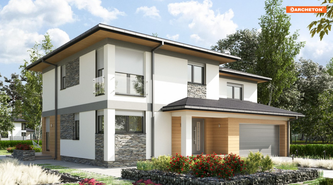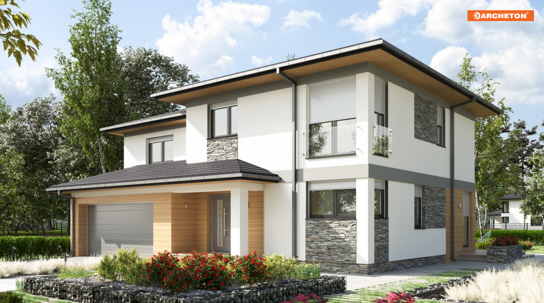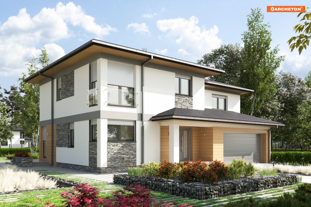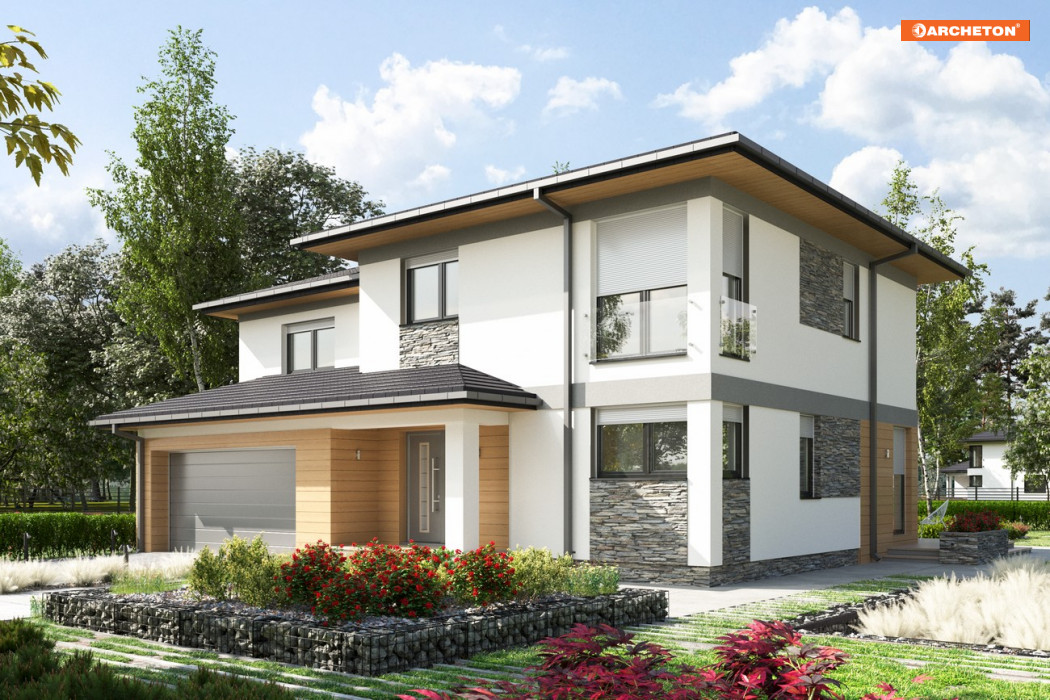 Wygodny, średniej wielkości dom wolnostojący dla 4-5 osób rozplanowano podobnie jak w wariancie do zabudowy bliźniaczej - w projekcie domu Igor Duo. Do części mieszkalnej, zbudowanej na rzucie prostokąta o złotych proporcjach, dostawiono, przesunięty ku frontowi, trakt podwójnego garażu z kotłownią. Na parterze, oprócz przedsionka i wc przy otwartym holu oraz spiżarni, zamknięto tylko przestrzeń pod częścią klatki schodowej. Pokój dzienny jest dzięki temu niezwykle przestronny, oświetlony z trzech stron świata, m.in. przez narożne okna jadalni i kuchni. Podział schodów na biegi różnej długości pozwolił wydzielić na osobnych poziomach pokój z łazienką i pralnię dostępną z podestu oraz wyżej główną część nocną na piętrze właściwym. Trzy sypialnie i kolejna łazienka mają tu bardzo wygodne rozmiary. Zdyscyplinowane prostopadłościany bryły w projekcie domu Igor Polo przekrywają czterospadowe, niezbyt strome dachy z krótką kalenicą. Część garażowa jest, w swojej parterowej podstawie, większa niż piętro nad nią. Zadaszenie nad tarasem wejścia głównego otacza ją wzdłuż trzech elewacji. Nowoczesny styl podkreślają gładkie elewacje bez balkonów i duże okna porte fenetre zabezpieczone barierką