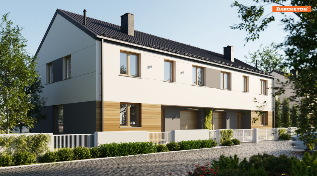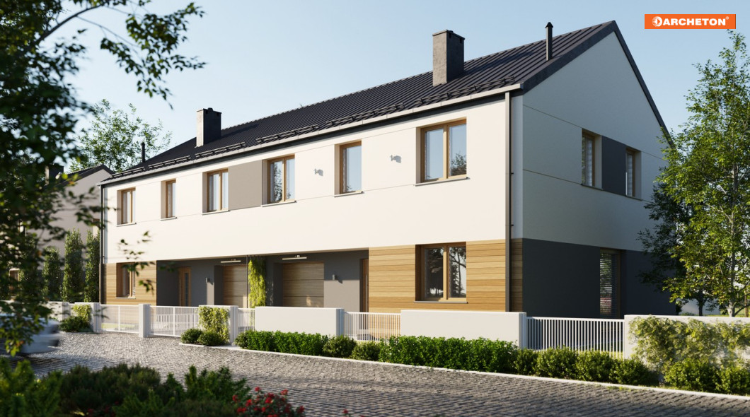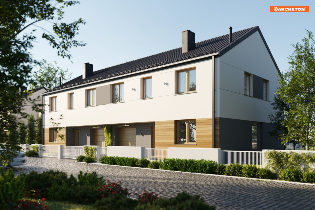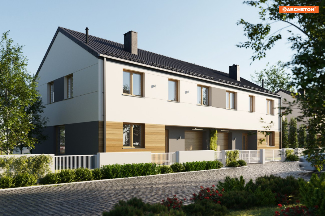 W projekcie bliźniaczego domu piętrowego z dachem dwuspadowym Emma Duolit na pierwszy plan wybija się prosta, pozbawiona niepotrzebnych naddatków i ornamentów bryła budynku. Dwupołaciowy dach bezokapowy, kwadratowe orynnowanie, rezygnacja z balkonów na piętrze sprawiają, że budynek ma bardzo zwartą formę. Nie jest jednak pozbawiony charakteru – stolarka okienna w ciepłych odcieniach drewna, wizualne odcięcie parteru od piętra za pomocą okładzin na elewacji (od frontu w kolorze jasnego drewna, od tyłu i na ścianach szczytowych – w modnych szarościach) to elementy, które dynamizują bryłę.