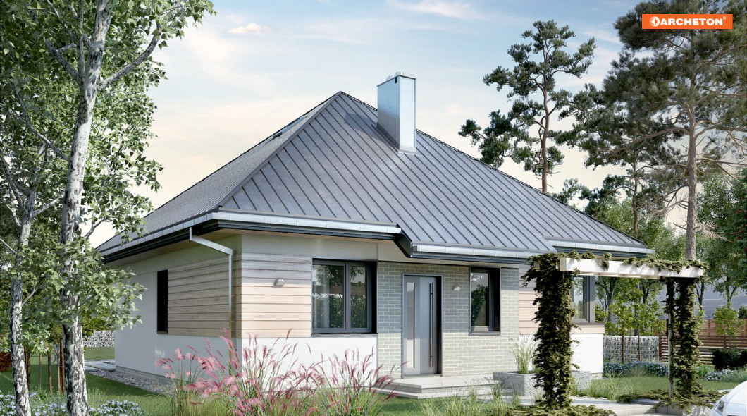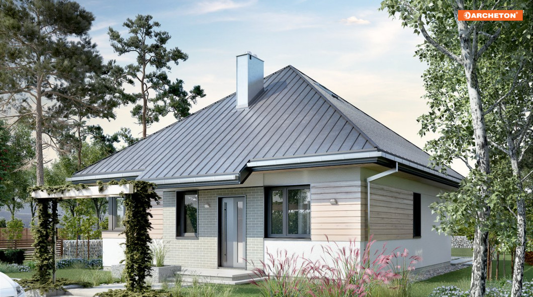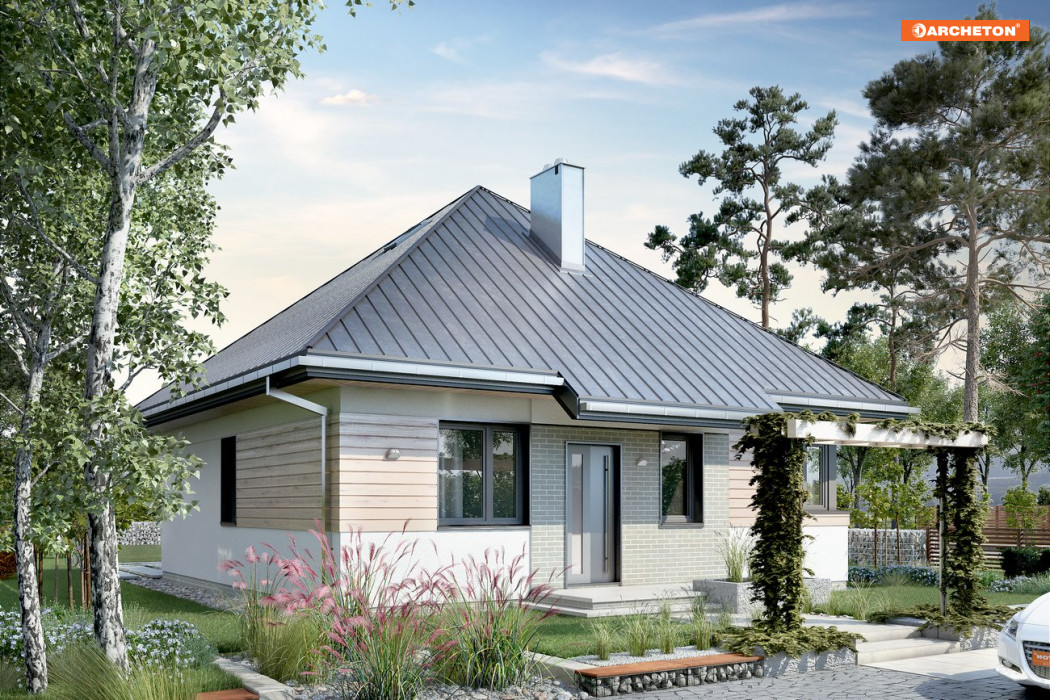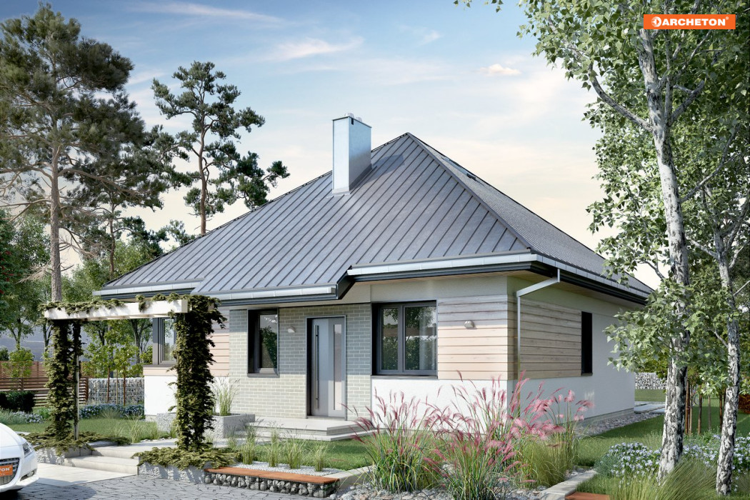 Małe, parterowe domy bez garażu mają w ofercie Archetonu liczną reprezentację. Są proste, tanie w budowie, nadają się na małe bądź wąskie działki, także te letniskowe. Projekt domu Fiołek jest pierwszym o powierzchni ok. 70m2, który przekryty został dachem czterospadowym bez kalenicy. Zadecydował o tym kwadratowy rzut i założenie nieużytkowego charakteru poddasza. Program funkcjonalny mieszkania składa się z otwartej strefy holu, kuchni i salonu, zespołu dwóch sypialni z łazienką i z kotłowni dostępnej z sieni. Jeden komin w centrum rzutu Fiołka obsługuje kuchnię, kocioł gazowy i kominek usytuowany w otwartym pokoju dziennym. Projekt domu Fiołek charakteryzuje zwarta, energooszczędna sylwetka. Elewację frontową i ogrodową akcentują jedynie opuszczone daszki, osłaniające wejście i taras. Wizualizacja proponuje wpisanie układu okien i drzwi w geometryczną kompozycję płaszczyzn wypełnionych różnymi materiałami wykończeniowymi.