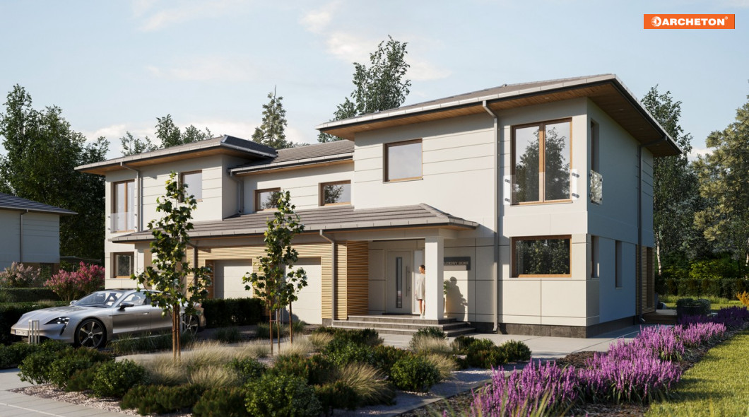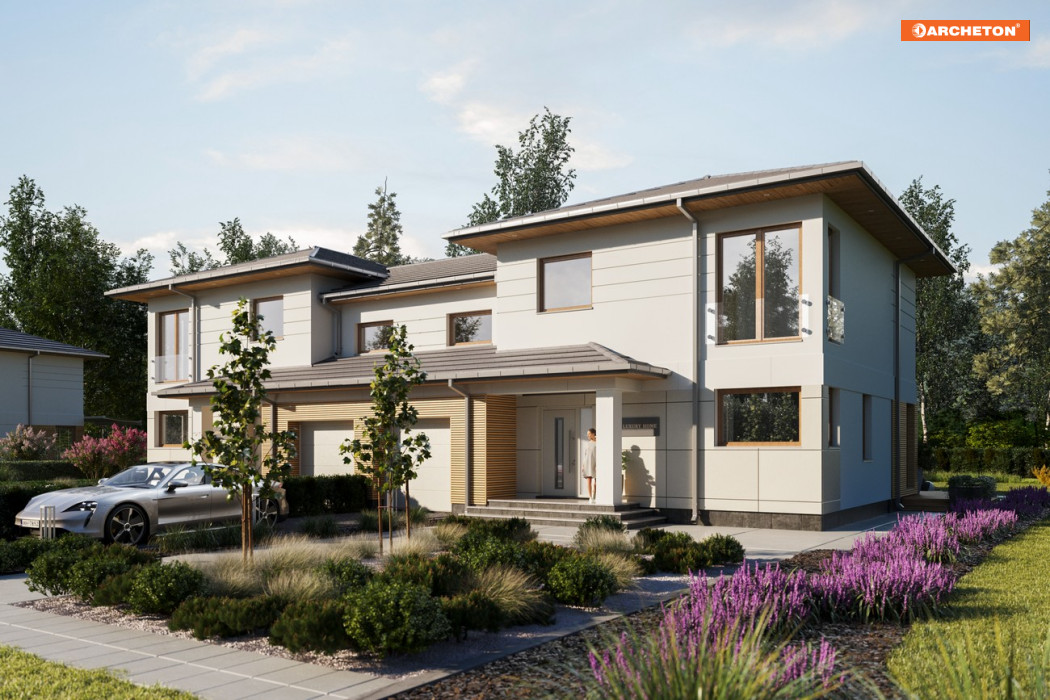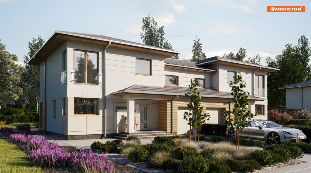 Tylko 15,1m szerokości musi mieć działka do zabudowy w granicy, aby zrealizować na niej projekt domu Igor Grota Duo. Wygodny, średniej wielkości dla 4-5 osób rozplanowano w części mieszkalnej na rzucie zwartego prostokąta i dostawiono do niego węższy, wysunięty ku frontowi, trakt garażu z kotłownią. Na parterze, oprócz przedsionka i WC przy obszernym, otwartym holu oraz spiżarni, zamknięto tylko przestrzeń pod częścią biegu klatki schodowej. Pokój dzienny jest dzięki temu niezwykle przestronny, z mnóstwem światła wpadającego z czterech stron świata, m.in. przez narożne okna jadalni i kuchni. Podział schodów na biegi różnej długości pozwolił wydzielić na osobnym poziomie gabinet z łazienką i pralnię dostępną z podestu, a główną część nocną na piętrze właściwym. Trzy sypialnie i kolejna łazienka mają tu bardzo wygodne rozmiary. Częściowe podpiwniczenie, dostępne z garażu, mieści pomieszczenia gospodarcze i hobby. Prostopadłościan głównej bryły w projekcie domu Igor Duo przykrywa czterospadowy, niezbyt stromy dach, a część garażową - dwuspadowy. Zadaszenie nad tarasem wejścia głównego ciągnie się aż nad wjazd do garażu i rysuje w elewacji efektowne poziome akcenty. Współczesny styl podkreślają okna bez podziałów.