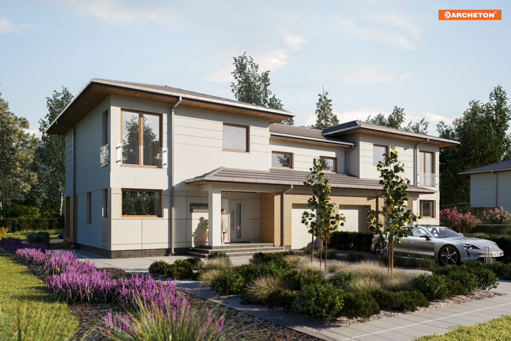 Dwa wygodne lokale mieszkalne proponuje projekt piętrowego domu jednorodzinnego Igor Grota Duolit. Rozplanowano je tak, jak w wariancie do zabudowy bliźniaczej - w projekcie domu Igor Grota Duo. Do części mieszkalnej dostawiono, przesunięty ku frontowi, garaż z kotłownią. Na parterze, oprócz przedsionka i WC, zamknięto tylko przestrzeń pod częścią klatki schodowej. Pokój dzienny jest dzięki temu niezwykle przestronny, oświetlony z trzech stron świata. Duża kuchnia ma sporą spiżarnię i ergonomiczny układ sprzętów. W centrum znalazł się tu barek na szybką poranną kawę. Podział schodów na biegi różnej długości wydzielił na osobnych poziomach pokój z łazienką i pralnię oraz wyżej - główną część nocną z trzema sypialniami. Częściowe podpiwniczenie, dostępne z garażu, mieści pomieszczenia gospodarcze i hobby. Zdyscyplinowany prostopadłościan bryły głównej ma czterospadowy, niezbyt stromy dach z krótką kalenicą a część garażową - dwuspadowy. Wejścia główne są oddzielone garażami i akcentowane daszkiem na słupie. Narożne okna salonu i kuchni dają poczucie prywatności. Nowoczesny styl podkreślają narożne okna salonu i kuchni oraz przeszklenia z barierką zamiast balkonów. Wszystko to decyduje o willowym, reprezentacyjnym wyglądzie.