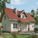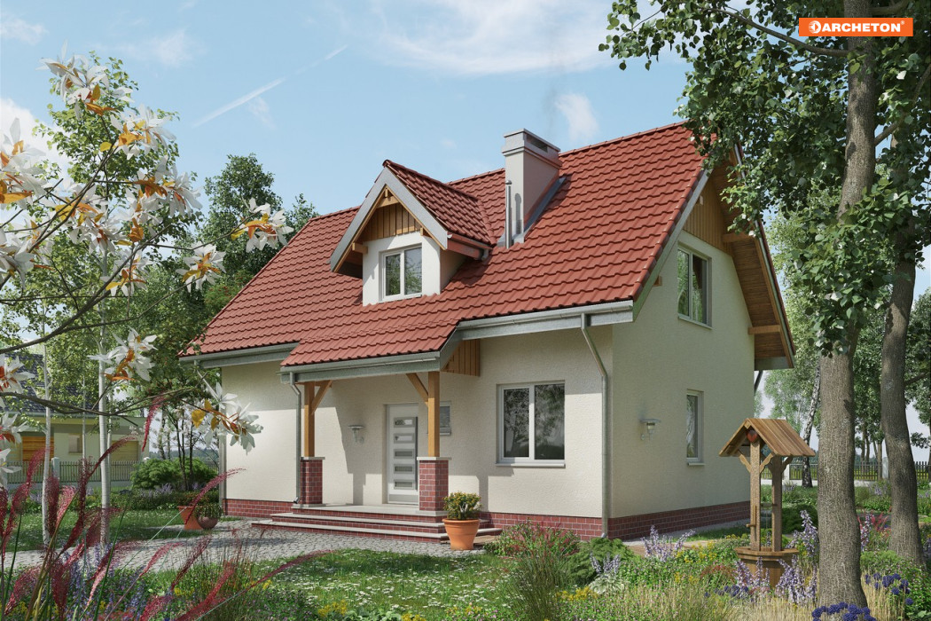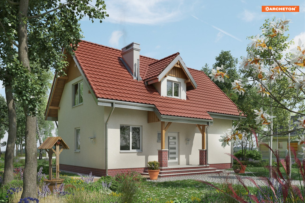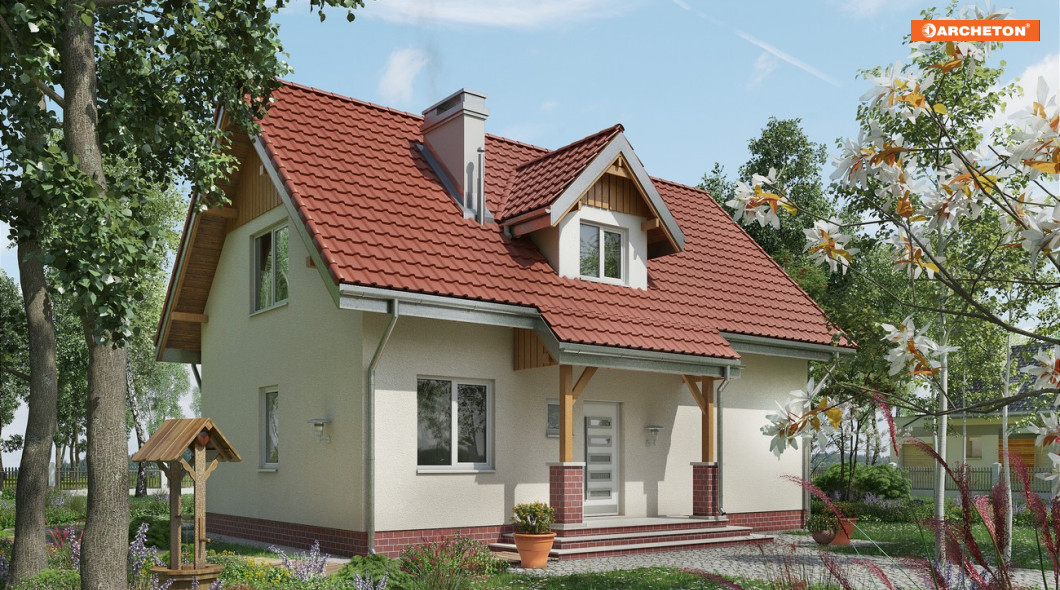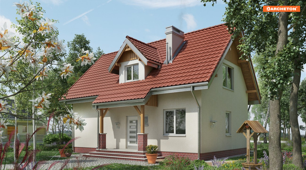 Mały, malowniczy dom przeznaczony dla 4-osobowej rodziny. Wejście przez sień do holu. Z holu dostepne są: pokój dzienny, w.c., kuchnia z jadalnią. Na poddaszu mieszczą się 3 pokoje sypialne (w tym jeden z własną garderobą) i łazienka. Zwarta energooszczędna bryła nakryta prostym dwuspadowym dachem o kącie nachylenia połaci 45°, urozmaiconym lukarną. Charakterystyczne podcienie nad wejściem i wyjściem do ogrodu.