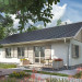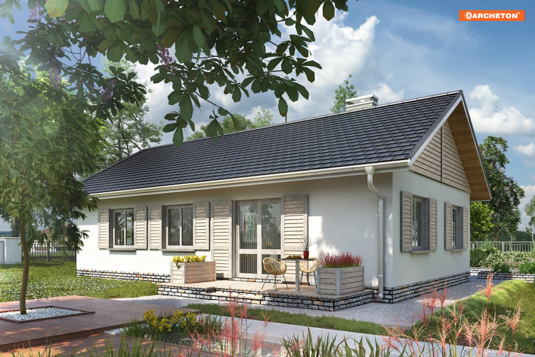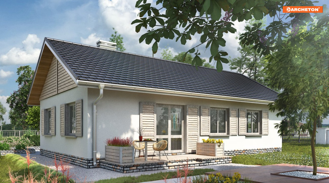 Projekt domu Żuczek-2 jest mniejszym wariantem w Rodzinie Żuczka, powstałej z myślą o działkach z wjazdem od południa. Niewielkie domy parterowe i garaż połączono w niej wspólnym przedsionkiem z dużą kotłownią. Obie części budynku utworzyły bryłę na planie litery T, przekrytą dwuspadowymi, przenikającymi się dachami. Część mieszkalna, nieco wyższa, wysuwa się ku fontowi, zwrócona do niego ścianą szczytową. Dzięki temu z tarasu wejściowego powstało praktyczne patio częściowo osłonięte podcieniem na słupach, a strefa rekreacyjna ogrodu oddzielona została od wjazdu. Mieszkanie, we wszystkich wariantach Żuczka, to wygodne lokum dla 3-4 osobowej rodziny. Tradycyjnie podzieloną strefę dzienną (salon + kuchnia ze spiżarnią) z wyjściem na taras odseparowano od położonej w głębi posesji części prywatnej z trzema sypialniami i łazienką przy pomocy holu z dużą szafą i z wc Projekt domu Żuczek-2 jest o kilka m2 mniejszy od Żuczka Sto. Bardziej zwarty zarys ścian zewnętrznych salonu oraz typowe w układzie i wysokości okna tej wersji sprzyjają tradycyjnemu wykończeniu elewacji.