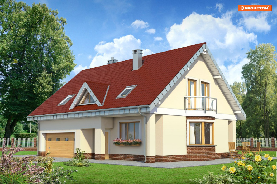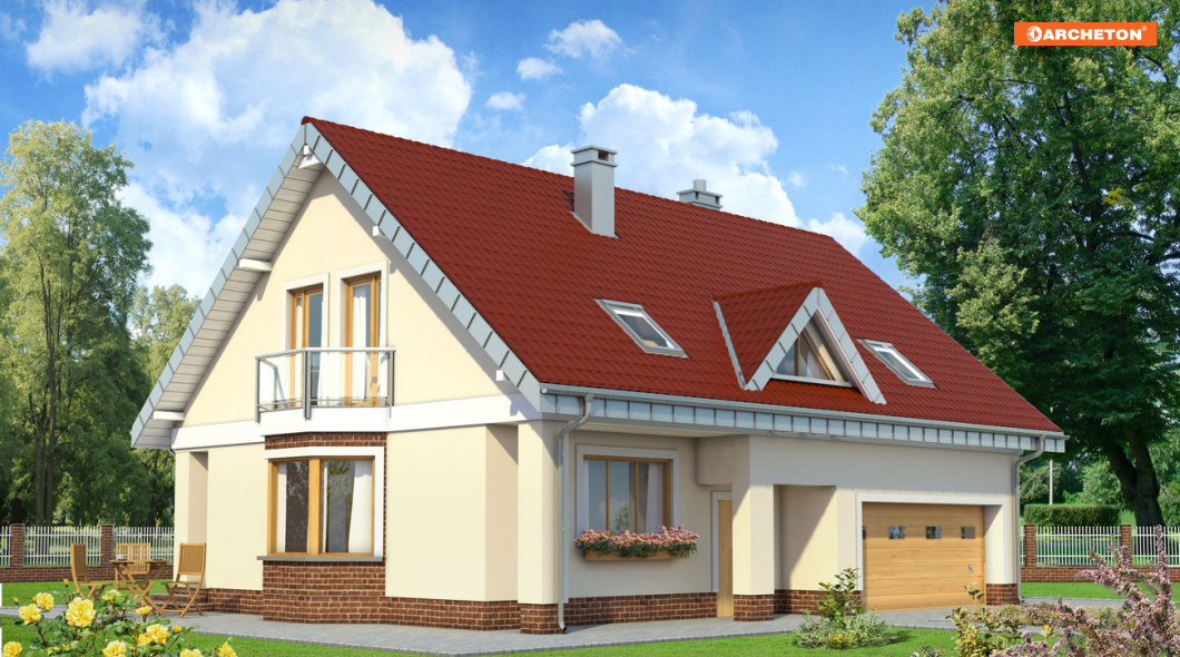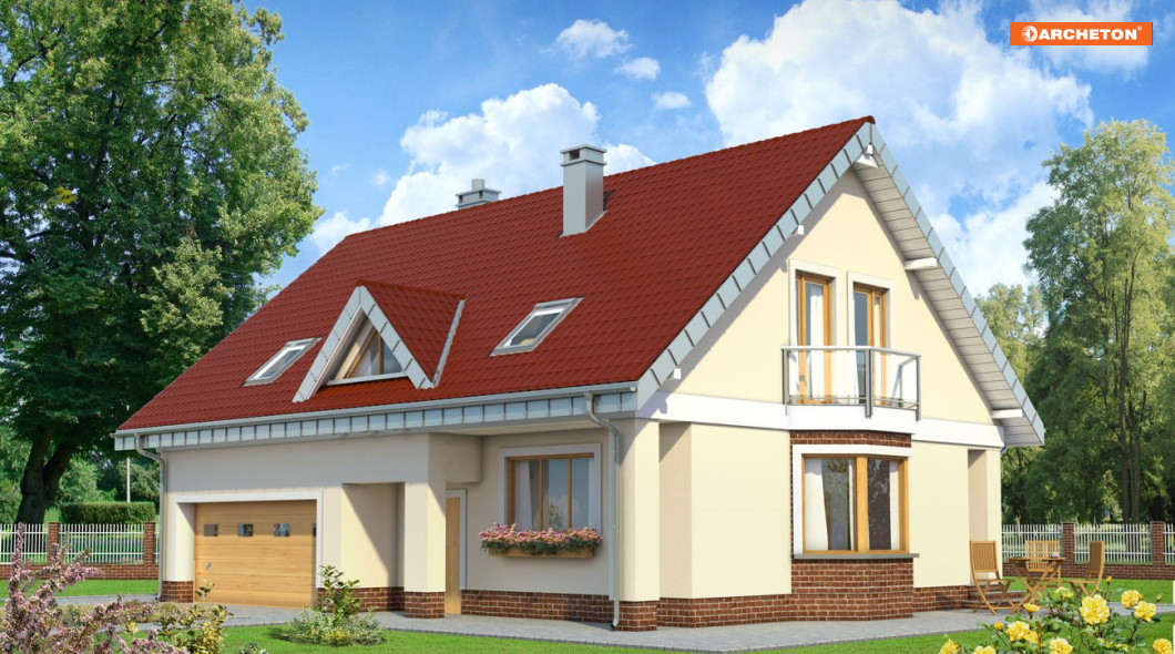 Budynek jest obiektem niepodpiwniczonym z poddaszem użytkowym. Na parterze zaprojektowano pokój dzienny z jadalnią, kuchnię, spiżarnie, gabinet, łazienkę, hol, sień, kotłownię oraz garaż. Na poddaszu znajdują się 4 sypialnie, hol oraz łazienka. Zasadniczą bryłę budynku tworzy prostopadłościan o horyzontalnym układzie nakryty dachem dwuspadowym o kącie nachylenia połaci 40 stopni.