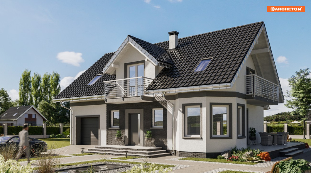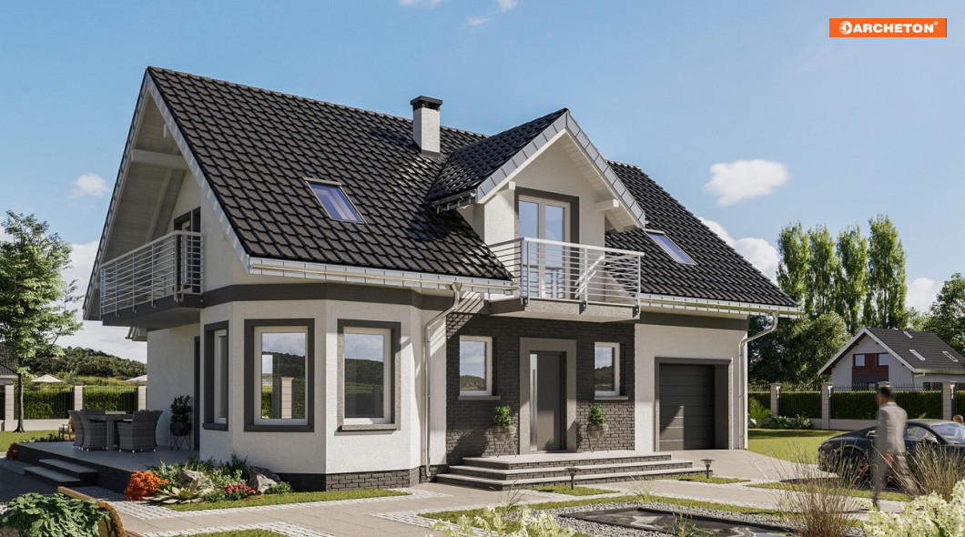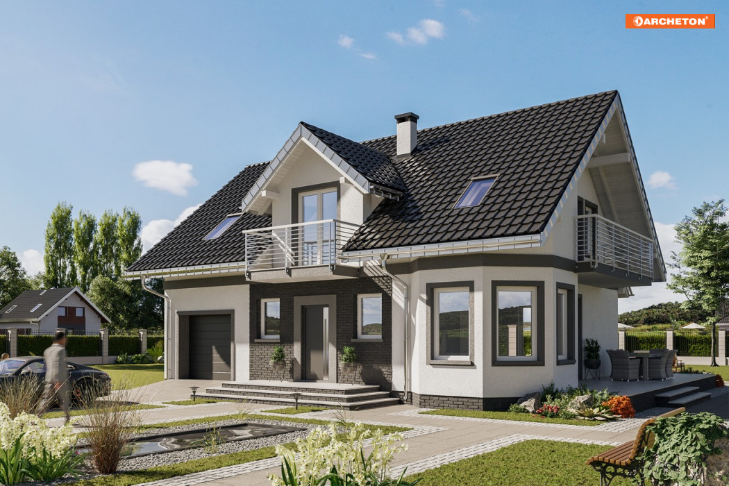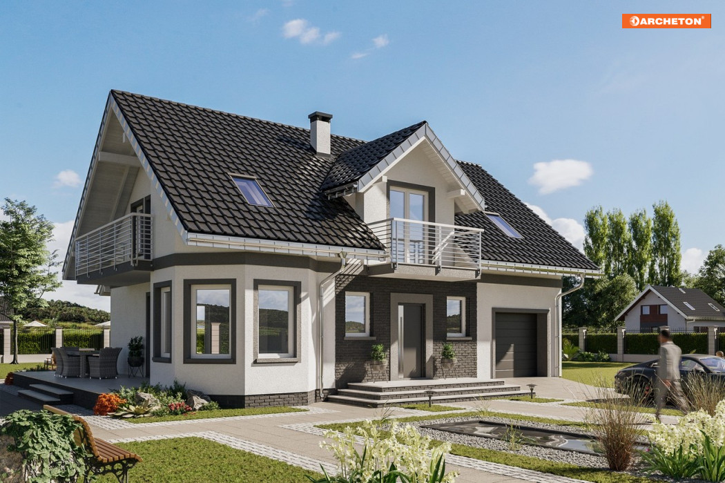 Ekonomiczne atuty projektu, idealnego docelowo dla 5-osobowej rodziny, podbijają niewątpliwe walory plastyczne bryły. Dekoracyjny ryzalit jadalni, lukarnę akcentującą fronton i balkony w ścianach szczytowych zaprojektowano lekko i nowocześnie.