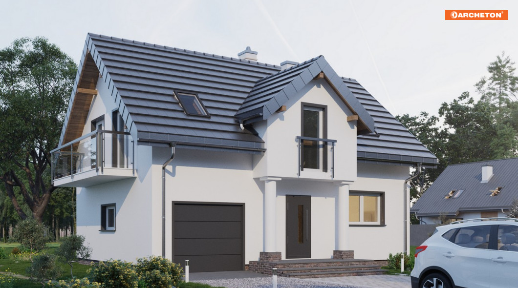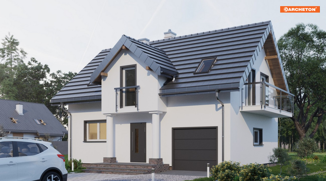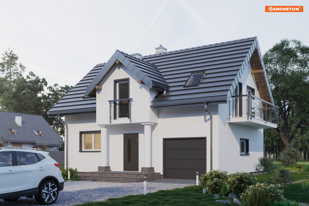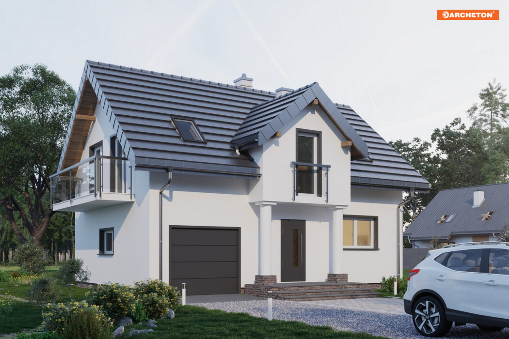 Rodzina Tomira to jedna z różnorodnych grup ekonomicznych propozycji domów parterowych z użytkowym poddaszem i wbudowanym garażem o zwartym prostokątnym zarysie i dwuspadowym dachu, z przedziału wielkości 85-110 m2 p.u. Projekt domu Tomir Lux – średni wielkością w rodzinie - wyróżnia wejście osłonięte wysuniętym elementem z lukarną na słupach. Czytelny podział rzutu ścianami nośnymi na trzy strefy funkcjonalne przypomina pozostałe warianty. Najwęższa część wejściowa z holem i schodami na poddasze rozdziela szerszy trakt gospodarczy i najprzestronniejszy - pokój dzienny. We wszystkich wersjach Tomira salon i kuchnia tworzą jedną, dobrze oświetloną przestrzeń. Miejsce pod schodami wykorzystano na wc, przez co (inaczej niż w mniejszym Tomirze) kotłownia dostępna jest tylko z garażu. Pomieszczenia drugiej kondygnacji to trzy wygodne sypialnie dla 5 osób, niewielki gabinet i duża, jasna łazienka. Proste rozwiązania architektoniczne urozmaicono balkonami w ścianach szczytowych, co razem z dekoracyjnym detalem frontu decyduje o najbardziej malowniczym charakterze bryły projektu domu Tomir Lux wśród wszystkich rodzinnych koncepcji.