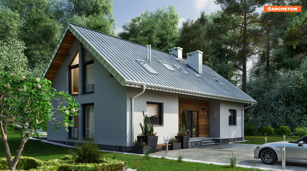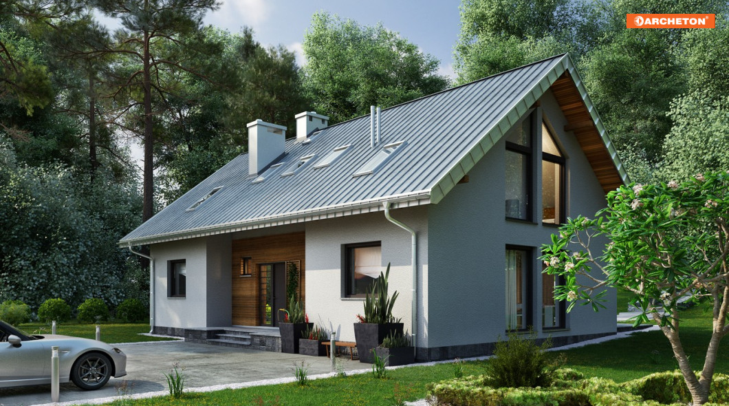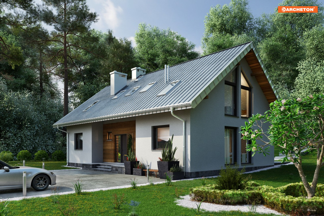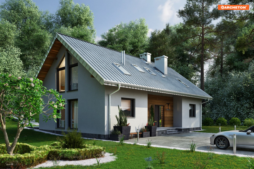 Projekt domu Linda jest wyjątkowy w ofercie średniej wielkości domów z użytkowym poddaszem, bez garażu. Powstał z myślą o inwestorach ceniących wyszukaną prostotę oraz bezkompromisową harmonię między funkcją, formą i konstrukcją w architekturze. Prostokątny rzut podzielono poprzecznie, z zachowaniem symetrii, na trzy części. Najszersza – środkowa, z sienią, holem i salonem, została wsunięta w stronę ogrodu tworząc wejściową wnękę oraz przeszklony ryzalit na tarasie ogrodowym. Po lewej stronie rozlokowano kuchnię z jadalnią, a po prawej osobny pokój z łazienką i dużą kotłownię. Układ poddasza powtarza dokładnie plan parteru proponując główną sypialnię z garderobą, komfortową łazienkę i dwa mniejsze pokoje – wszystkie pomieszczenia dostępne z otwartej na salon antresoli. Projekt domu Linda to dużo wolnej przestrzeni: salon jest wysoki aż po dach, a rozsuwane drzwi balkonowe mogą go latem dodatkowo powiększyć. Wyraźne strefowanie poszczególnych funkcji mieszkania ułatwiło symetryczne, eleganckie skomponowanie elewacji. Dwuspadowy dach z kalenicą równoległą do drogi dojazdowej jest gładki, bez lukarn, co podkreśla nienaganną linię sylwetki.