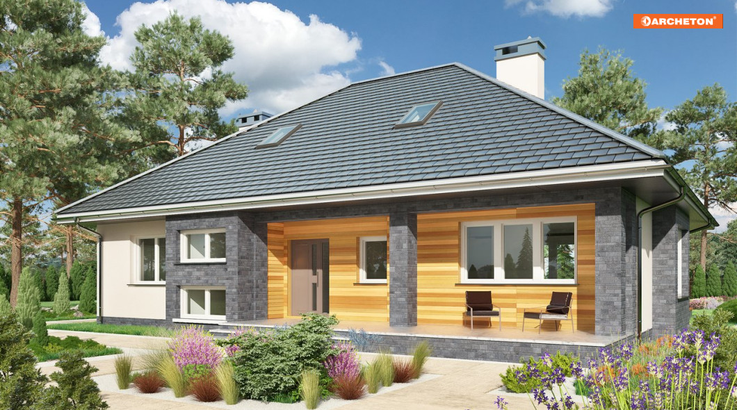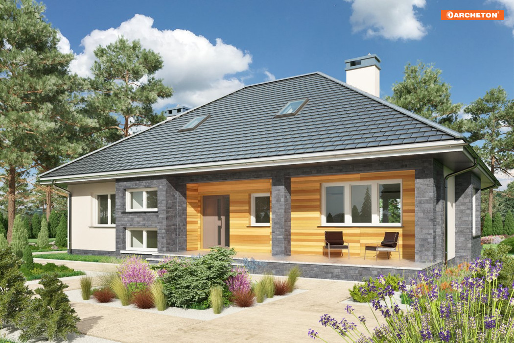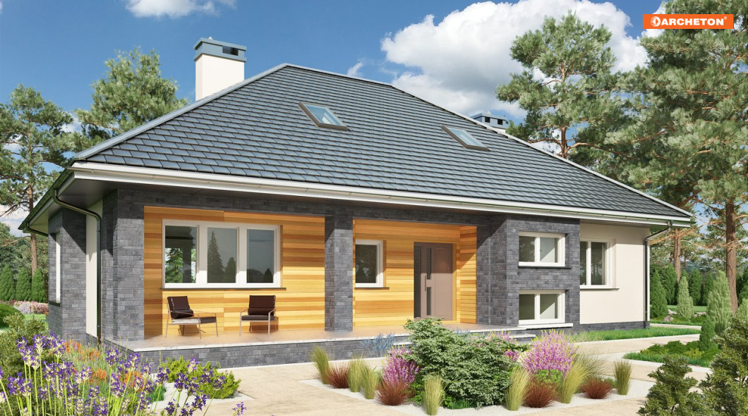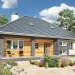 Rodzina Reginy to projekt domu parterowego dla 4 osób, o pow. ok 120m2, bez garażu w kilku rozwiązaniach. Wszystkie mają bryłę na planie prostokąta, okrojonego od frontu i od ogrodu tarasami z głębokimi okapami na słupach. Wnęki obejmują otwartą na hol część dzienną mieszkania z wyjątkowo dużym salonem. Projekt domu Regina Ultra proponuje przesłonięcie kuchni ze spiżarnią kominkiem i jest wariantem z piwnicą. Zlokalizowano w niej szereg pomieszczeń gospodarczych z dużą kotłownią. Strefa prywatna z dużą łazienką położona jest w głębi holu i odseparowana od części wejściowej zespołem małej łazienki oraz klatki schodowej. Rodzina Reginy to budynki z czterospadowym dachem, z kalenica równoległą do drogi dojazdowej. Proponują różne warianty nachylenia połaci i wykorzystania poddasza. Projekt Regina Ultra, ze spadkiem 35°, oferuje nad parterem przestrzeń użytkową, możliwą do wykorzystania, dzięki klatce schodowej, np. w drugim etapie budowy. Stosunkowo stromy dach decyduje o tradycyjnym charakterze sylwetki. Elewacje skomponowano podkreślając drewnianą boazerią wnęki podcieni, a ryzalit jadalni i słupy okładzina kamienną.