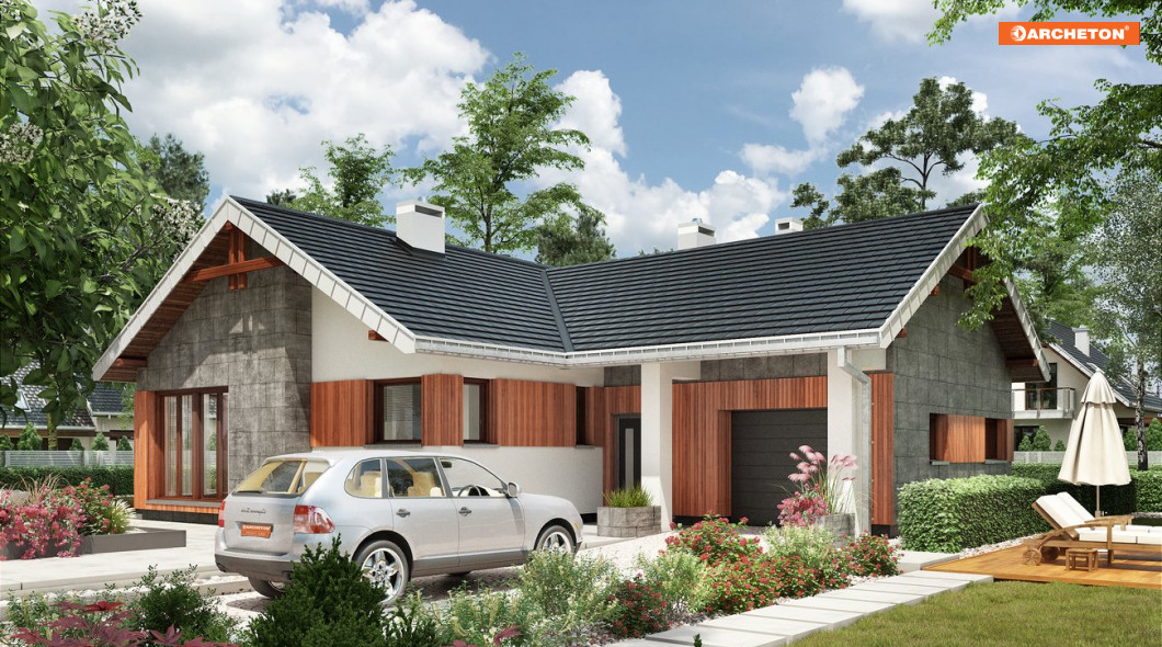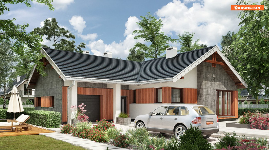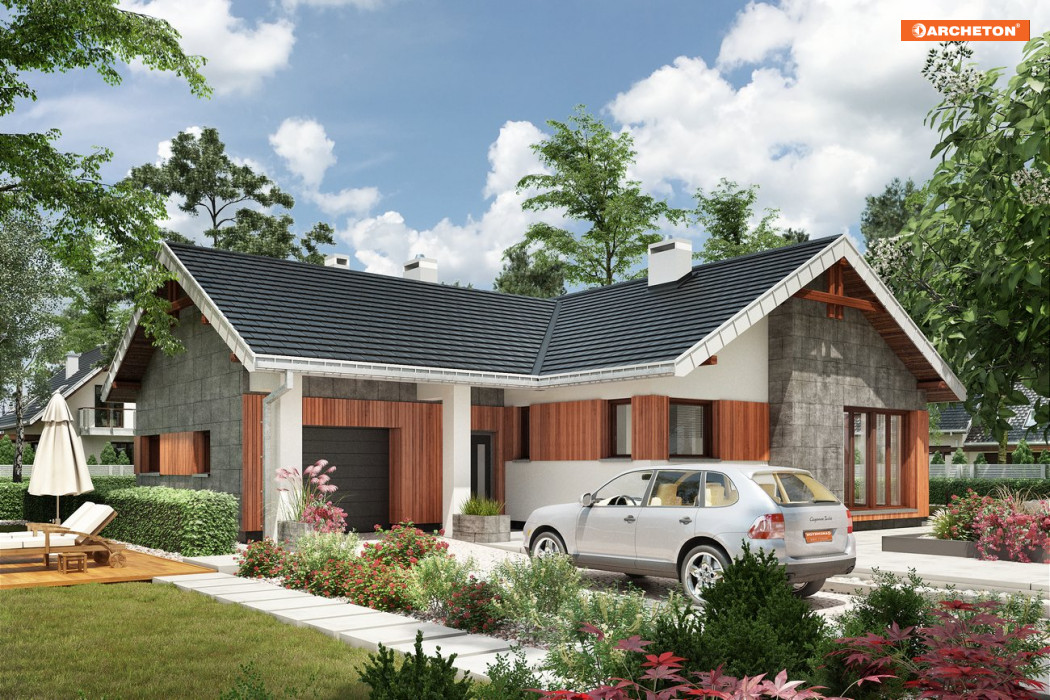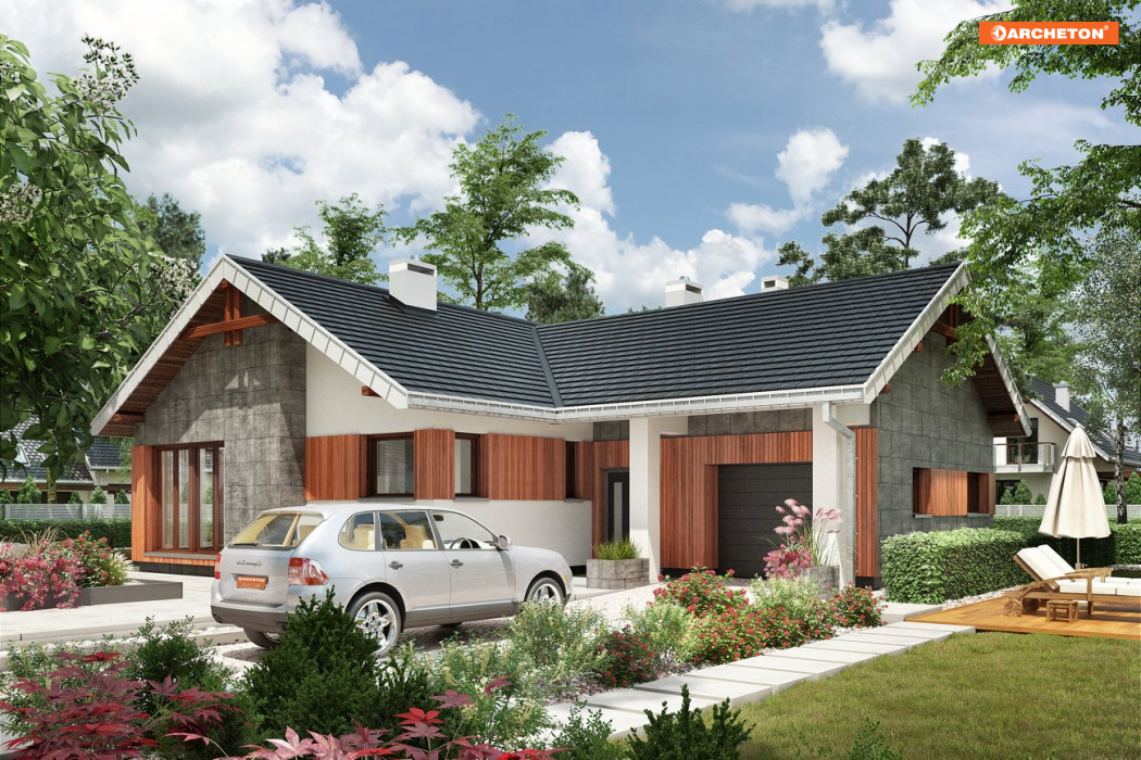 Projekt domu Żuczek Sto jest nieco większy od Żuczka, dzięki wysunięciu w głąb ogrodu, narożnej części salonu. Ten detal z wysokimi przeszkleniami oraz narożne okna w kuchni i w głównej sypialni sugerują wykończenie elewacji w stylu nowoczesnej willi miejskiej.