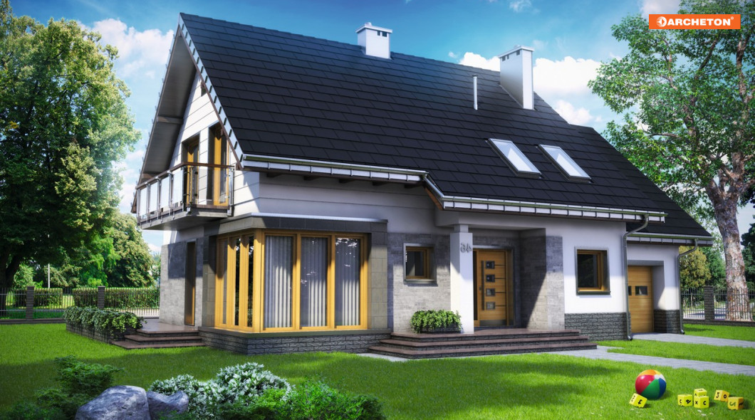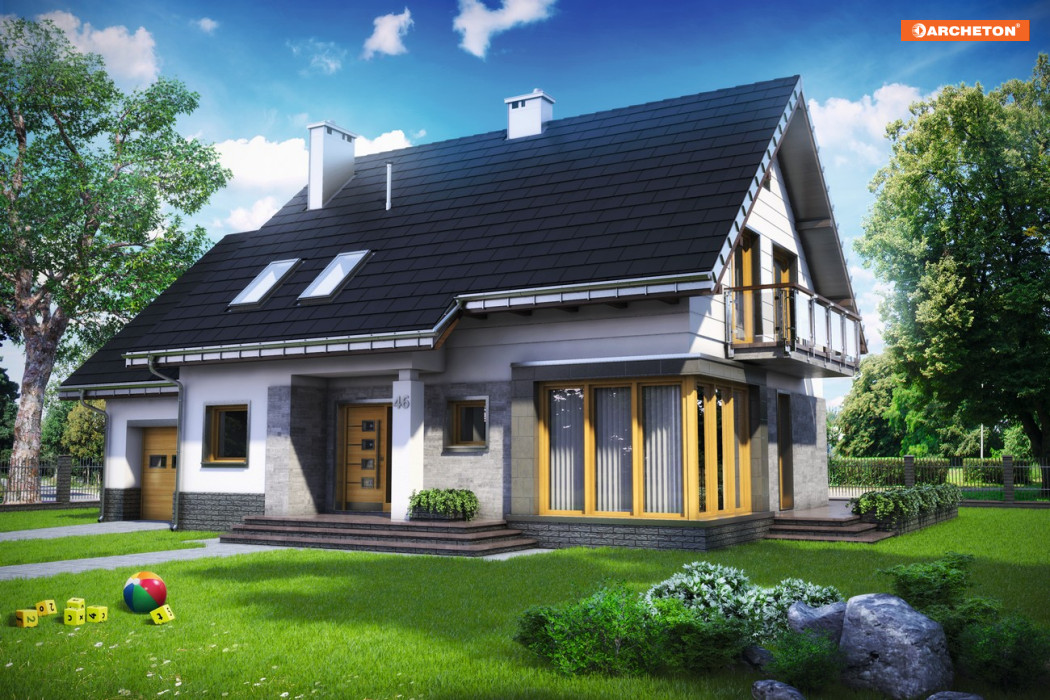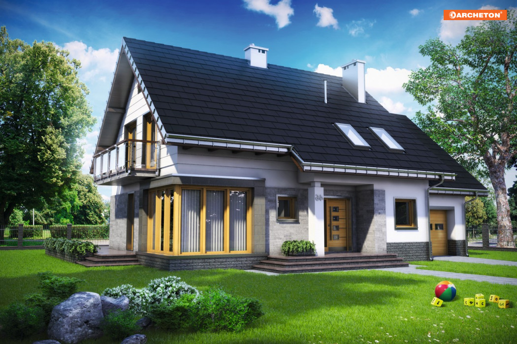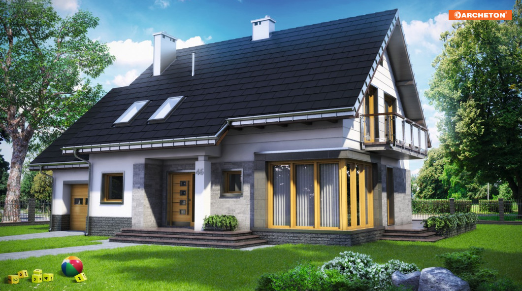 Wśród domów o powierzchni użytkowej ok. 125m2 z garażem i dodatkowym pokojem na parterze projekt domu Bruno Rex przyciąga uwagę kontrastowym zestawieniem głównych elementów bryły. Dwuspadowy dach z kalenicą równoległą do drogi dojazdowej jest prosty, bez lukarn. Urozmaicony jest natomiast zarys ścian zewnętrznych - zarówno w parterze jak i na poddaszu. Wejściowy i ogrodowy taras osłaniają podcienie na słupach, a dodatkowo rzut parteru wzbogaca narożny ryzalit z jadalnią przy kuchni. Połączony z nią przestrzennie, otwarty także na hol salon, oddziela kominek. Kotłownię przewidziano przy wejściu i połączono z długim garażem, w którym można wydzielić od ogrodu schowek na narzędzia. Zabiegowe schody z wbudowanym wejściem do łazienki prowadzą w projekcie domu Bruno Rex do strefy nocnej, gdzie znalazły się trzy sypialnie dla czterech osób, duża łazienka i pralnia. Przestrzeń nad garażem jest nieużytkowa, inaczej niż w sporo większej wersji Bruno. Proste biegi i inne ustawienie klatki schodowej oraz kotłowni pozwalają w niej na wygodny dostęp do kolejnej sypialni. Decyduje to o powiększeniu powierzchni użytkowej budynku przy takich samych wymiarach jego obrysu.