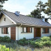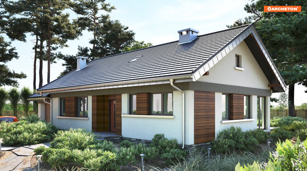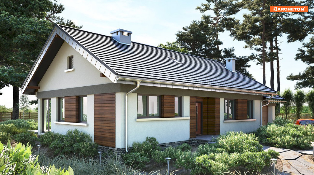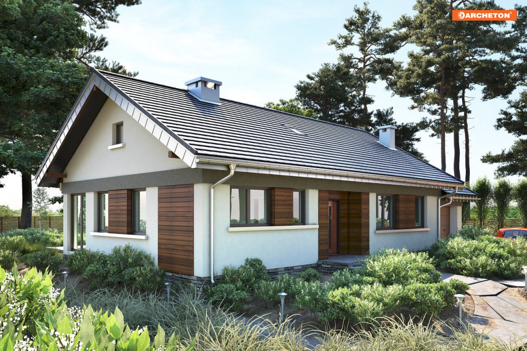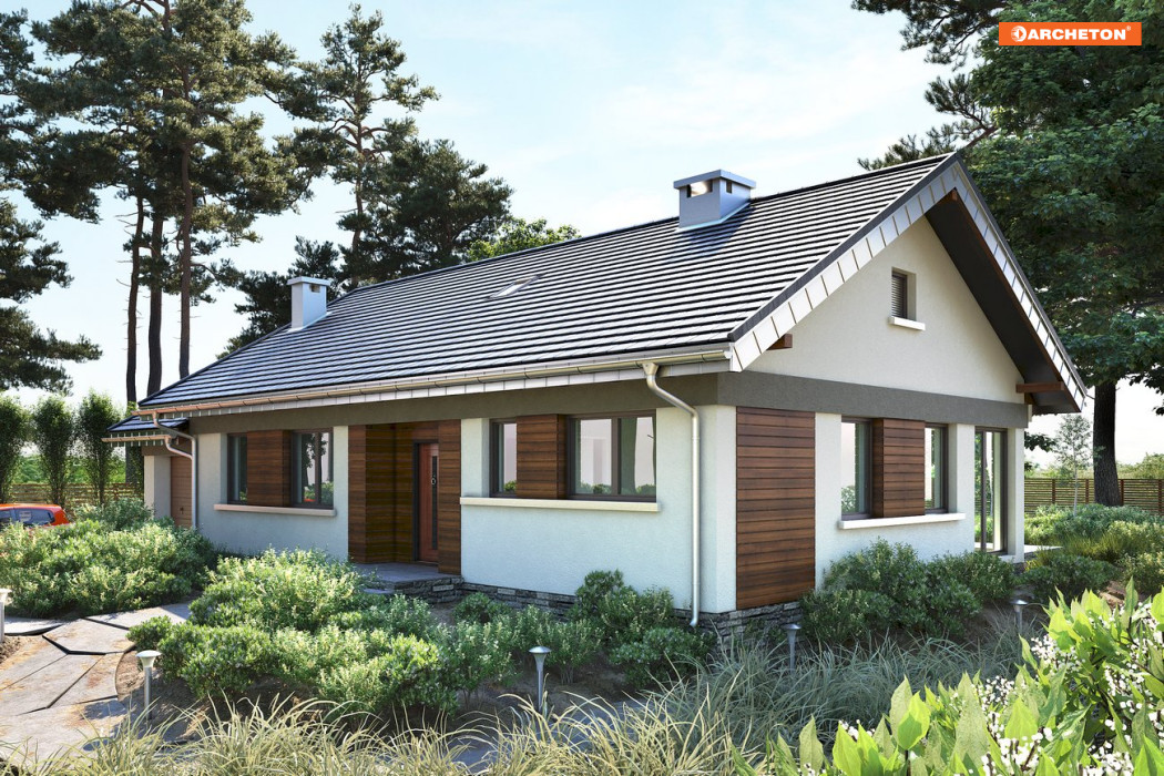 Nawet mały dom parterowy, zaprojektowany energooszczędnie na planie zwartego prostokąta z dobudowanym garażem, nie uniknie wydłużonych proporcji. Projekt domu Milan jest zbliżony układem i wielkością do Lilaka czy Bytomira, ale proponuje inny sposób kształtowania takiej formy z dwuspadowym dachem. Część mieszkalną urozmaica wejściowa wnęka, a garaż z kotłownią mają zwężony trakt i chowają się za główną bryłę dzięki cofniętym elewacjom i niższej kalenicy. Plan mieszkania dzieli wzdłuż na połowy ściana nośna. Trzy sypialnie z dwoma łazienkami to standardowe rozwiązanie w tej wielkości domach, ale projekt domu Milan zwraca uwagę wyjątkowo przestronnym pokojem dziennym. Otwarty salon z kominkiem połączony jest z bardzo dużą kuchnią, która, przez przechodnią spiżarnię, dostępna jest też z sieni. Wygodna strefa wejściowa zmienia się z holu w przedpokój części prywatnej, zamknięty na końcu pralnią i przejściem do garażu. Rysunek drzwi i okien Milana jest swobodny i dostosowany do optymalnego doświetlenia pomieszczeń. Dla uporządkowania kompozycji elewacji zaproponowano w wizualizacji pasy drewnianej boazerii zewnętrznej.