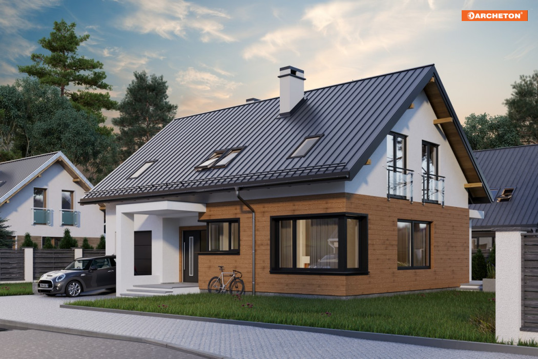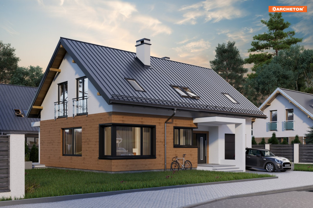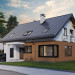Projekt domu Omega Dron wyróżnia najprostsza sylwetka w kategorii obejmującej domy z użytkowym poddaszem, z wbudowanym garażem, z dachem dwuspadowym, o powierzchni ok. 120m2. Część gospodarcza z dużą kotłownią dostępna jest z sieni, która razem z holem i z dużą łazienką zajmuje kolejny trakt zwartego, parteru. Oryginalny układ Omegi przewiduje dalej schowek pod schodami, dostępny wygodnie z kuchni naprzeciwko. Dzięki temu front ma jeszcze miejsce na jadalnię, a salon tworzy z nią rozległą przestrzeń na całej szerokości domu. Pokój dzienny, oświetlony jest z trzech stron, co daje Omedze przewagę na różnie położonych, w stosunku do stron świata, parcelach. Kominek ulokowany w centrum rzutu zręcznie oddziela kuchnię i upraszcza dystrybucję gorącego powietrza na poddasze. Jest tu miejsce na cztery pokoje, w tym główną sypialnię z garderobą. Projekt domu Omega Dron charakteryzuje bardzo energooszczędna bryła bez balkonów i lukarn w dachu. Front akcentuje jedynie wejściowa wnęka osłonięta płaskim daszkiem na parawanowym, szeroki m słupie. Elewację ogrodową urozmaica efektowna pergola nad tarasem niesiona przez trzy masywne słupy.