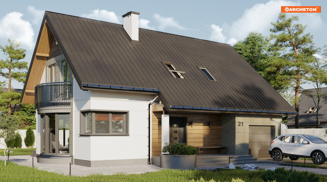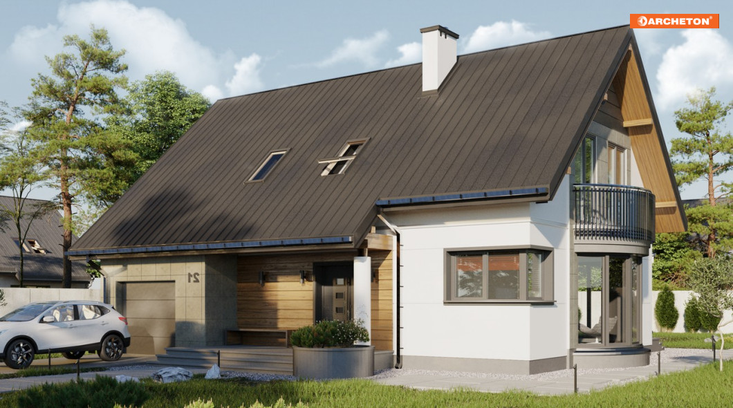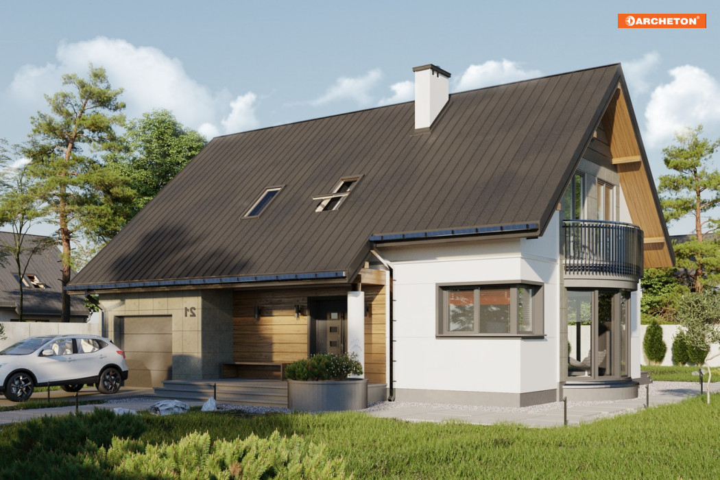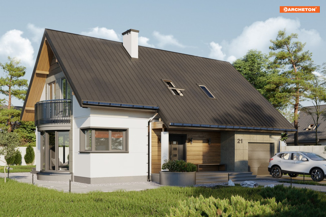 Projekt domu Alba łączy energooszczędne rozwiązanie z efektownym detalem, a przy tym stosunkowo niewielką powierzchnię z elementami komfortu. Grupa obejmująca domy parterowe z użytkowym poddaszem o powierzchni ok. 125m, na planie prostokąta, z wbudowanym garażem i z dwuspadowym dachem nie miała dotąd w ofercie Archetonu propozycji z jadalnią w półkolistym ryzalicie. Jest to główny element parteru Alby, sąsiadujący z dużą kuchnią i z otwartym pokojem dziennym. Pozostałą część parteru zajmuje komunikacja z wygodnymi miejscami do przechowywania oraz strefa gospodarcza z dużą kotłownią. Wyjątkowo przestronna część dzienna rekompensuje umiarkowaną powierzchnię pomieszczeń poddasza. Oferuje ono, oprócz trzech sypialni , gabinet, łazienkę i pralnię. Główna sypialnia nad garażem ma własną garderobę, łazienkę i oddzielona jest niewielką różnicą poziomów. Projekt domu Alba zwraca uwagę prostą, elegancką architekturą. Wysunięty ku frontowi wjazd do garażu ściąga nad wejście część okapu, tworząc głęboki podcień na słupie, podkreślony boniowaniem ściany. Narożne okno w kuchni i przeszklenie jadalni wpuszczają do wnętrza mnóstwo światła.