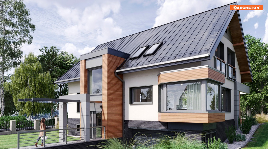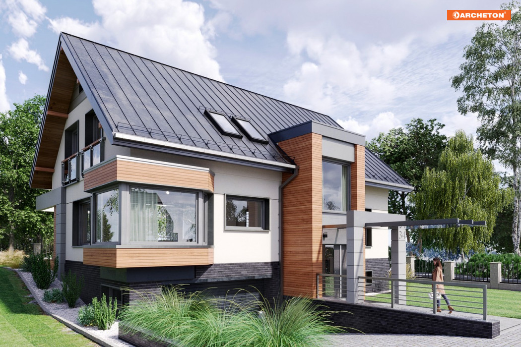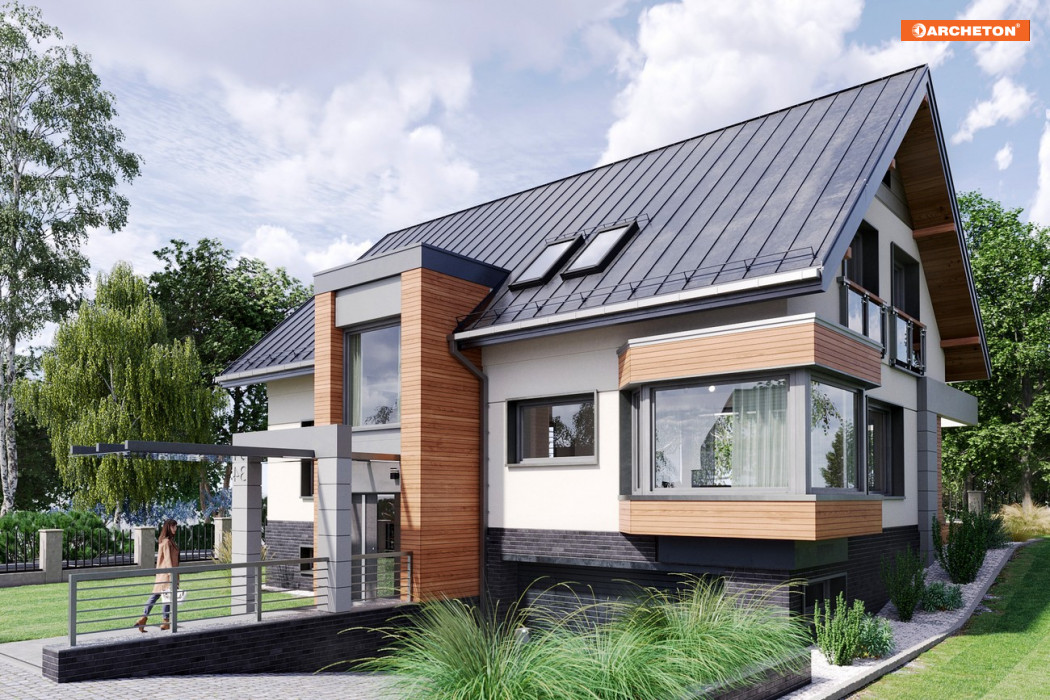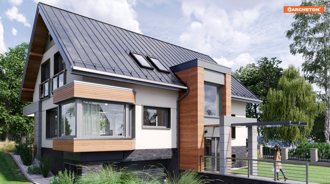 Projekt domu Agaton należy do kolekcji Moderna, łączącej tradycyjną sylwetkę domu z geometrycznym, nowoczesnym detalem.
