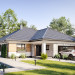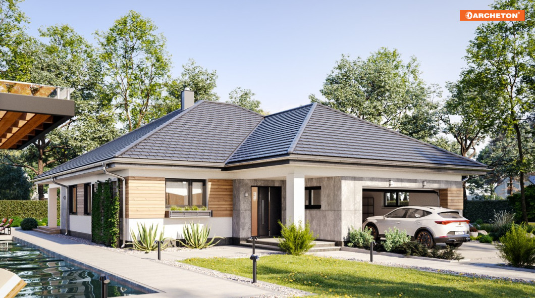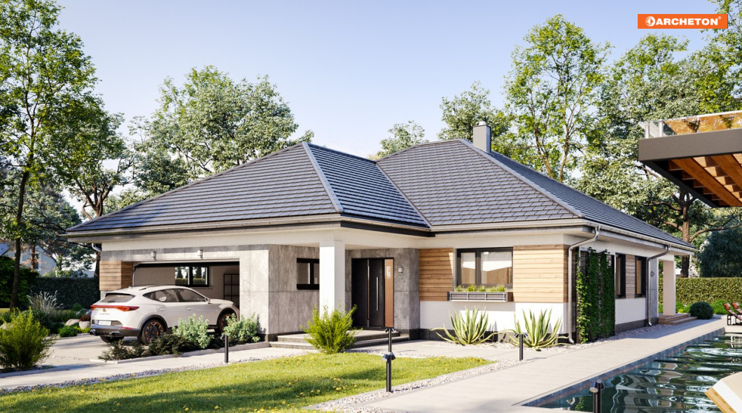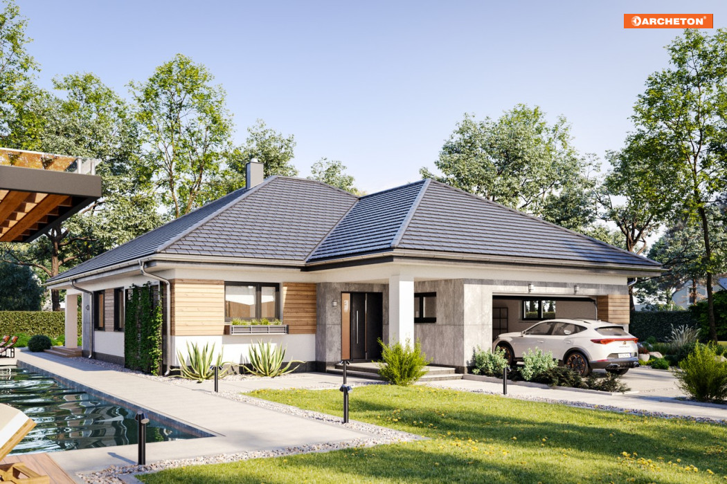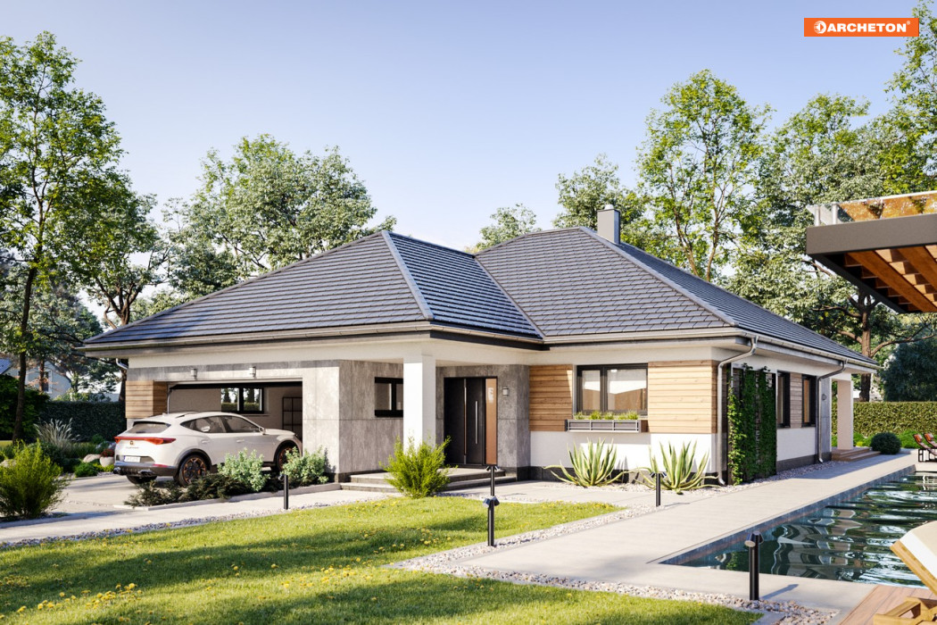 Projekt domu Koniczynka Polo G2 jest największym wariantem w rodzinie, z garażem dwustanowiskowym i z gabinetem. Znaczną długość skrzydła garażowego skrócono wizualnie uskokiem w elewacji ogrodowej, a rozbudowany w ten sposób rzut przekryto bardziej złożonym dachem. Poszerzony trakt sypialni został wyposażony w zespół z 2 łazienkami i praktycznie skomunikowany przez pralnię z dużą kotłownią. Wyjątkowo obszerna kuchnia, w przeciwieństwie do propozycji w siostrzanych wersjach, dostępna jest także z sieni. Od holu oddziela ją wnęka z wbudowaną szafą i lodówką, a od jadalni przy salonie – efektowny barek.