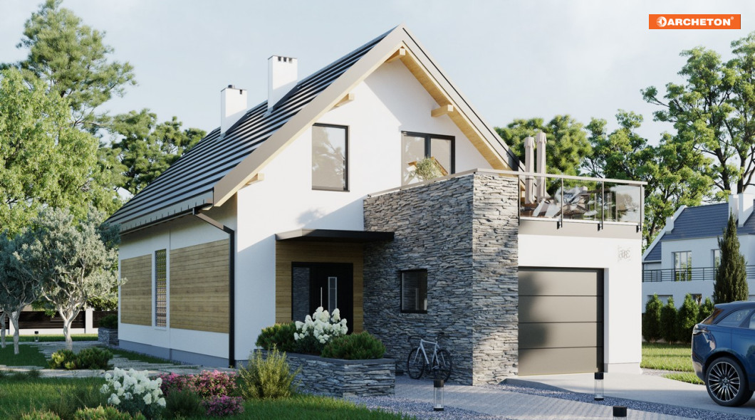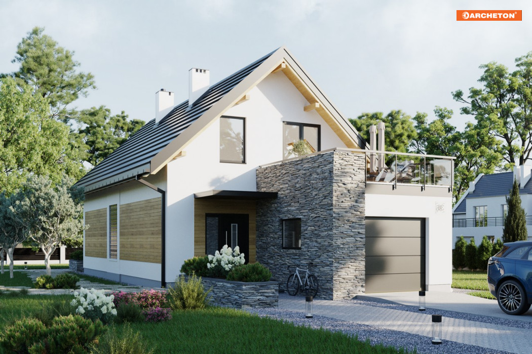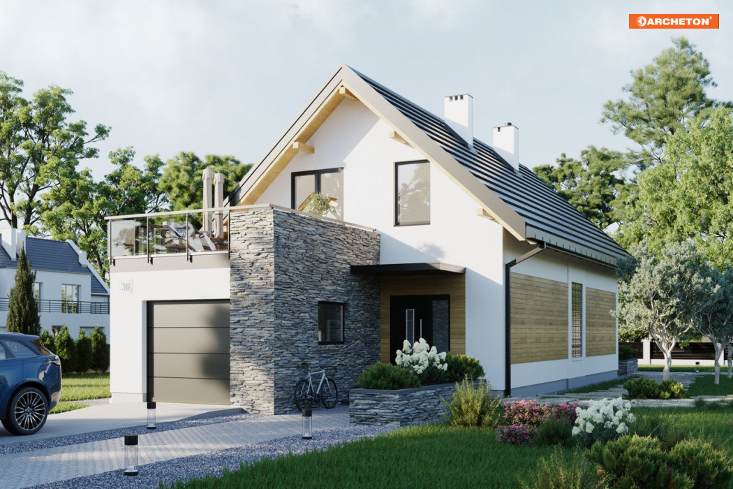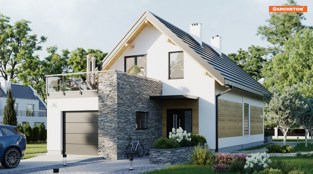 Teraz proponujemy projekt domu Lucek, który ma wydłużone, jak w budynkach szeregowych, proporcje, ale ścianę szczytową skierowaną na front posesji. Garaż, zwieńczony tarasem, wysunięto mocno ku wjazdowi akcentując i osłaniając wejście. Kolejne atuty Lucka to: przestronna, a przy tym jasna sień z obszernym miejscem na szafy ubraniowe oraz duża kotłownia na tyłach garażu. Otwarty parter przewiduje poza tym ustawną kuchnię z barkiem, jadalnię i salon z kominkiem. Przy schodach, na wprost kuchni ulokowano ustronny węzeł niewielkiej łazienki i pralni. Projekt domu Lucek ma na poddaszu trzy wygodne sypialnie, garderobę oraz piękny pokój kąpielowy doświetlony jedyną lukarną w prostym dachu. Główna sypialnia wyróżnia się wielkością i dostępem do otwartego z trzech stron tarasu, co, nawet przy ustawieniu domu wejściem na północ, daje możliwość korzystania ze słońca.