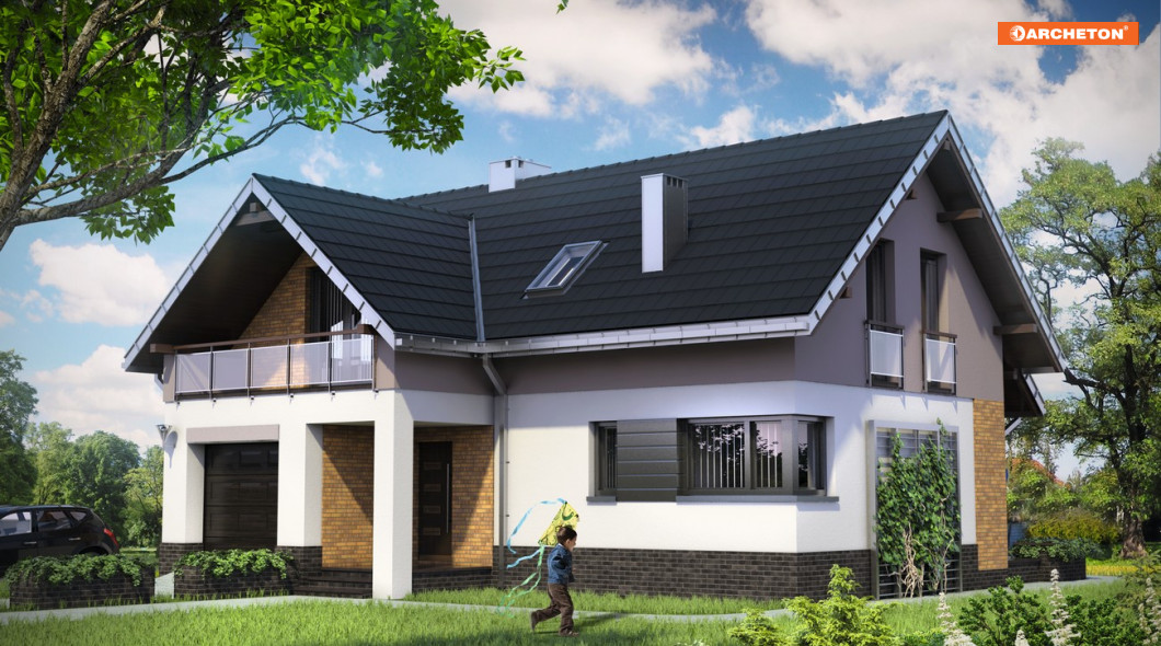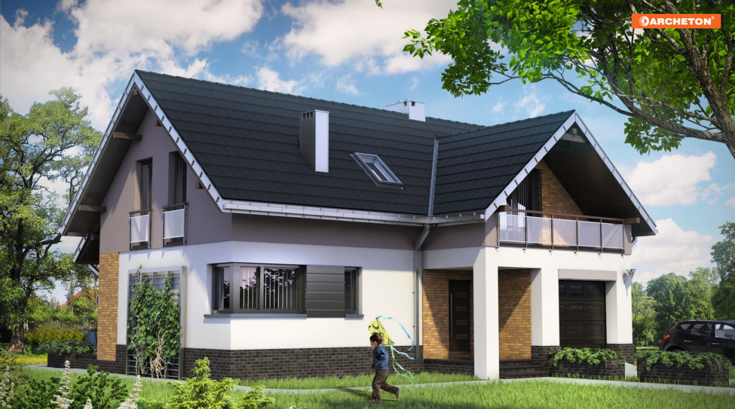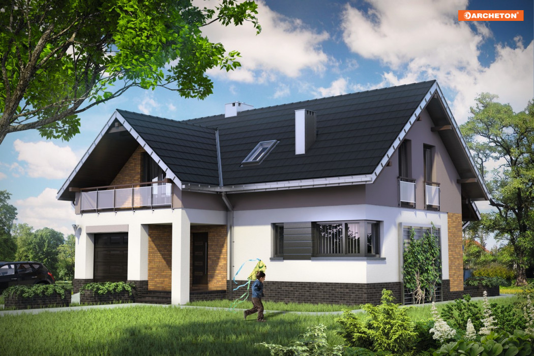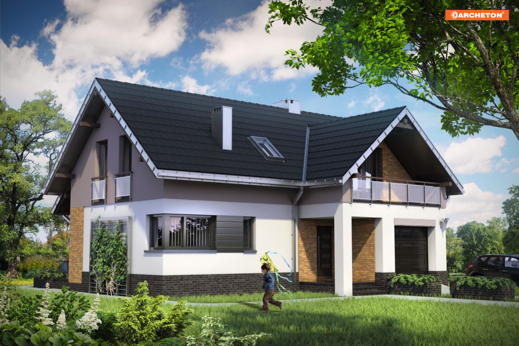 Projekt Wodnik Mały prezentuje najmniejszy z trzech wariantów powierzchni od 101 do 121m2 w Rodzinie Wodnika. Tworzą ją podobne projekty małych domów parterowych z użytkowym poddaszem, w których część mieszkalną i garaż przekrywa dach na planie w kształcie litery L. Skrzydło garażowe z loggią, wysunięto ku wjazdowi na działkę, pozostawiając wejście głębiej, w praktycznym podcieniu. Garaż posiada charakterystyczne, wygodne poszerzenie poza strefą wjazdu. Kalenica główna budynku jest równoległa do drogi dojazdowej tak, jak i wewnętrzna podpora konstrukcyjna w części mieszkalnej. Ściana nośna zasłania wc i schody dzieląc rzut na wejściową strefę kuchni i komunikacji oraz podłużny salon z kominkiem. Projekt Wodnik Mały jest najbardziej oszczędny w rodzinie, ale został wyposażony w najobszerniejszą kotłownię z wyjściem do ogrodu. Dom ma zabiegową klatkę schodową i dach bez lukarn. Zamiast drugiej loggii nad salonem, jak przewidują Wodnik i Wodnik As, w ścianie szczytowej zaproponowano jedynie pojedyncze, smukłe okna balkonowe. Prostota sylwetki Wodnika Małego podkreślona została nowoczesnym, narożnym oknem w kuchni.