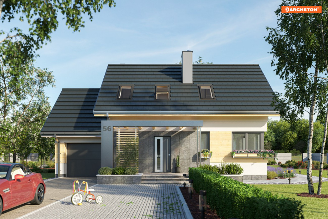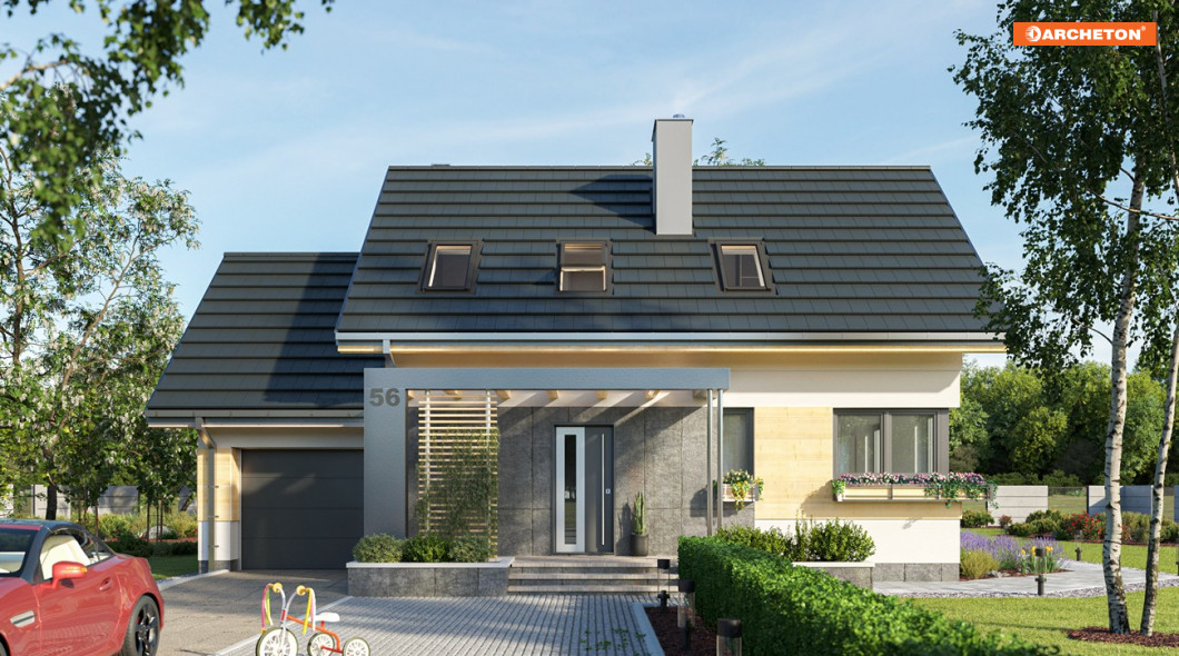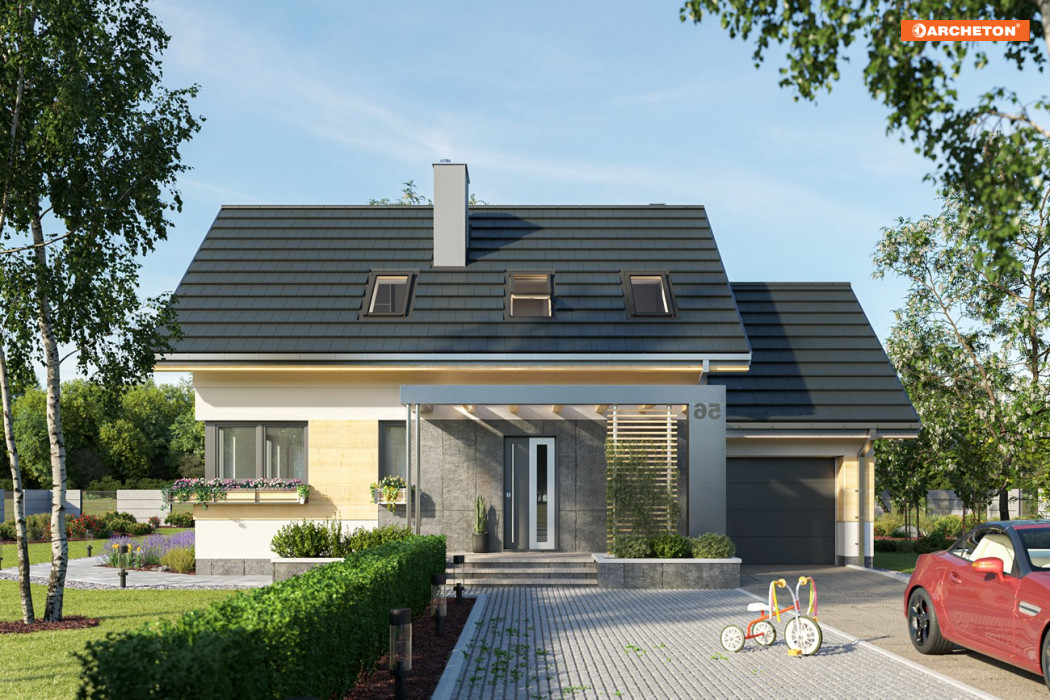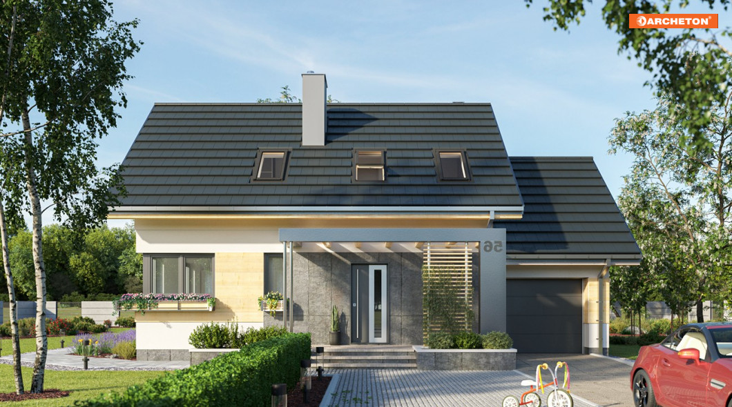 Projekt domu Dino to zwarty, niedrogi budynek z najprostszą dwuspadową konstrukcją dachów. W energooszczędnej bryle pozbawionej balkonów i lukarn urozmaiceniem są: dekoracyjna rama z pergolą nad tarasem wejściowym i pas drewnianej boazerii obejmujący obie części: mieszkalną i garaż. Dla dopełnienia skromnej formy finezyjnie zaprojektowano tarasy i schody. Ujęte w donice z zielenią pozwolą wpisać budynek w warunki terenowe na każdej działce. Zachęcamy do zapoznania się również z inną wersją tego projektu - Dino Sol wyposażonym w podwójne okna dachowe, które są elementem doświetlającym w aranżacji poddasza.